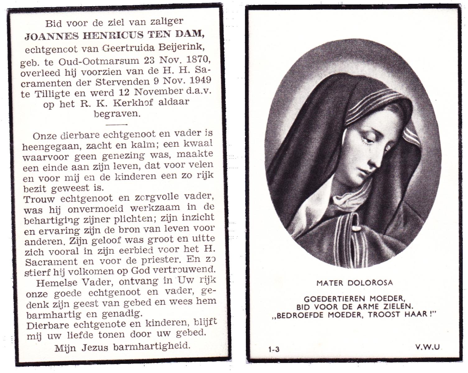 DAM, ten, Joannes Henricus, geboren op 23-11-1870 te Oud Ootmarsum, overleden op 9-11-1949 te Tilligte op 78-jarige leeftijd, begraven op 12-11-1949 te Tilligte.