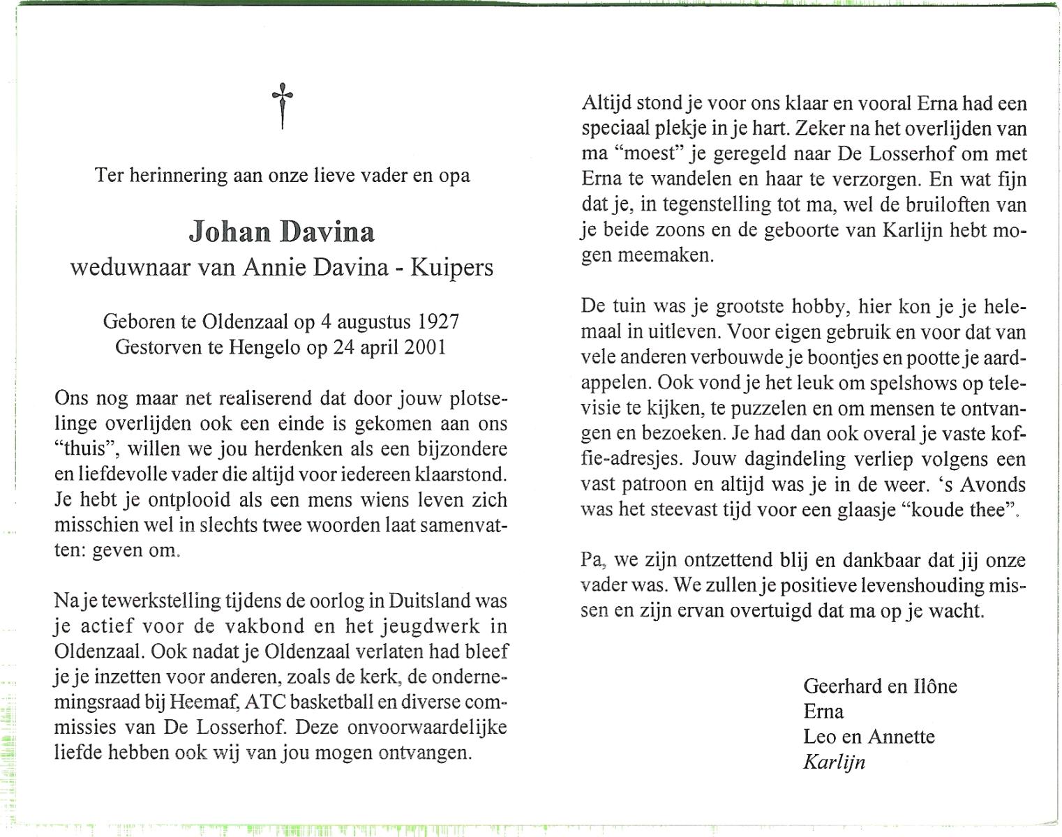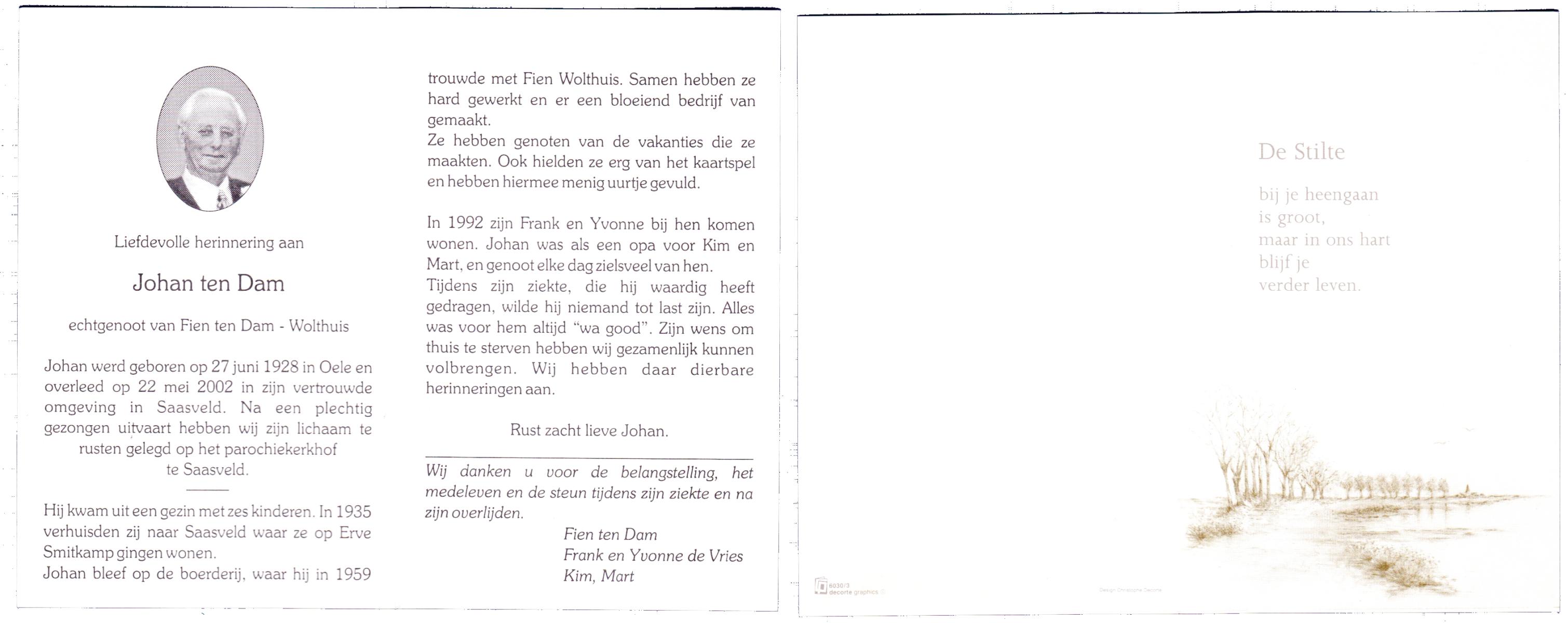 DAM, ten, Johan, geboren op 27-6-1928 te Oele, overleden op 22-5-2002 te Saasveld op 73-jarige leeftijd, begraven te Saasveld.