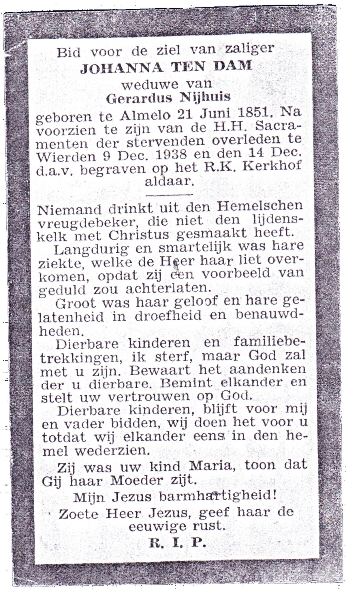 DAM, ten, Johanna, geboren op 21-06-1851 te Almelo, overleden op 9-12-1938 te Wierden op 88-jarige leeftijd, begraven op 14-12-1938 te Wierden.