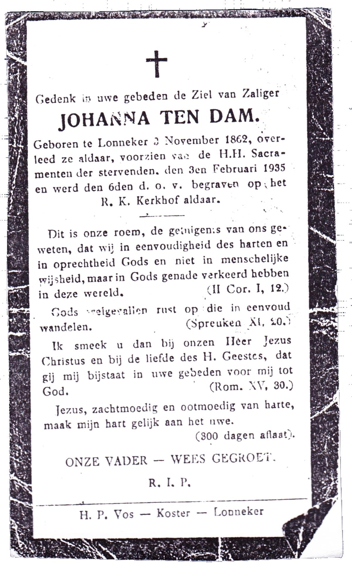 DAM, ten, Johanna, geboren op 03-11-1862 te Lonneker, overleden op 3-2-1935 te Lonneker op 72-jarige leeftijd, begraven op 6-2-1935 te Lonneker.