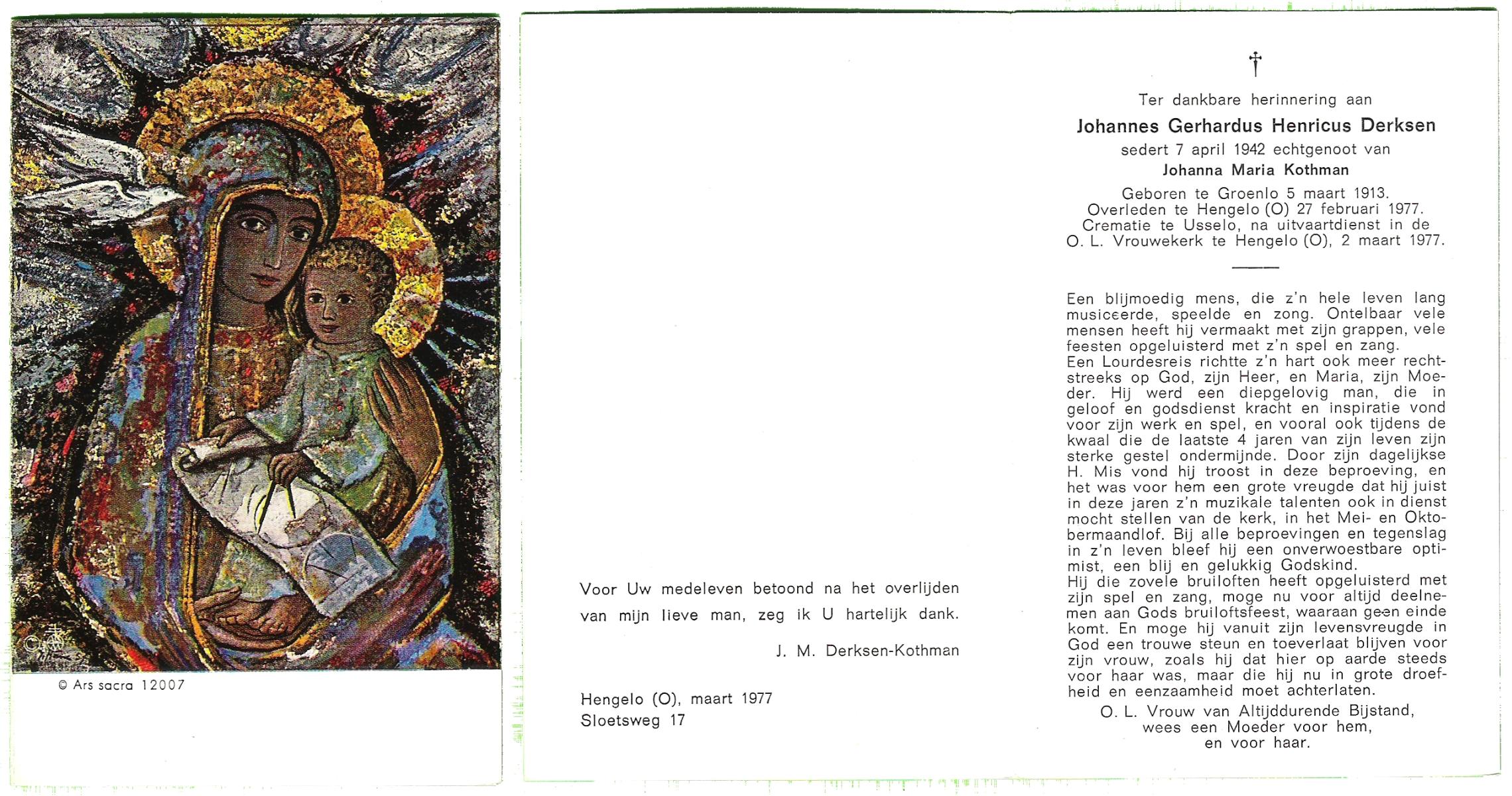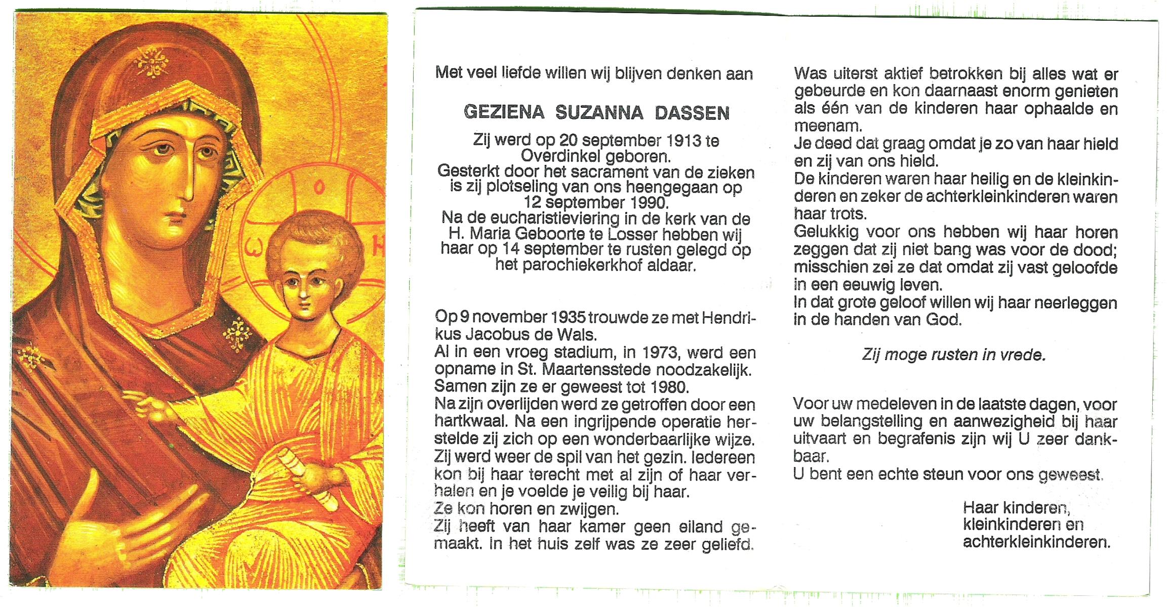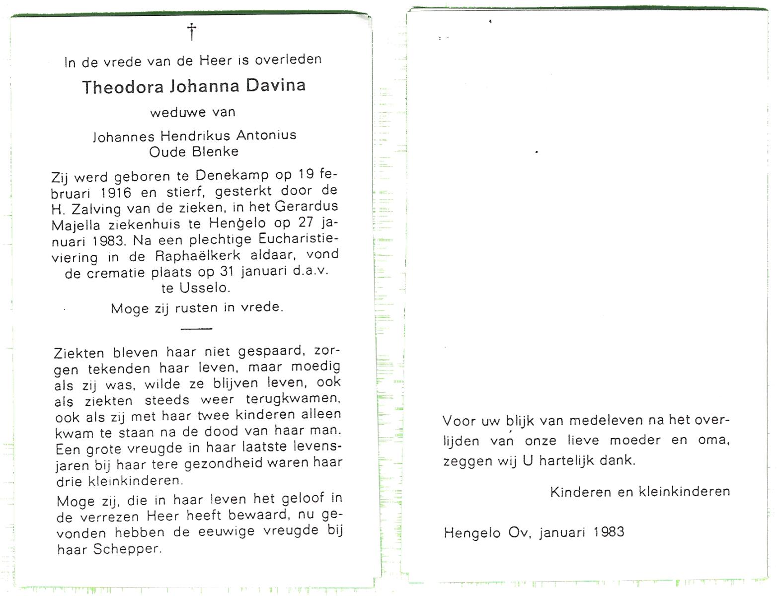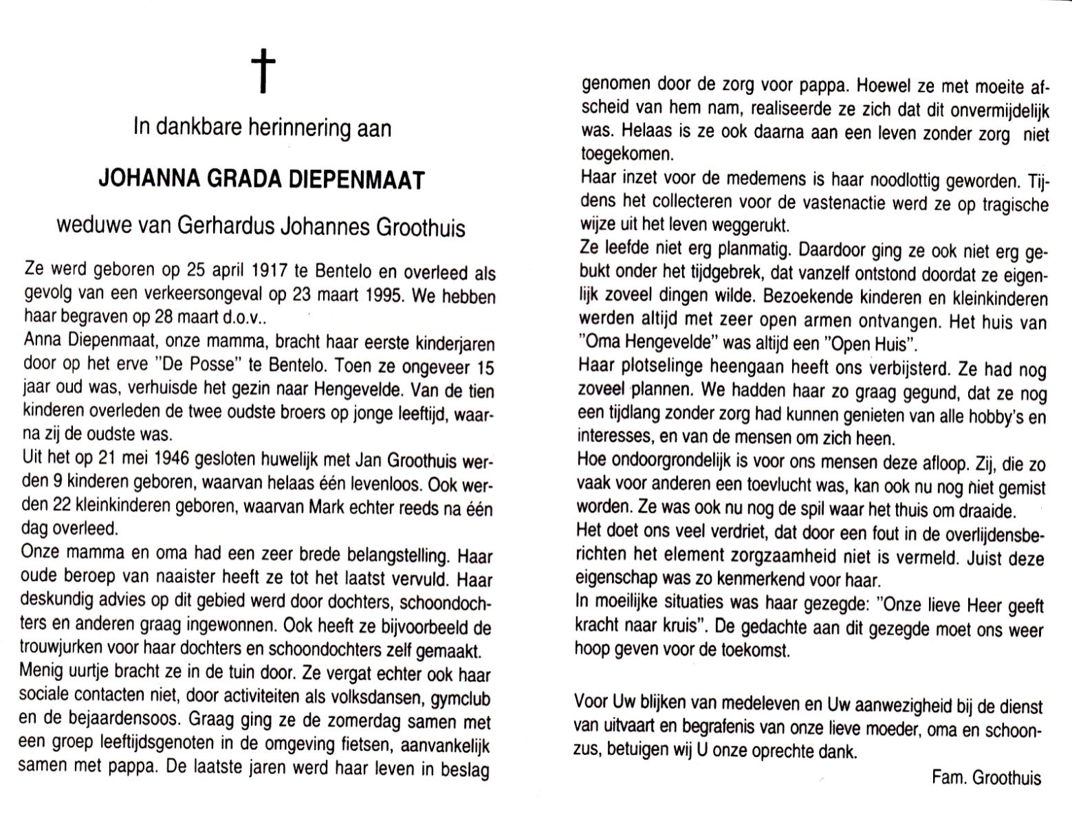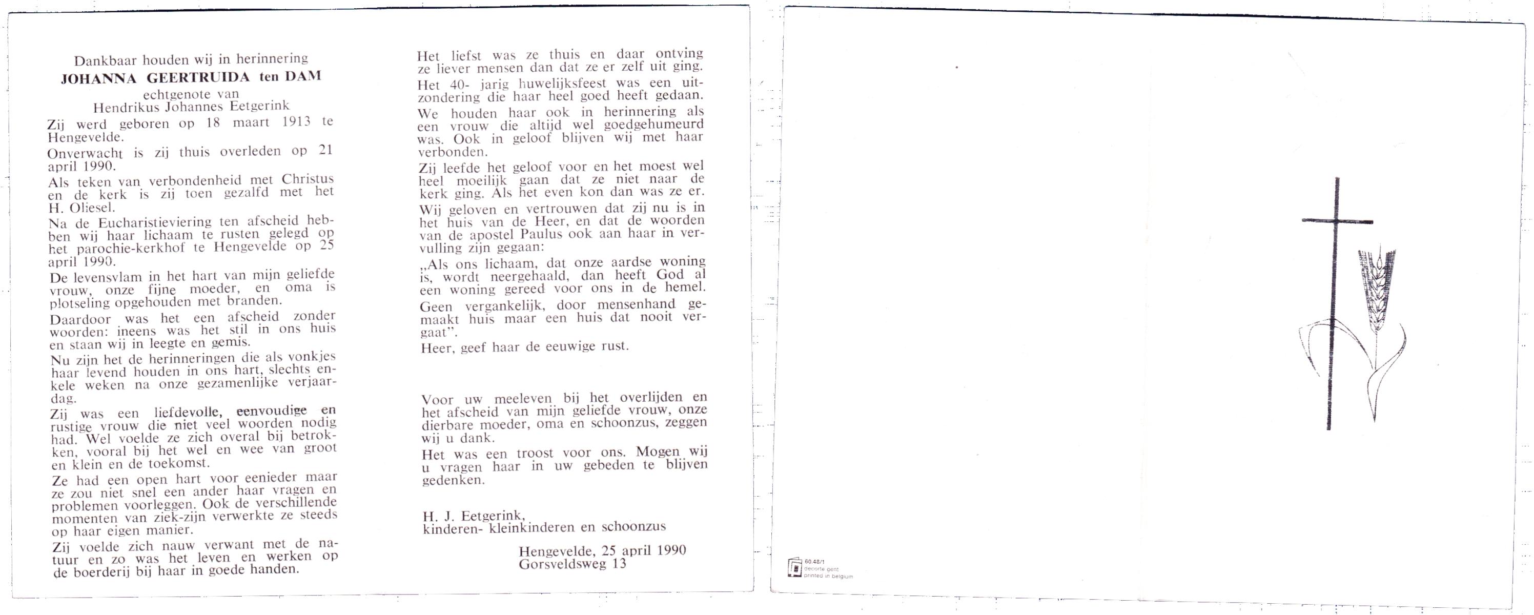 DAM, ten, Johanna Geertruida, geboren op 18-3-1913 te Hengevelde, overleden op 21-4-1990 te Hengevelde op 77-jarige leeftijd, begraven op 25-4-1990 te Hengevelde.