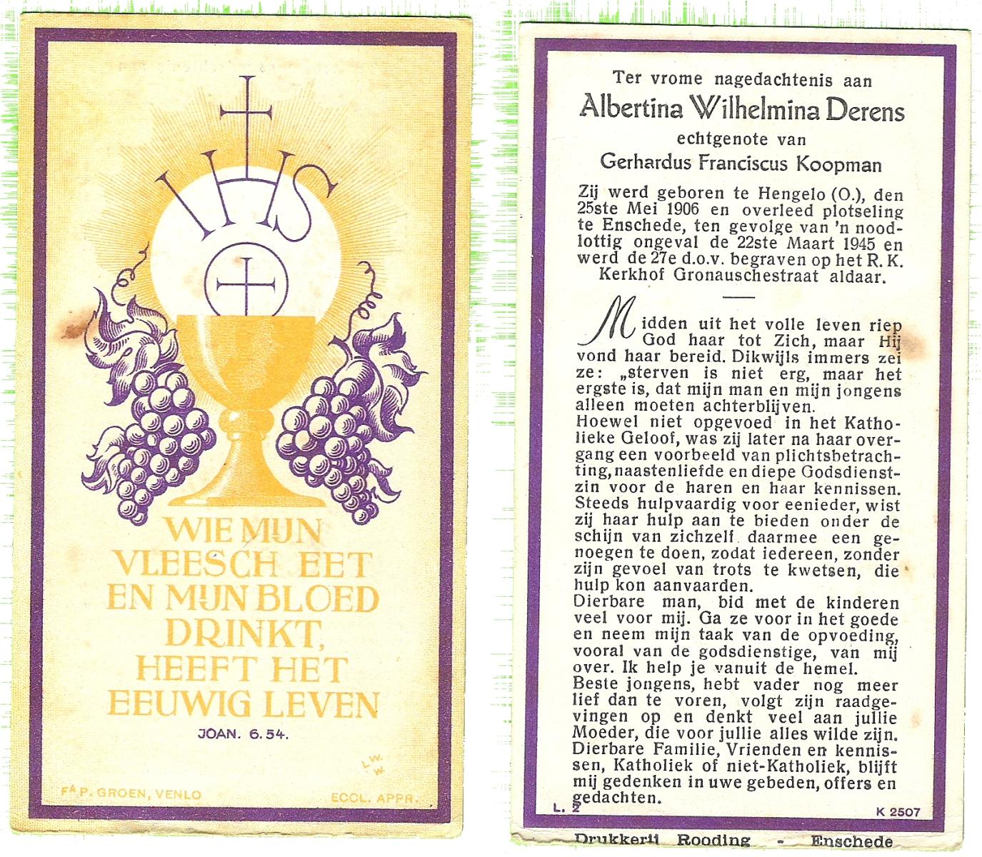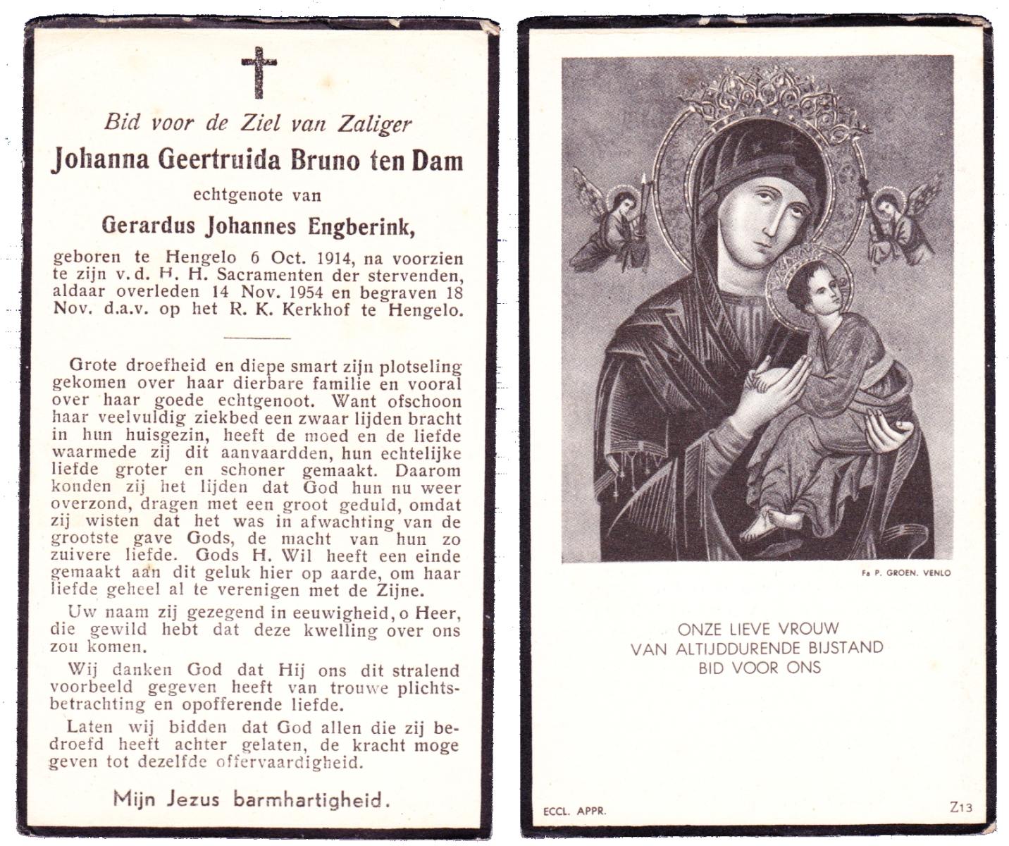 DAM, ten, Johanna Geertruida Bruno, geboren op 6-10-1914 te Hengelo (O), overleden op 14-11-1954 te Hengelo (Ov.) op 40-jarige leeftijd, begraven op 18-11-1954 te Hengelo (Ov.).