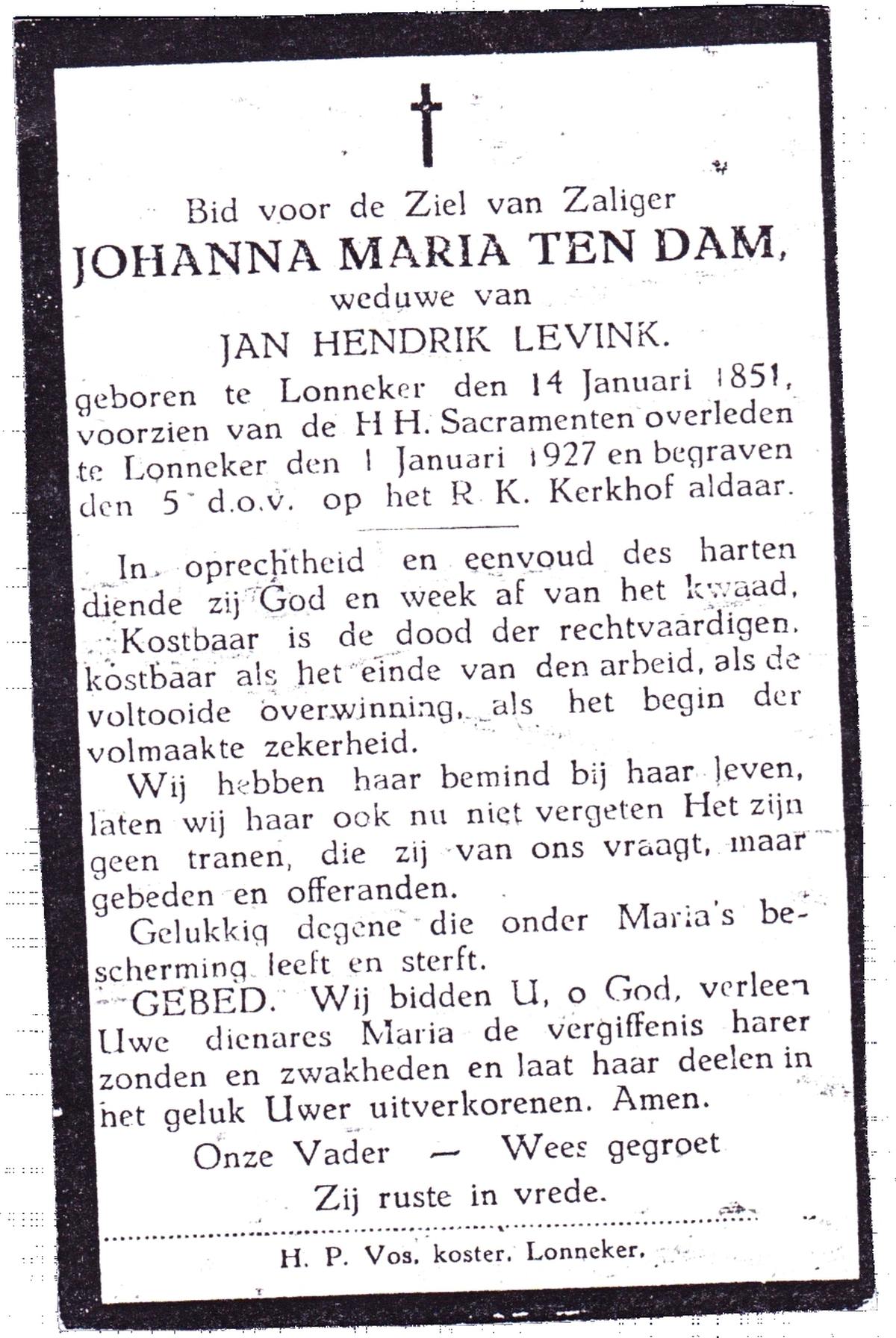 DAM, Ten, Johanna Maria, geboren op 14-01-1851 te Lonneker, overleden op 1-1-1927 te Lonneker op 75-jarige leeftijd, begraven op 5-1-1927 te Lonneker.