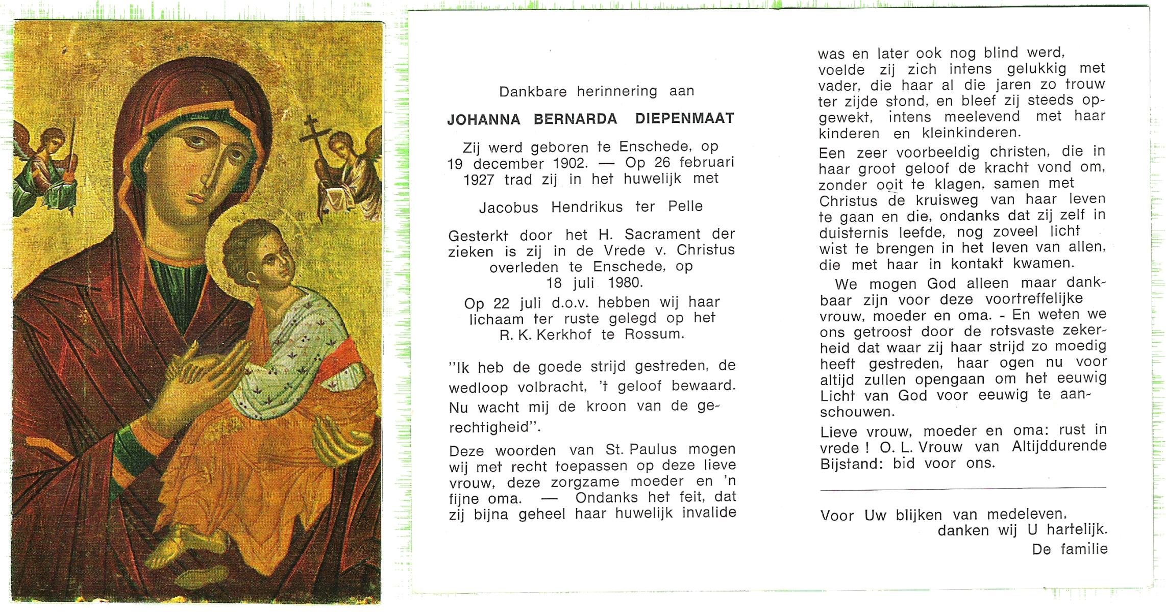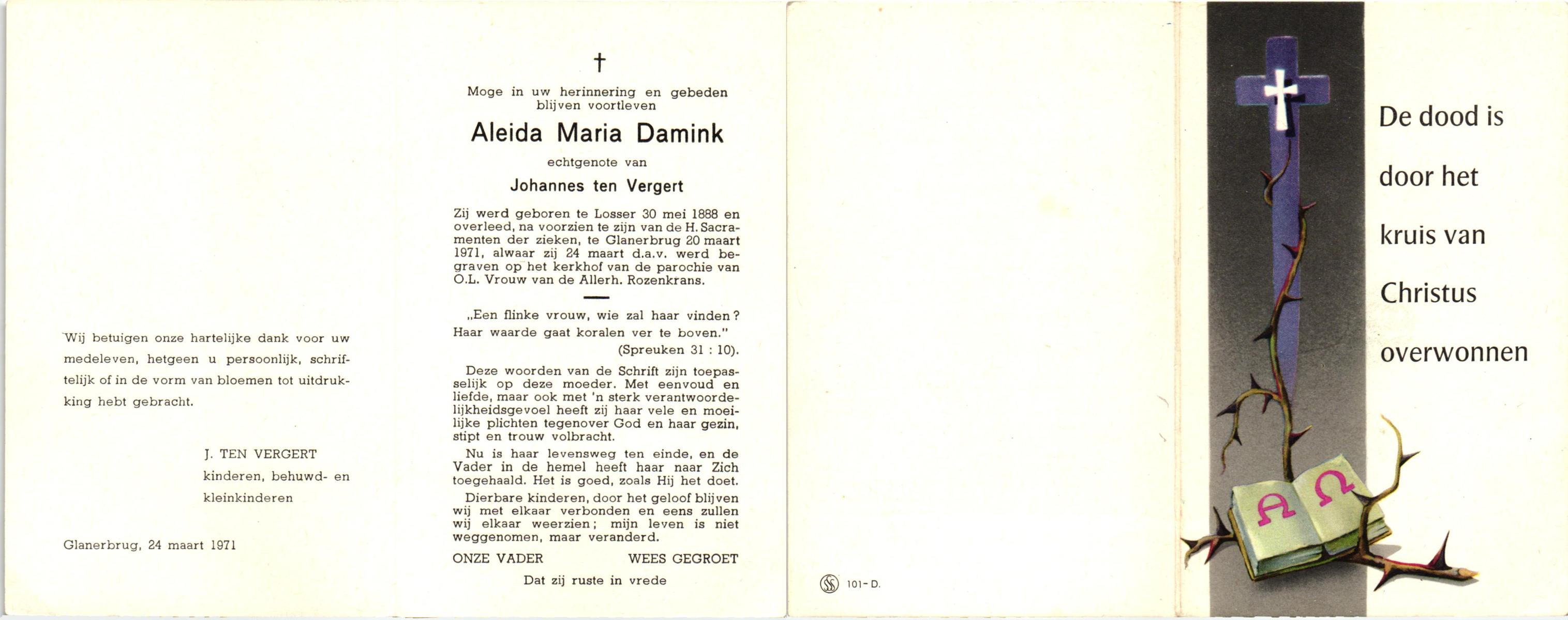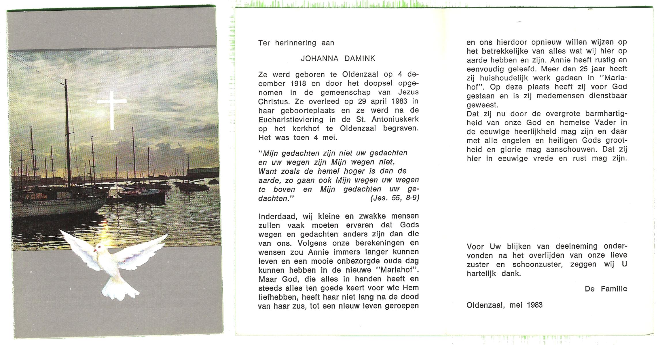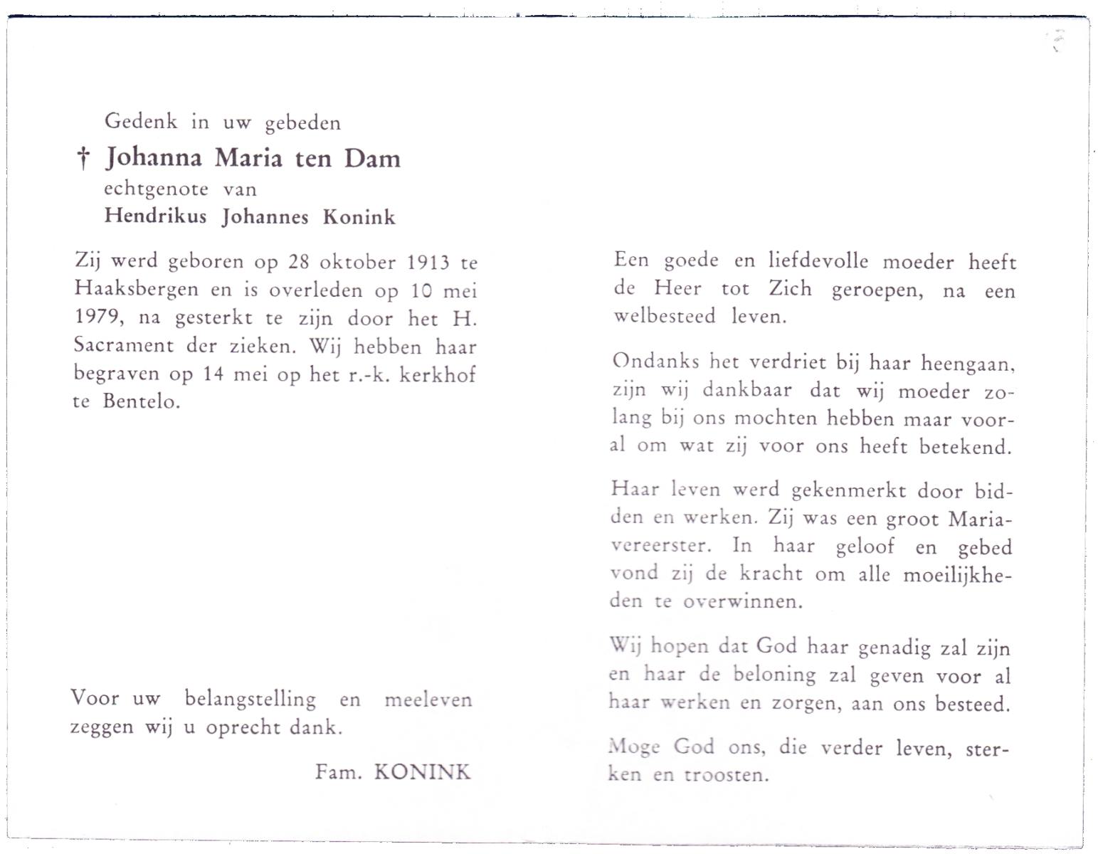 DAM, ten, Johanna Maria, geboren op 28-10-1913 te Haaksbergen, overleden op 10-5-1979 te Bentelo op 66-jarige leeftijd, begraven op 14-5-1979 te Bentelo.