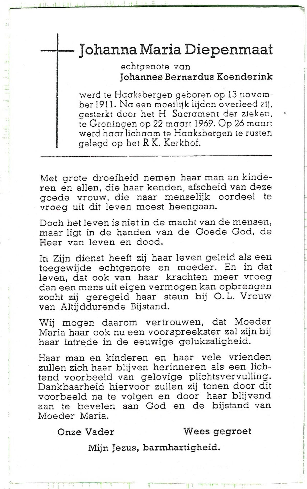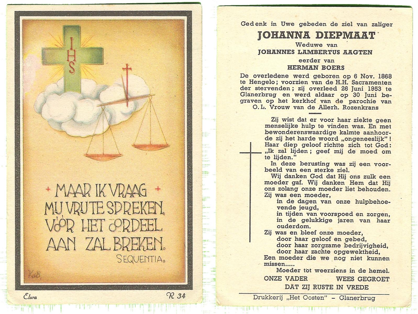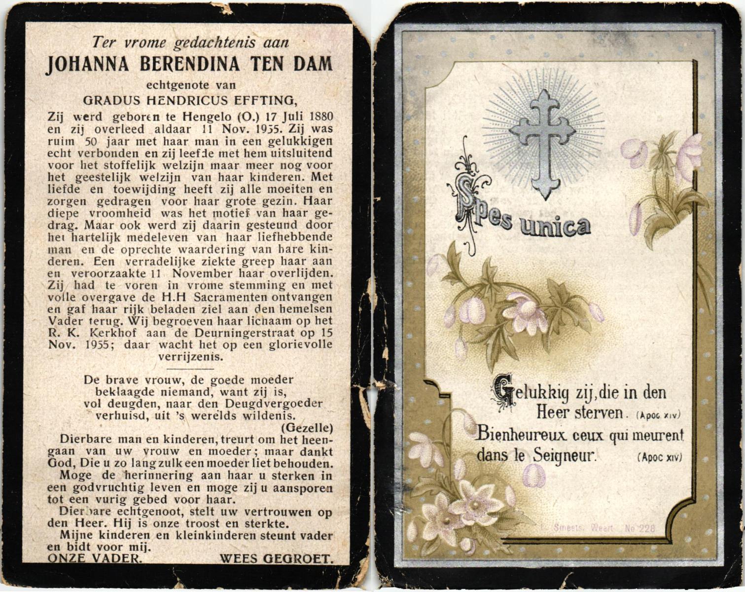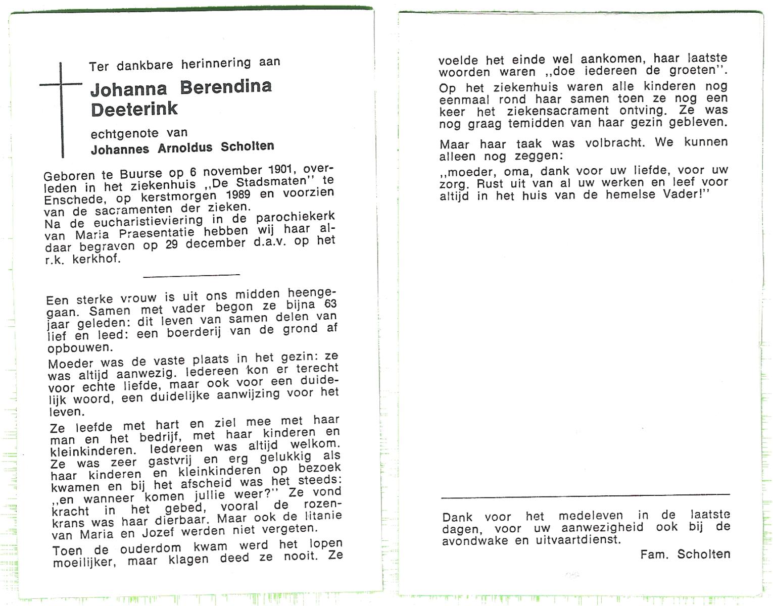 DAM, ten, Johanna Maria, geboren op 28-10-1913 te Haaksbergen, overleden op 10-5-1979 te Bentelo op 66-jarige leeftijd, begraven op 14-5-1979 te Bentelo.