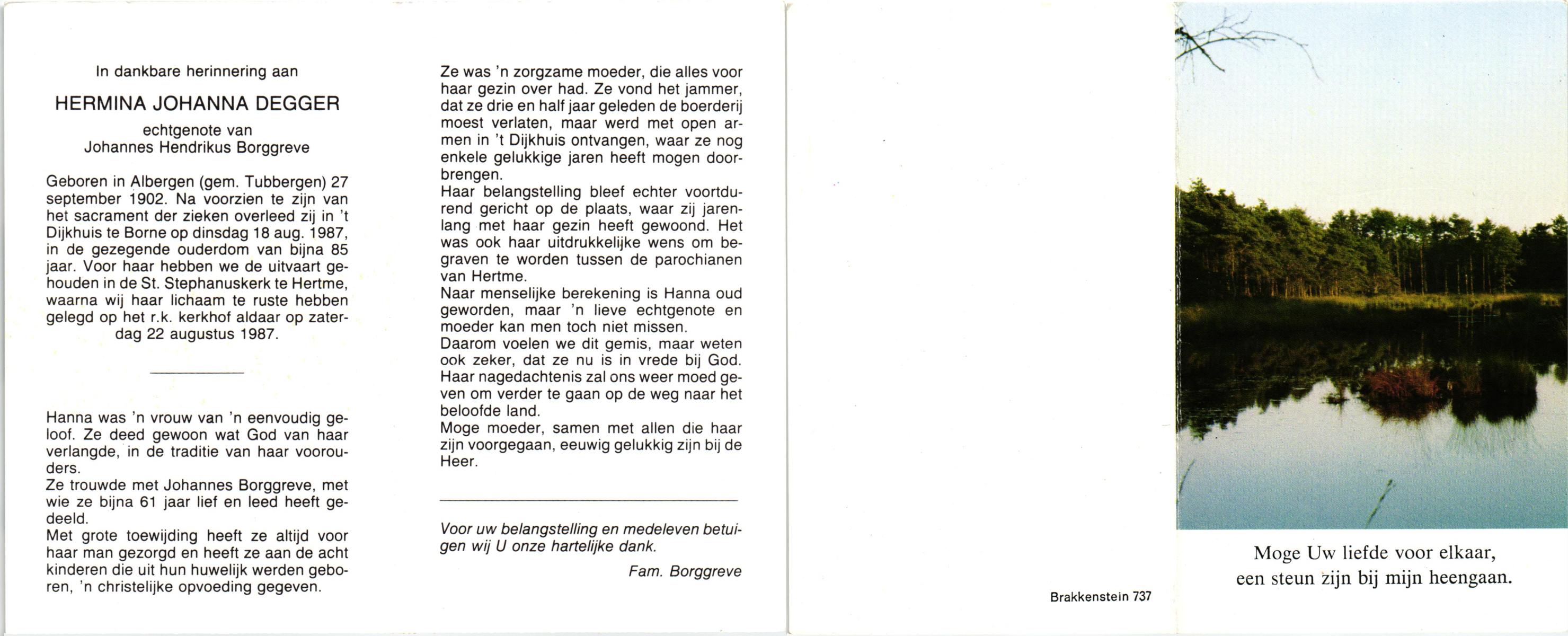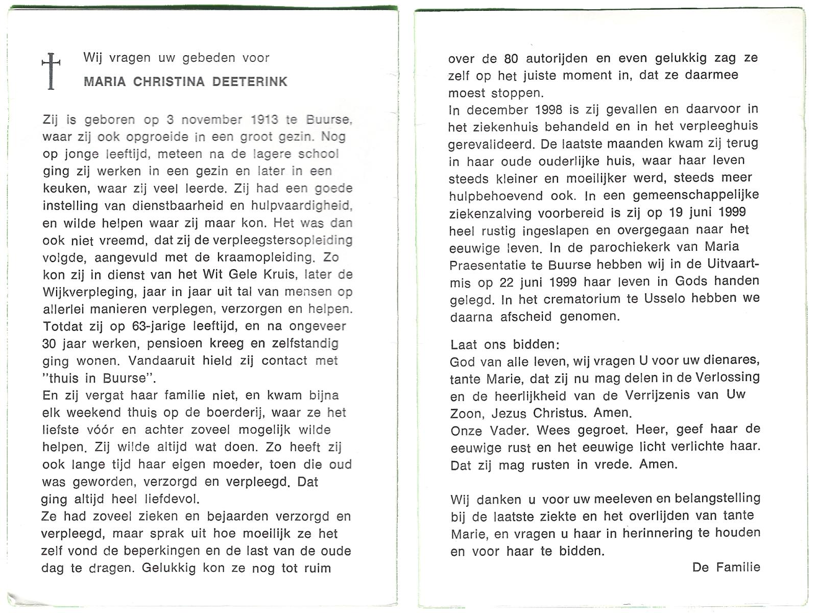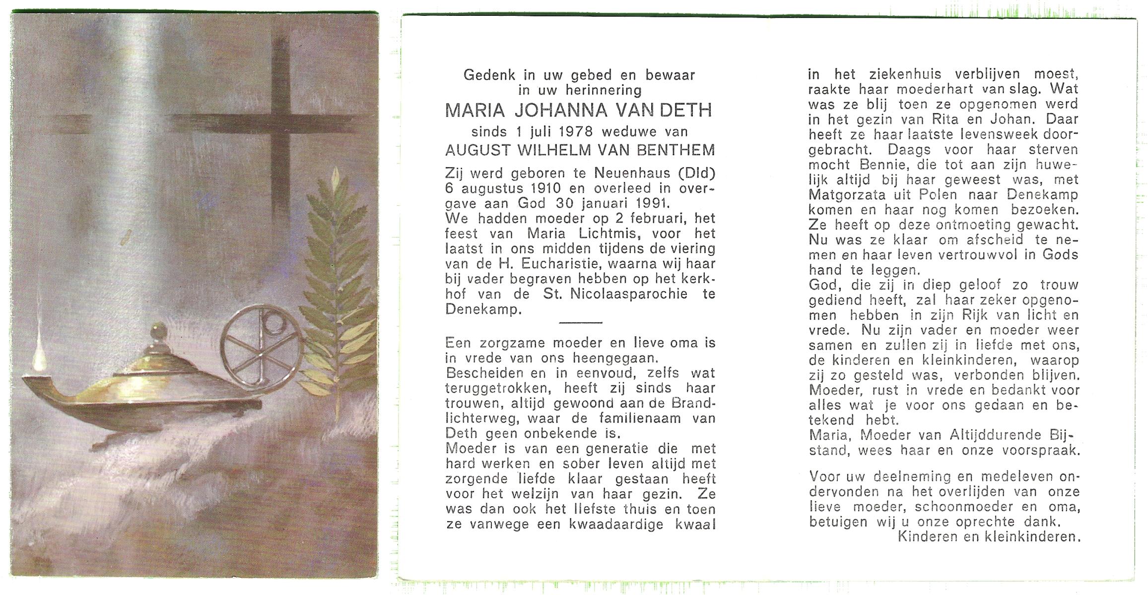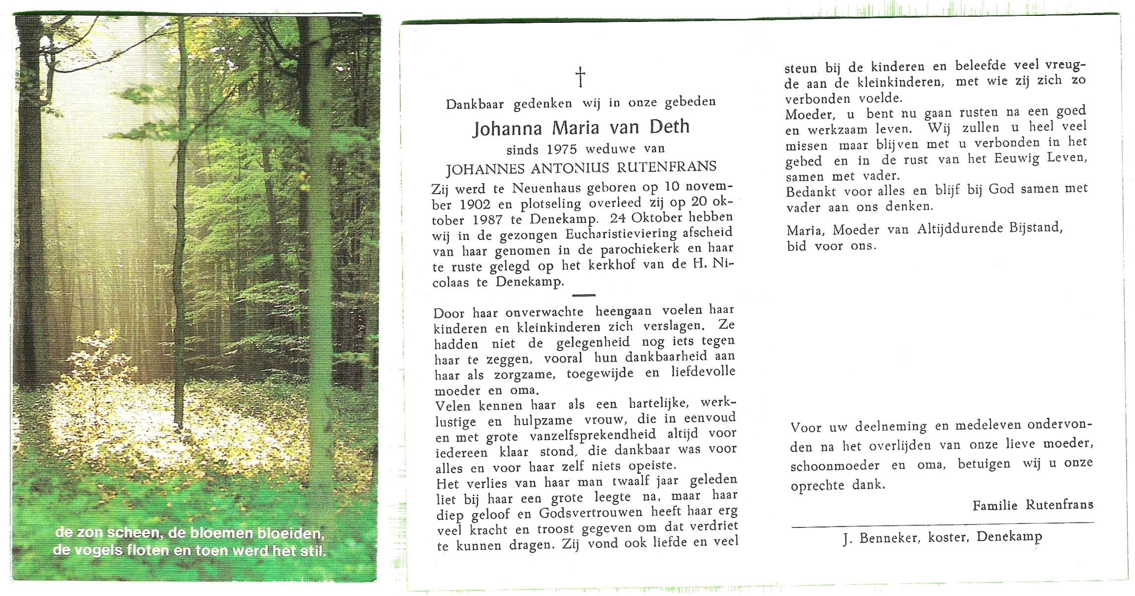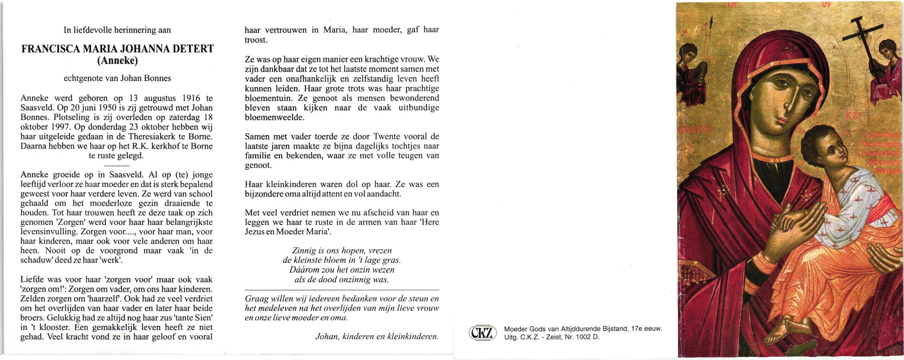 DAM, ten, Johanna Maria, geboren op 28-10-1913 te Haaksbergen, overleden op 10-5-1979 te Bentelo op 66-jarige leeftijd, begraven op 14-5-1979 te Bentelo.