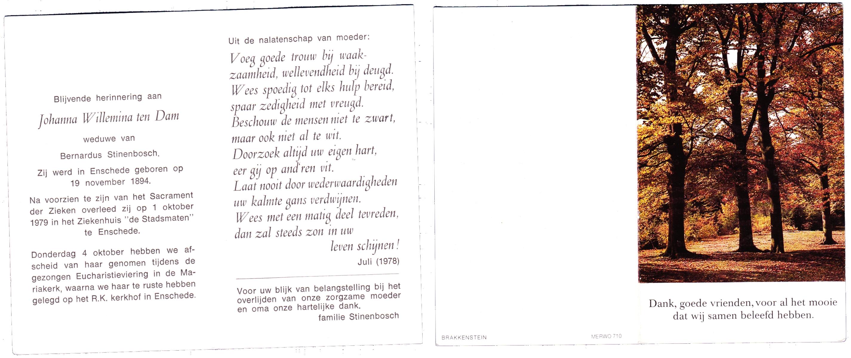 DAM, ten, Johanna Willemina, geboren op 19-11-1894 te Enschede, overleden op 1-10-1979 te Enschede op 84-jarige leeftijd, begraven op 4-10-1979 te Enschede.