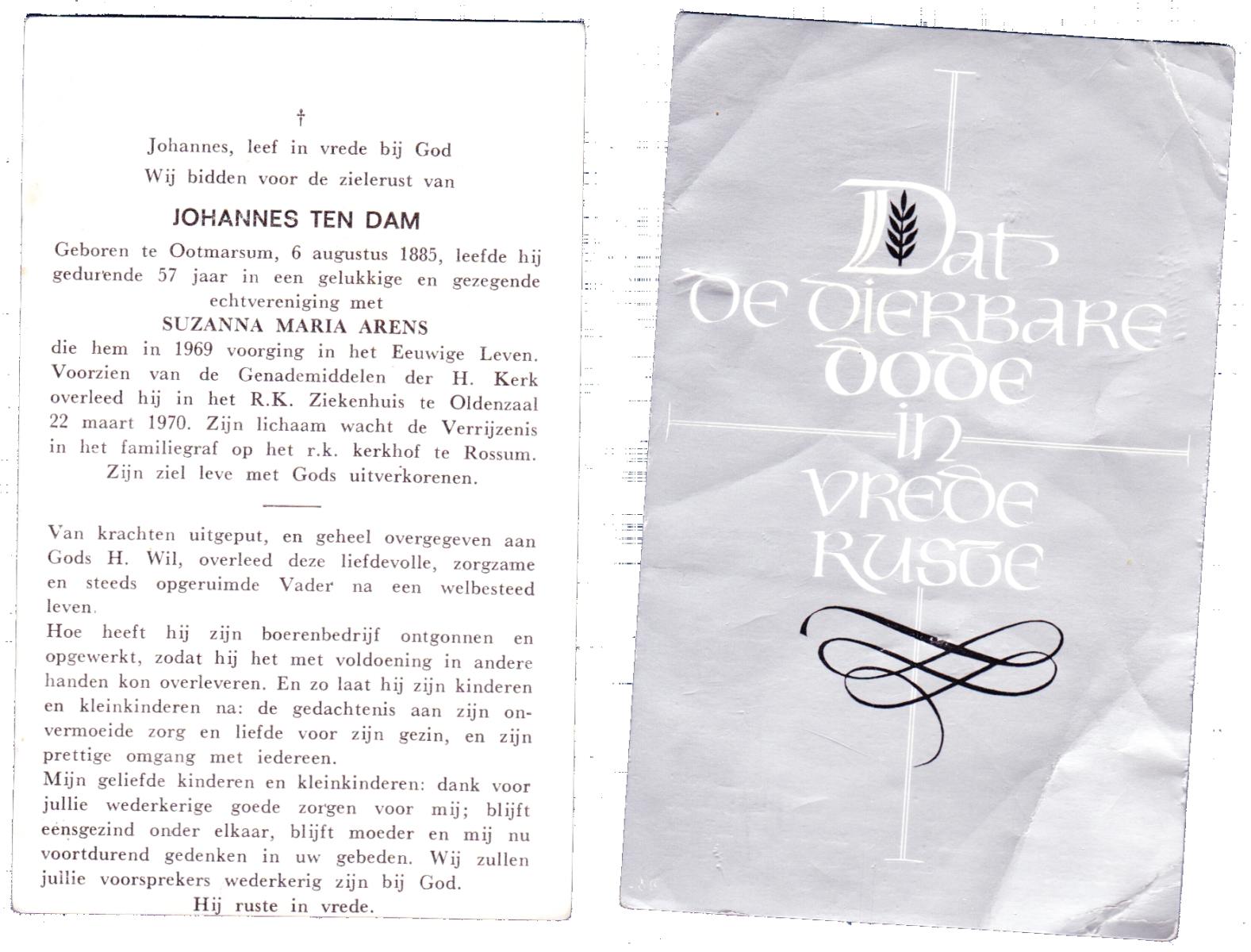 DAM, ten, Johannes, geboren op 06-08-1885 te Ootmarsum, overleden op 22-3-1970 te Oldenzaal op 84-jarige leeftijd, begraven te Rosuum.