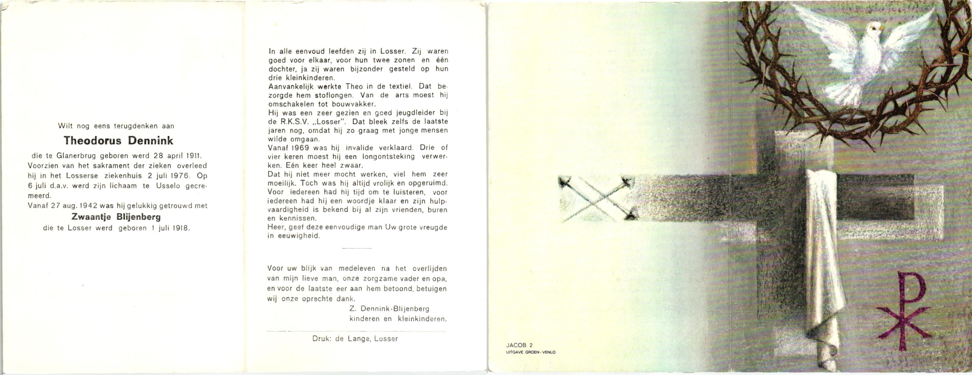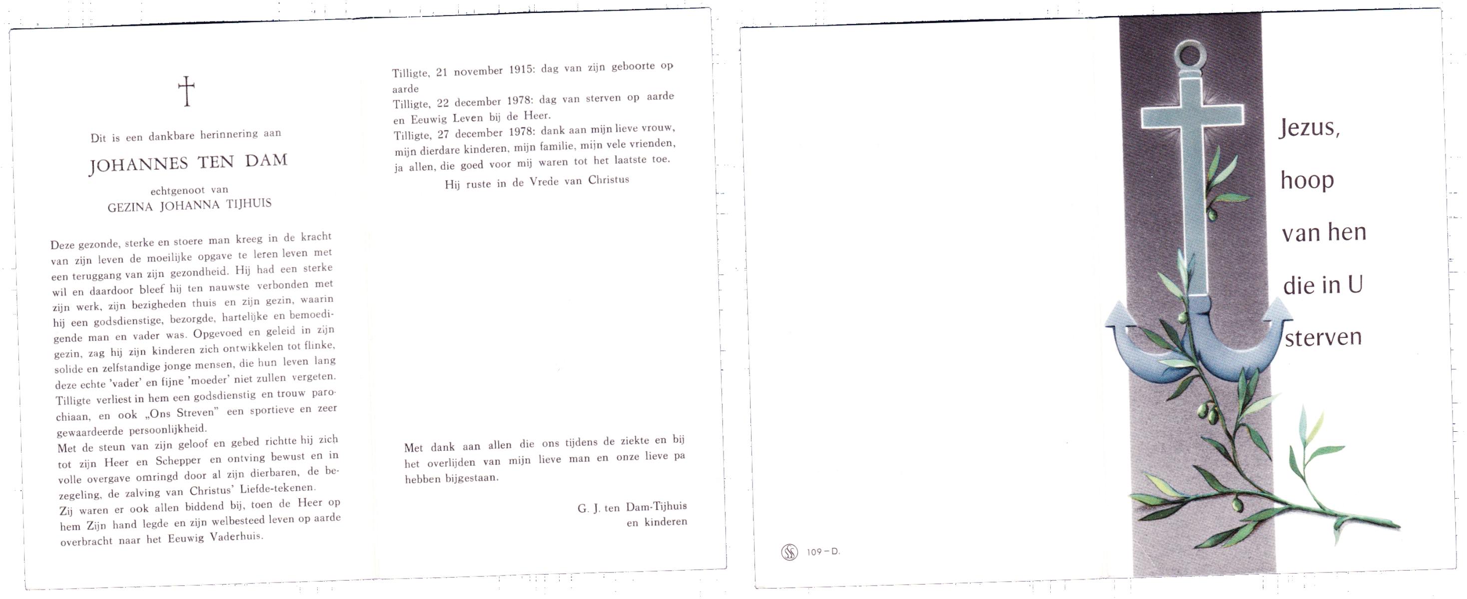 DAM, ten, Johannes, geboren op 21-11-1915 te Tilligte, overleden op 22-12-1978 te Tilligte op 63-jarige leeftijd, begraven op 27-12-1978 te Tilligte.