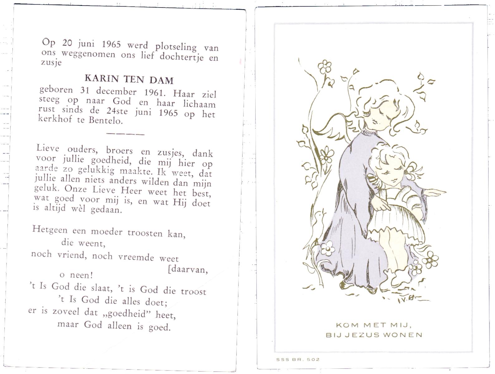 DAM, ten, Karin, geboren op 31-12-1961 te Bentelo, overleden op 20-6-1965 te Bentelo op 3-jarige leeftijd, begraven op 24-6-1965 te Bentelo.