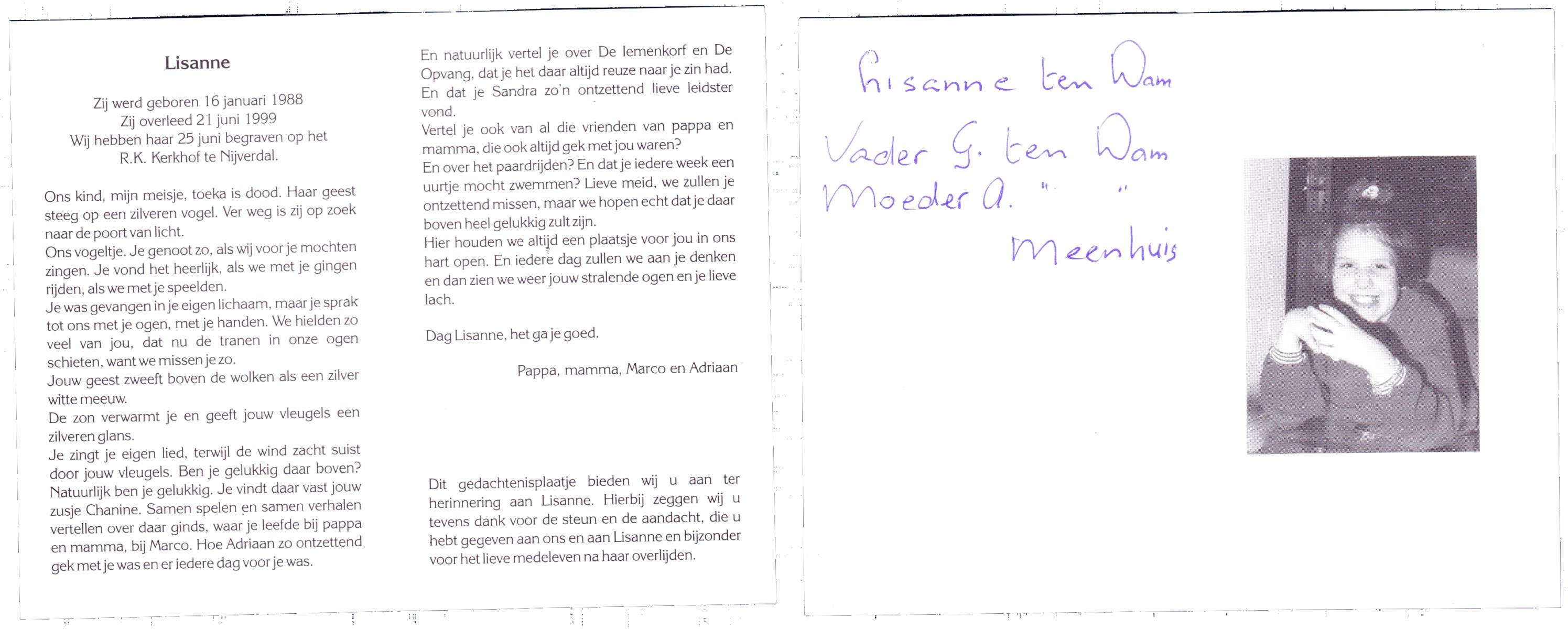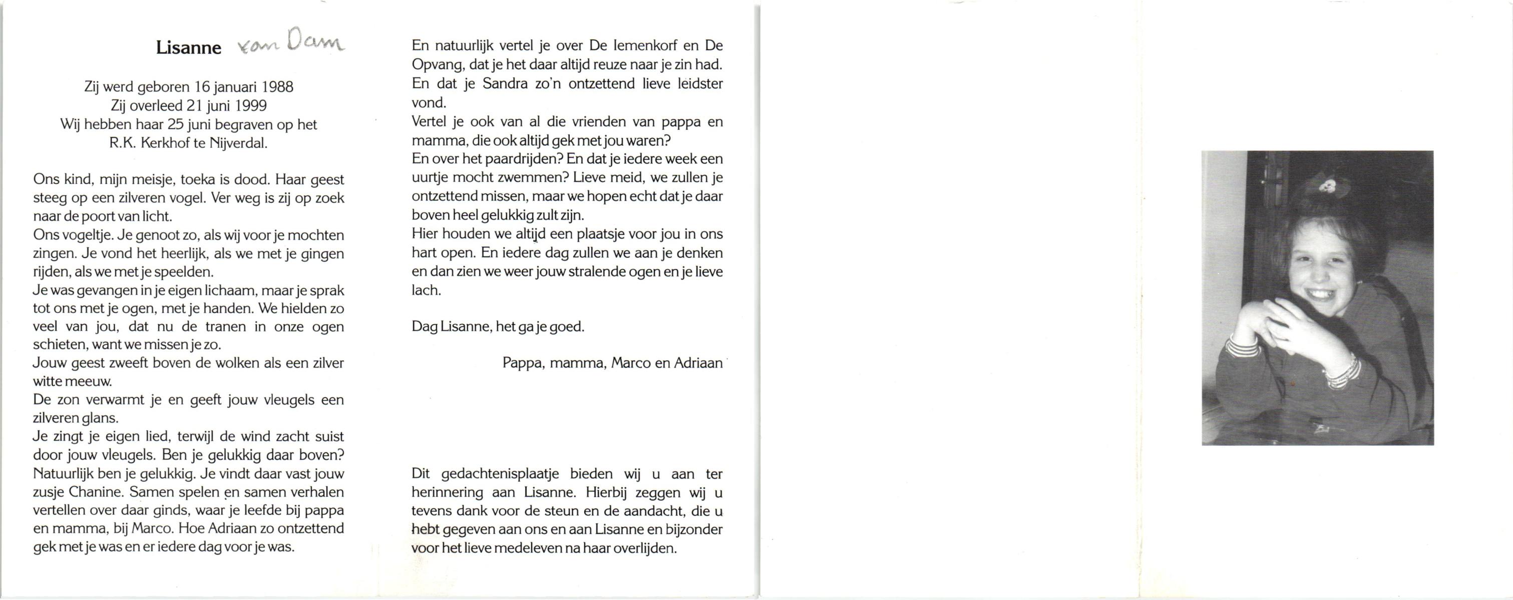 DAM, ten, Lisanne, geboren op 16-1-1988, overleden op 21-6-1999 te Hellendoorn, Nijverdal op 11-jarige leeftijd, begraven op 25-6-1999 te Hellendoorn, Nijverdal.