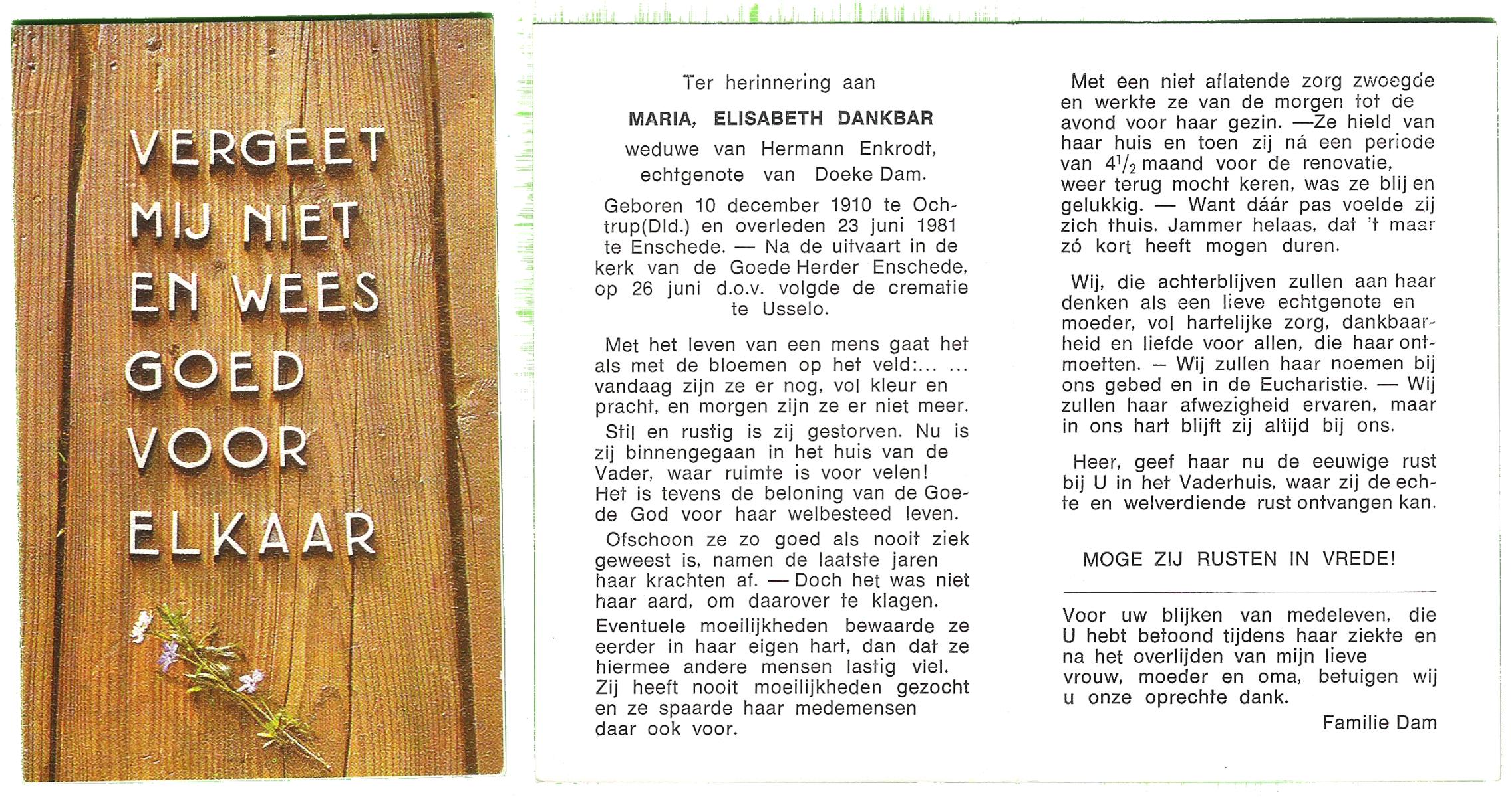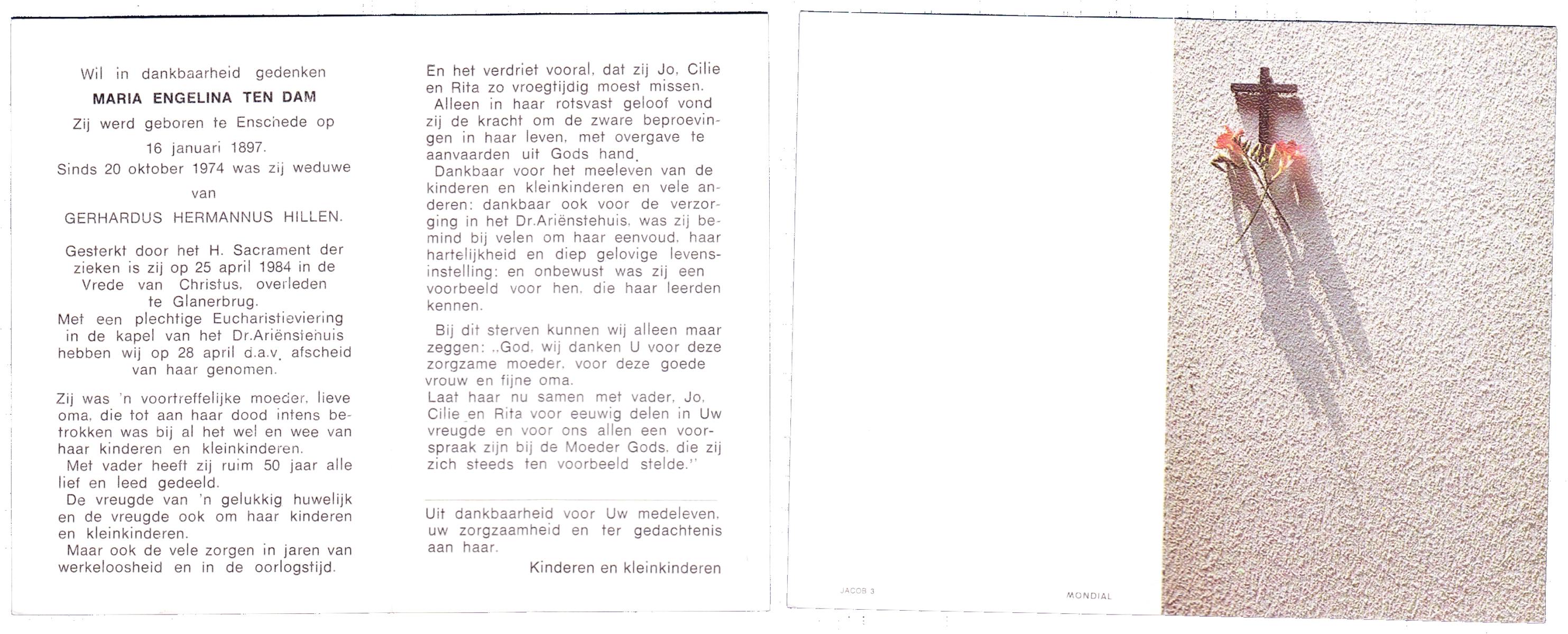 DAM, ten, Maria Engelina, geboren op 16-01-1897 te Enschede, overleden op 25-4-1984 te Glanerbrug op 87-jarige leeftijd.