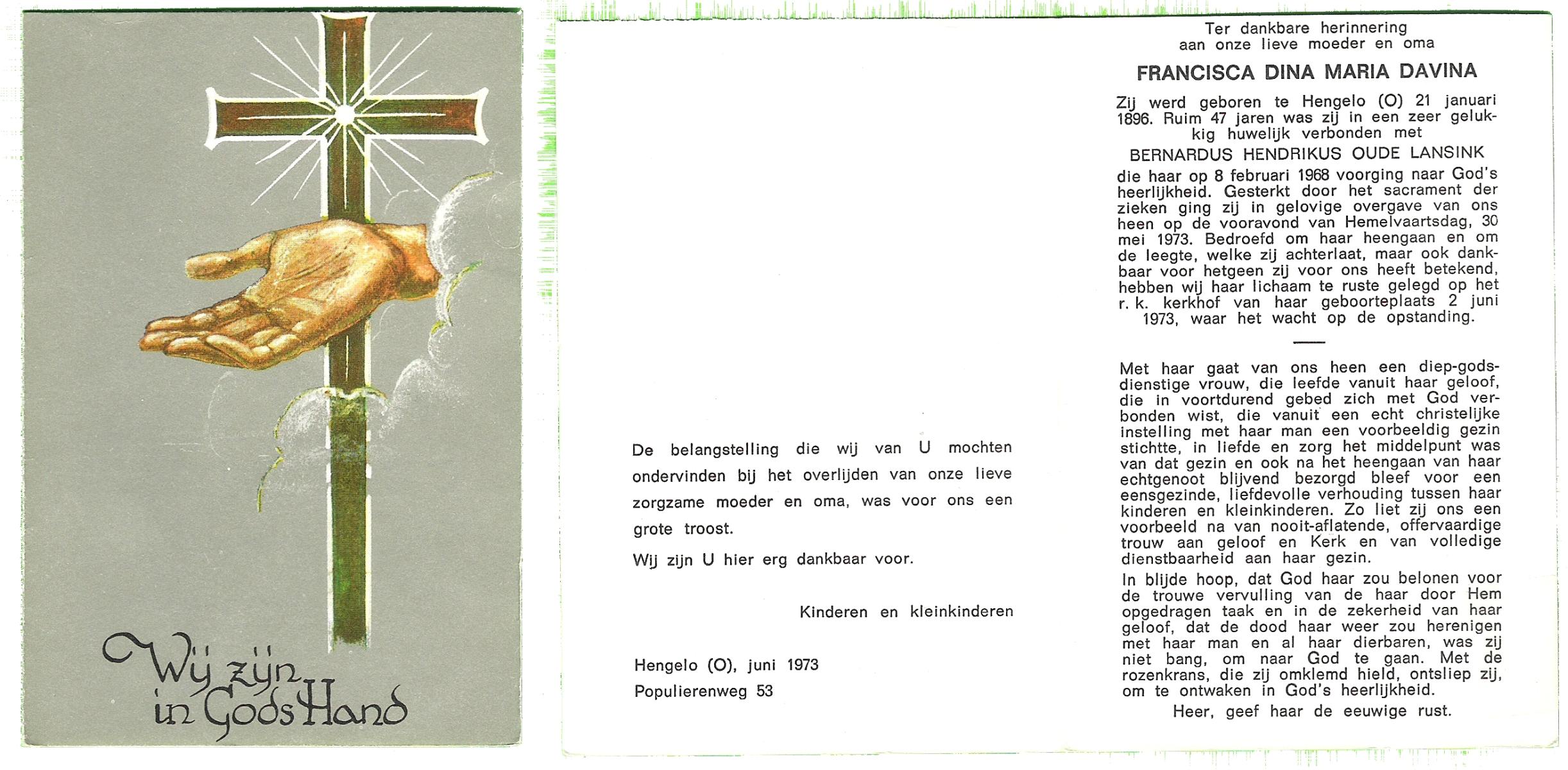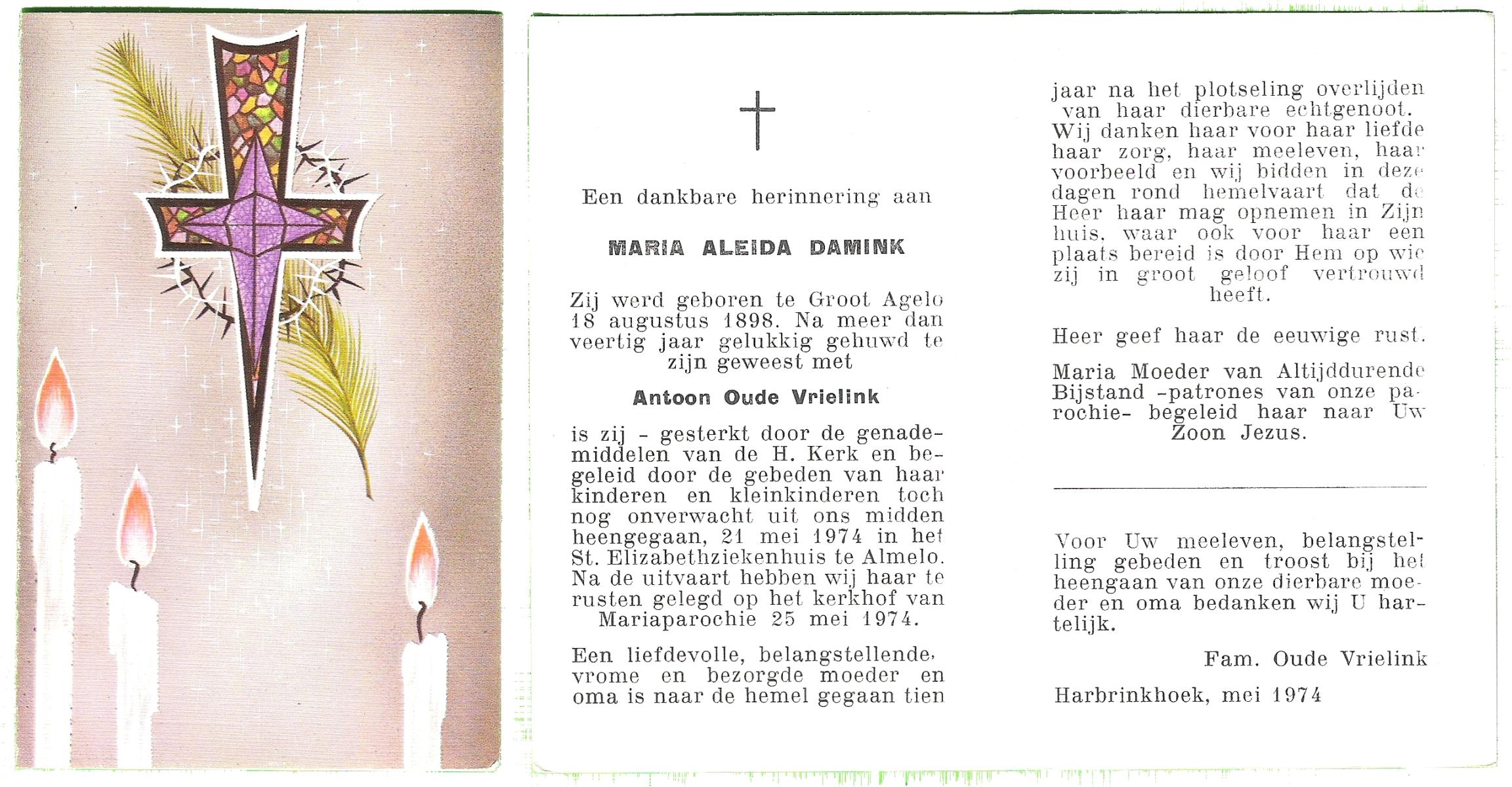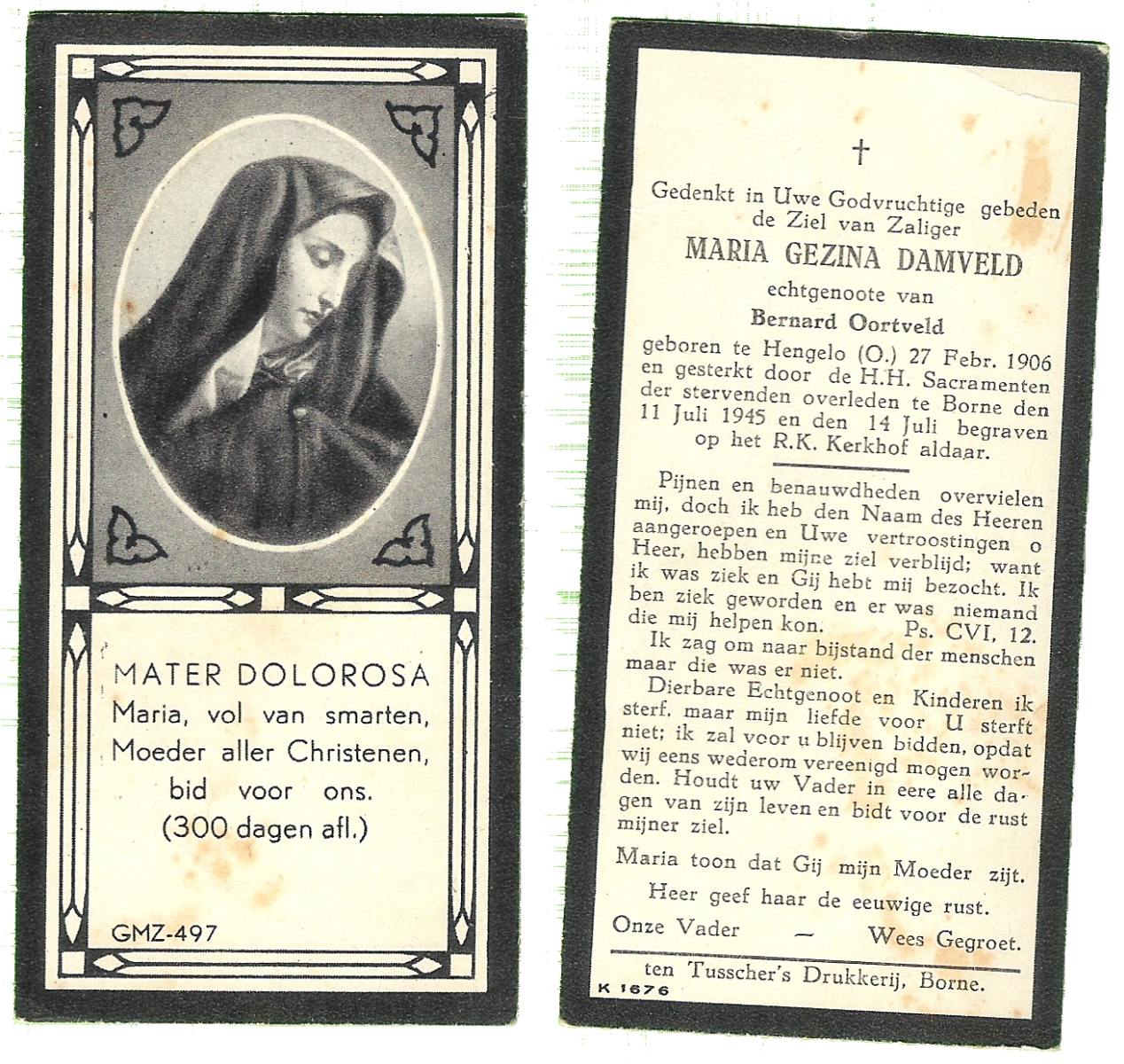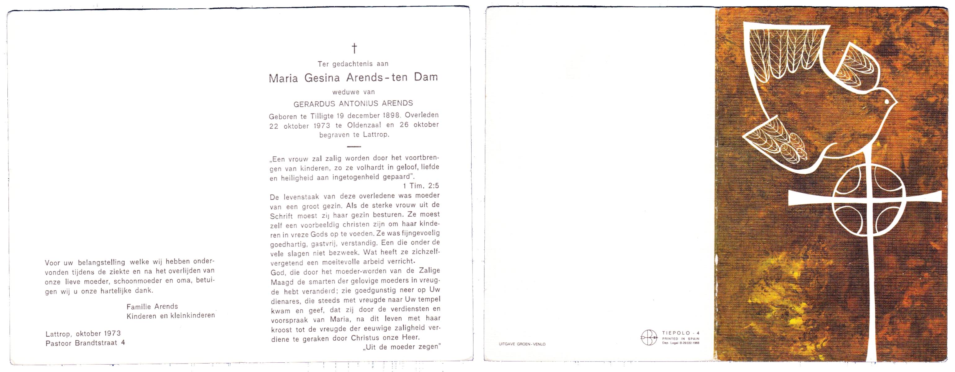 DAM, ten, Maria Gesina, geboren op 19-12-1898 te Tilligte, overleden op 22-10-1973 te Oldenzaal op 74-jarige leeftijd, begraven op 26-10-1973 te Lattrop.