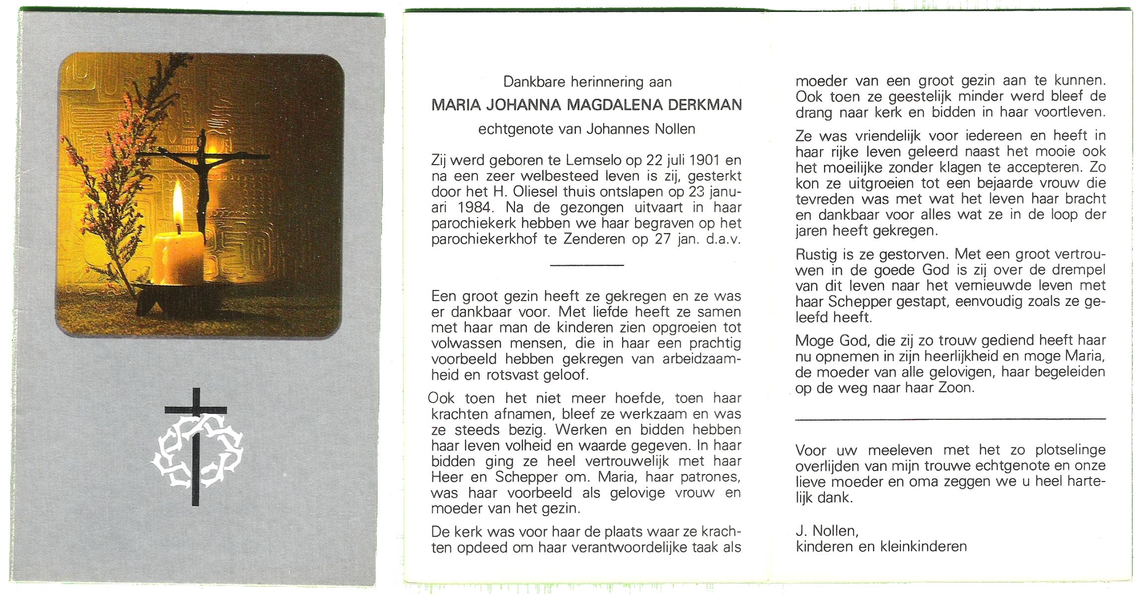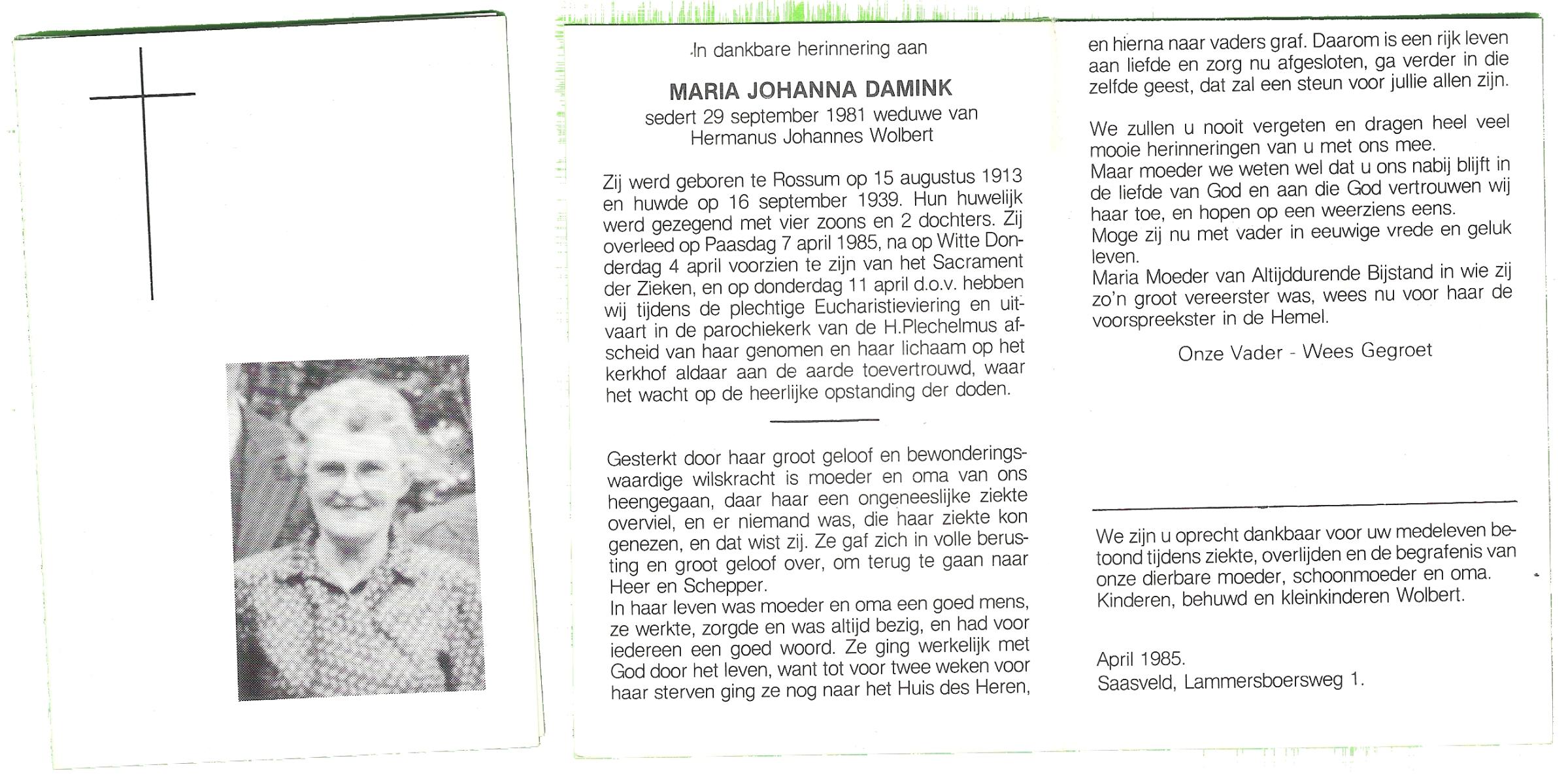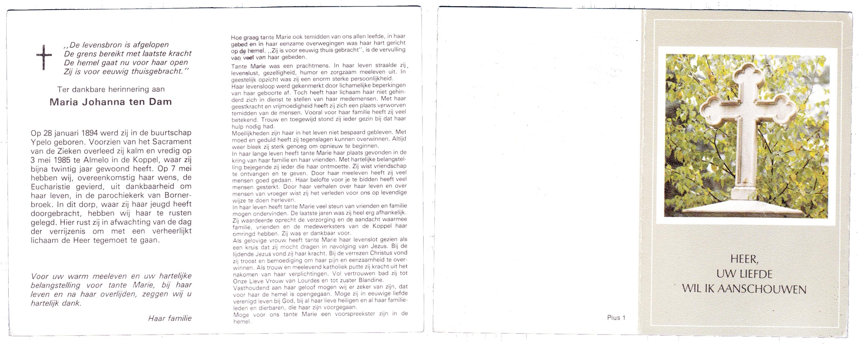DAM, ten, Maria Johanna, geboren op 28-01-1894 te Ypelo, overleden op 3-5-1985 te Almelo op 91-jarige leeftijd, begraven op 7-5-1985 te Bornerbroek.