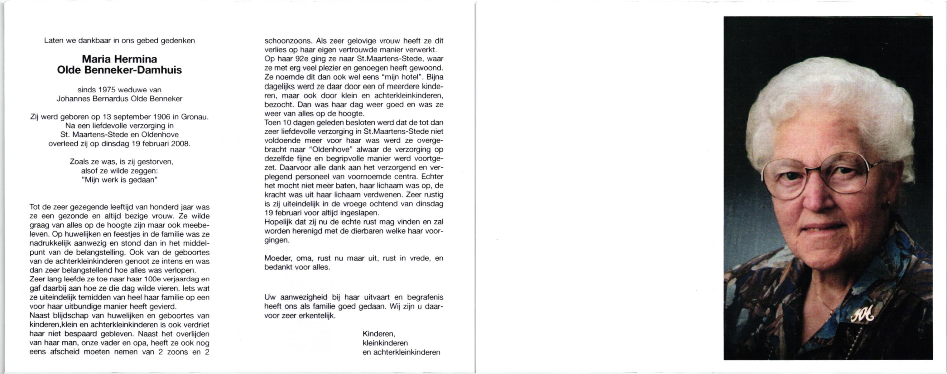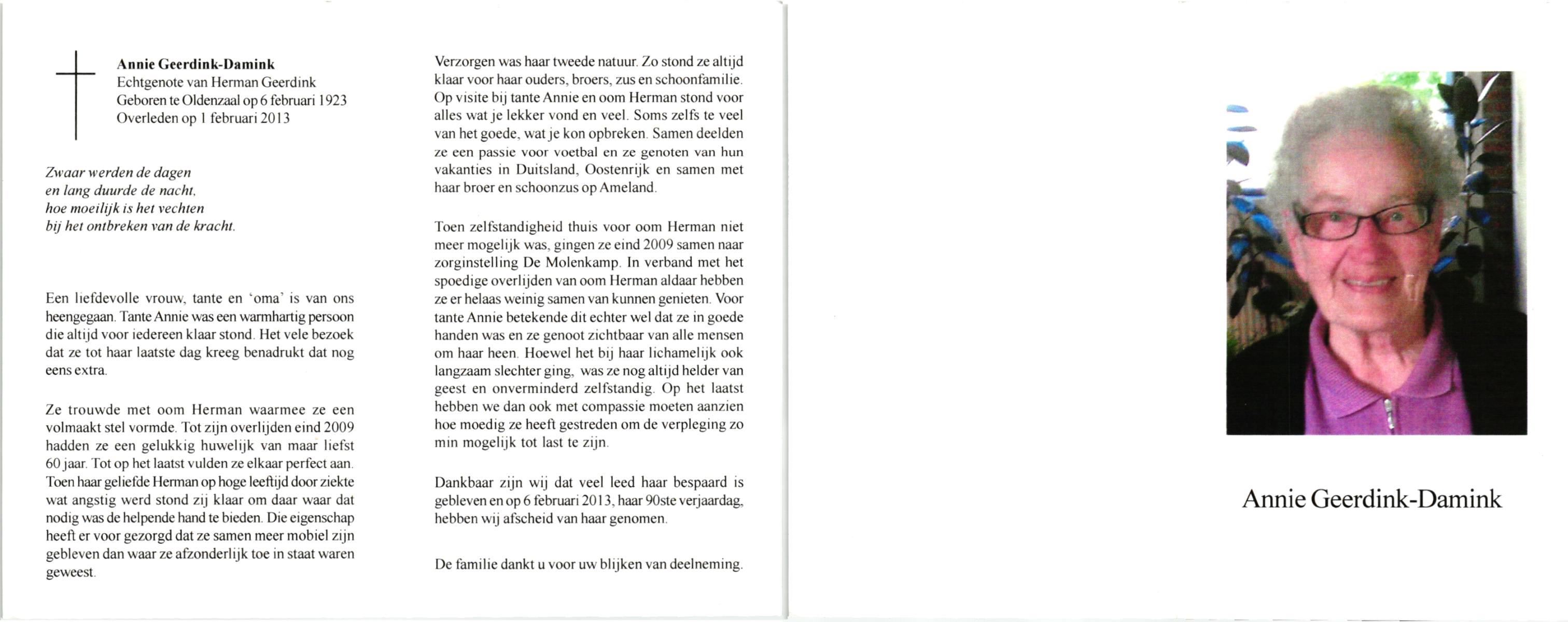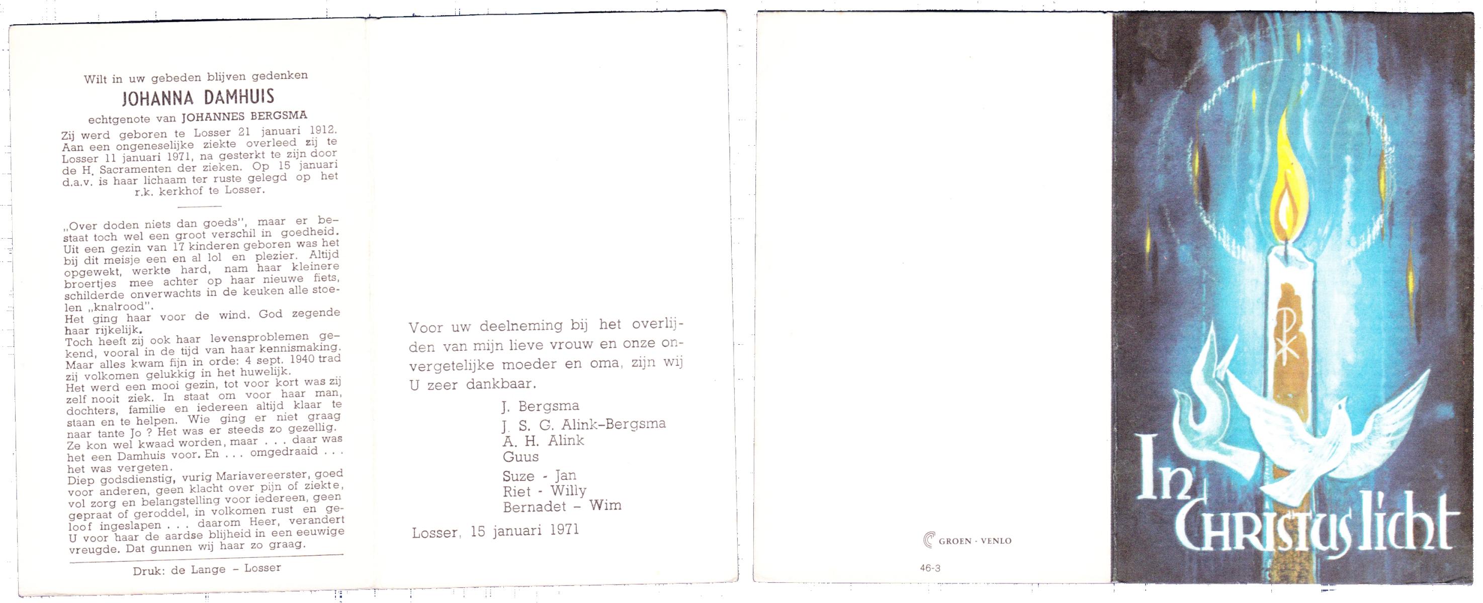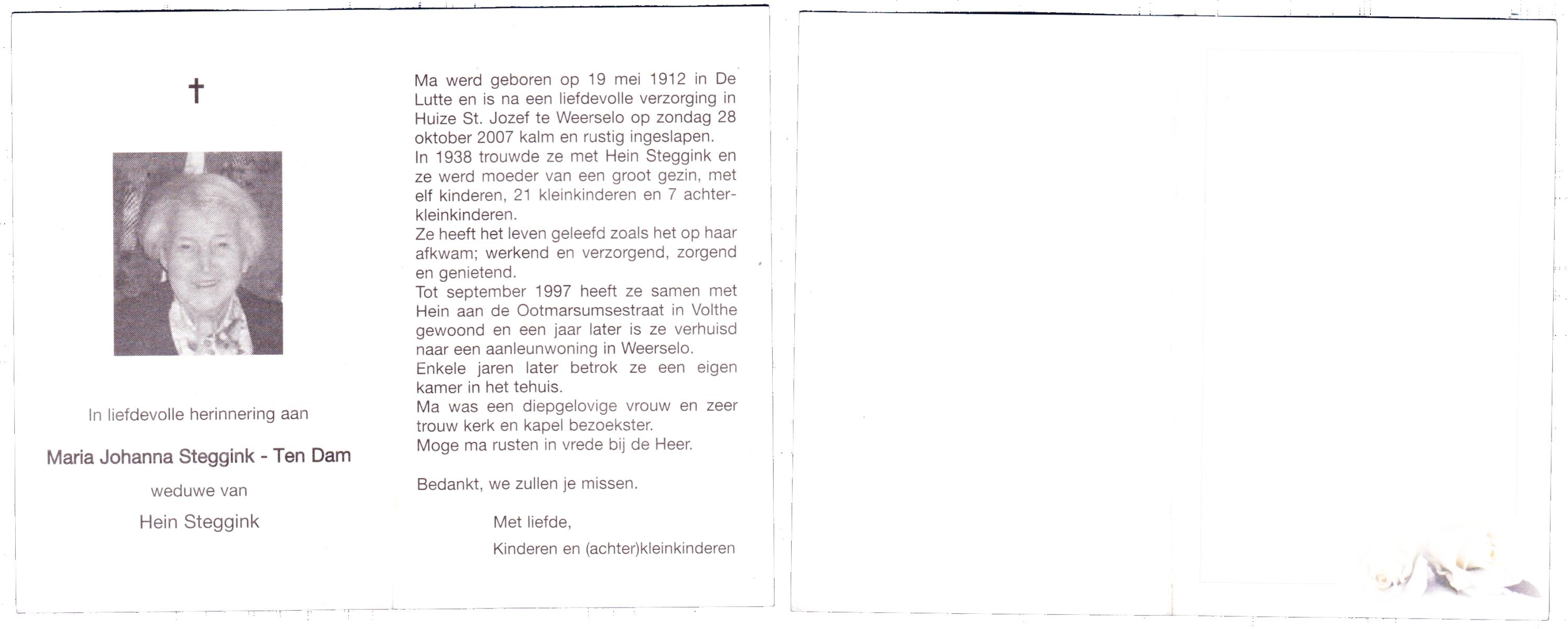 DAM, ten, Maria Johanna, geboren op 19-5-1912 te De Lutte, overleden op 28-10-2007 te Weerselo op 95-jarige leeftijd.