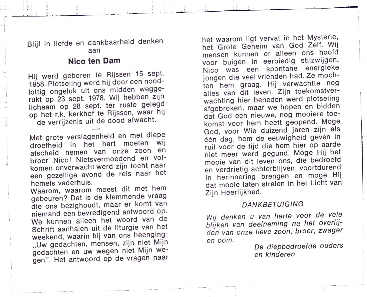 DAM, ten, Nico, geboren op 15-9-1958 te Rijssen, overleden op 23-9-1978 op 20-jarige leeftijd, begraven op 28-9-1978 te Rijssen.