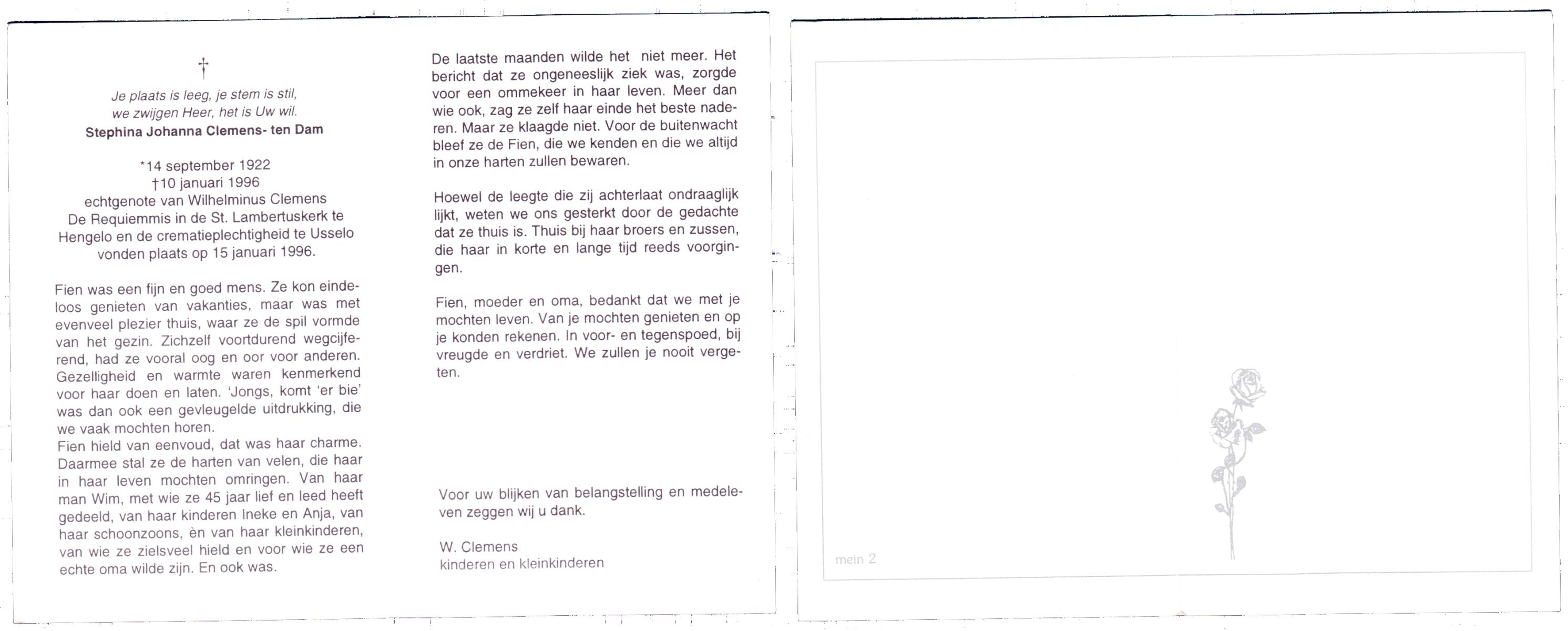 DAM, ten, Stephina Johanna (Fien), geboren op 14-9-1922, overleden op 10-1-1996 op 73-jarige leeftijd, gecremeerd op 15-1-1996 te Usselo.