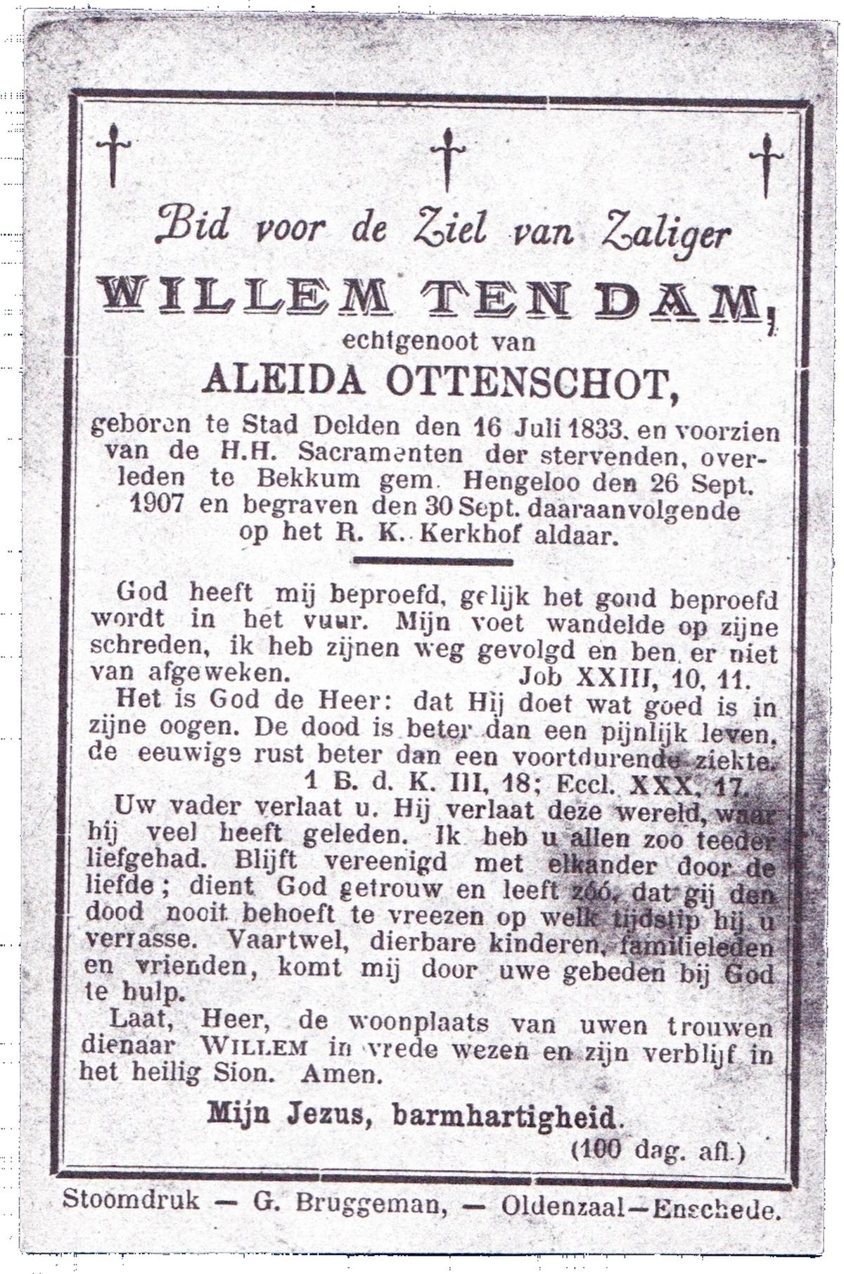 DAM, ten, Willem, geboren op 16-07-1833 te Delden, Stad, overleden op 26-9-1907 te Bekkum op 74-jarige leeftijd, begraven op 30-9-1907 te Bekkum.