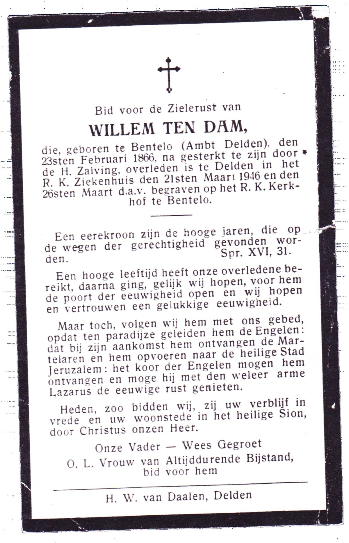 DAM, ten, Willem, geboren op 23-02-1866 te Bentelo, overleden op 21-3-1946 te Delden op 80-jarige leeftijd, begraven op 26-3-1946 te Bentelo.