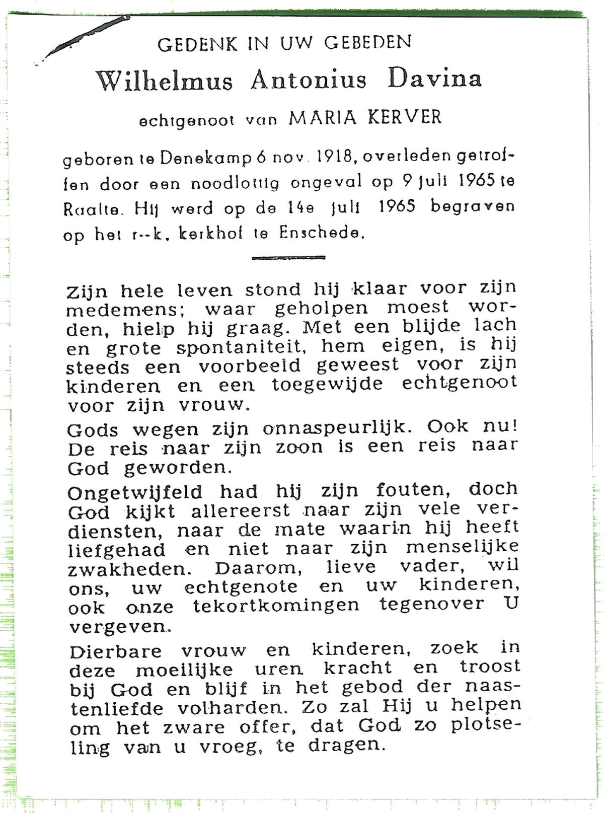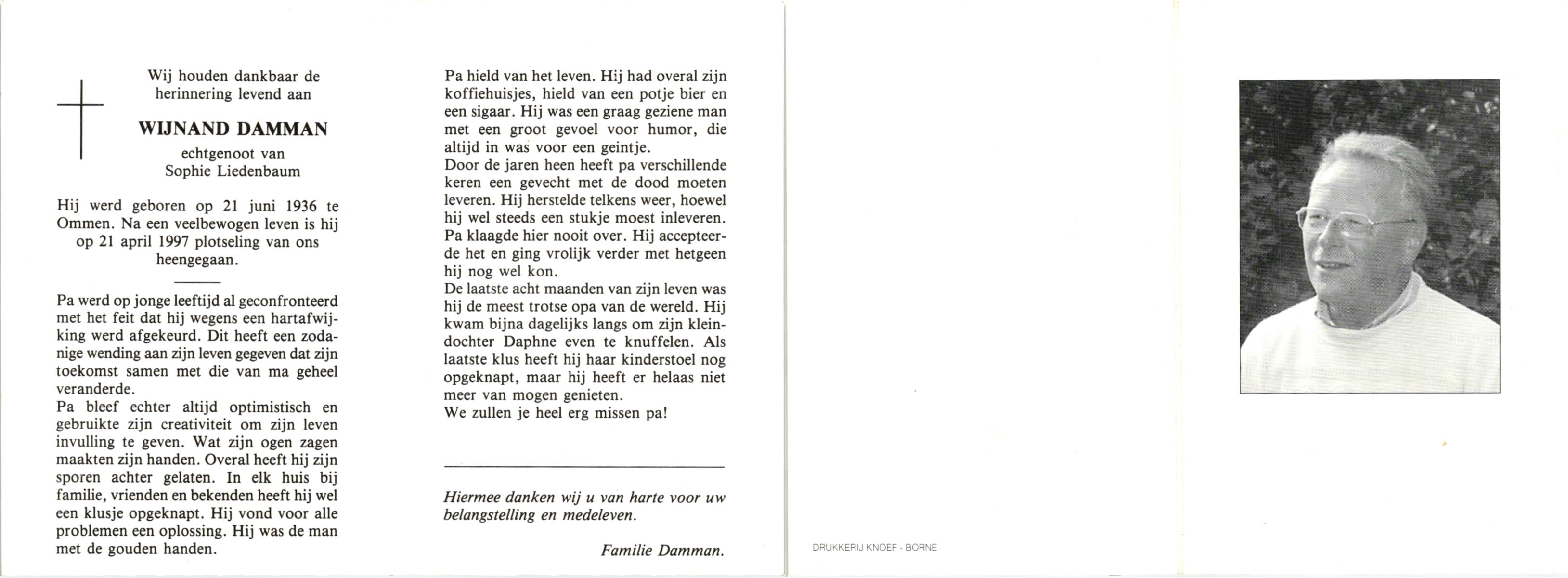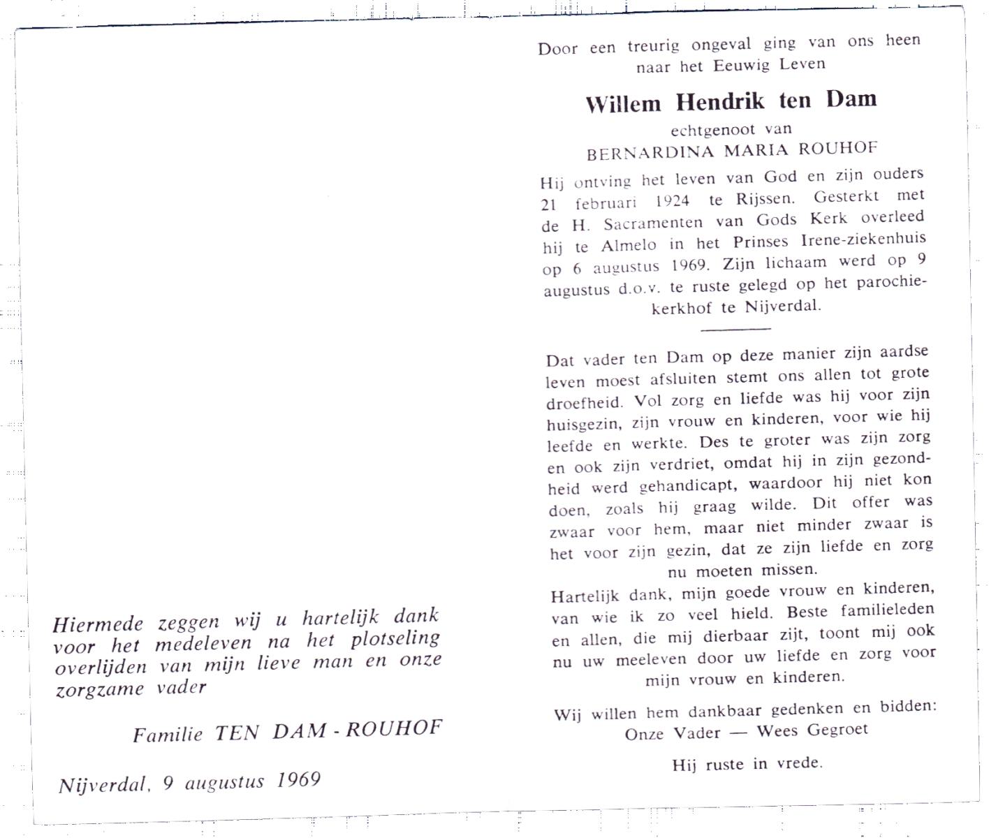 DAM, ten, Willem Hendrik, geboren op 21-2-1924 te Rijssen, overleden op 6-8-1969 te Almelo op 44-jarige leeftijd, begraven op 9-8-1969 te Hellendoorn, Nijverdal.