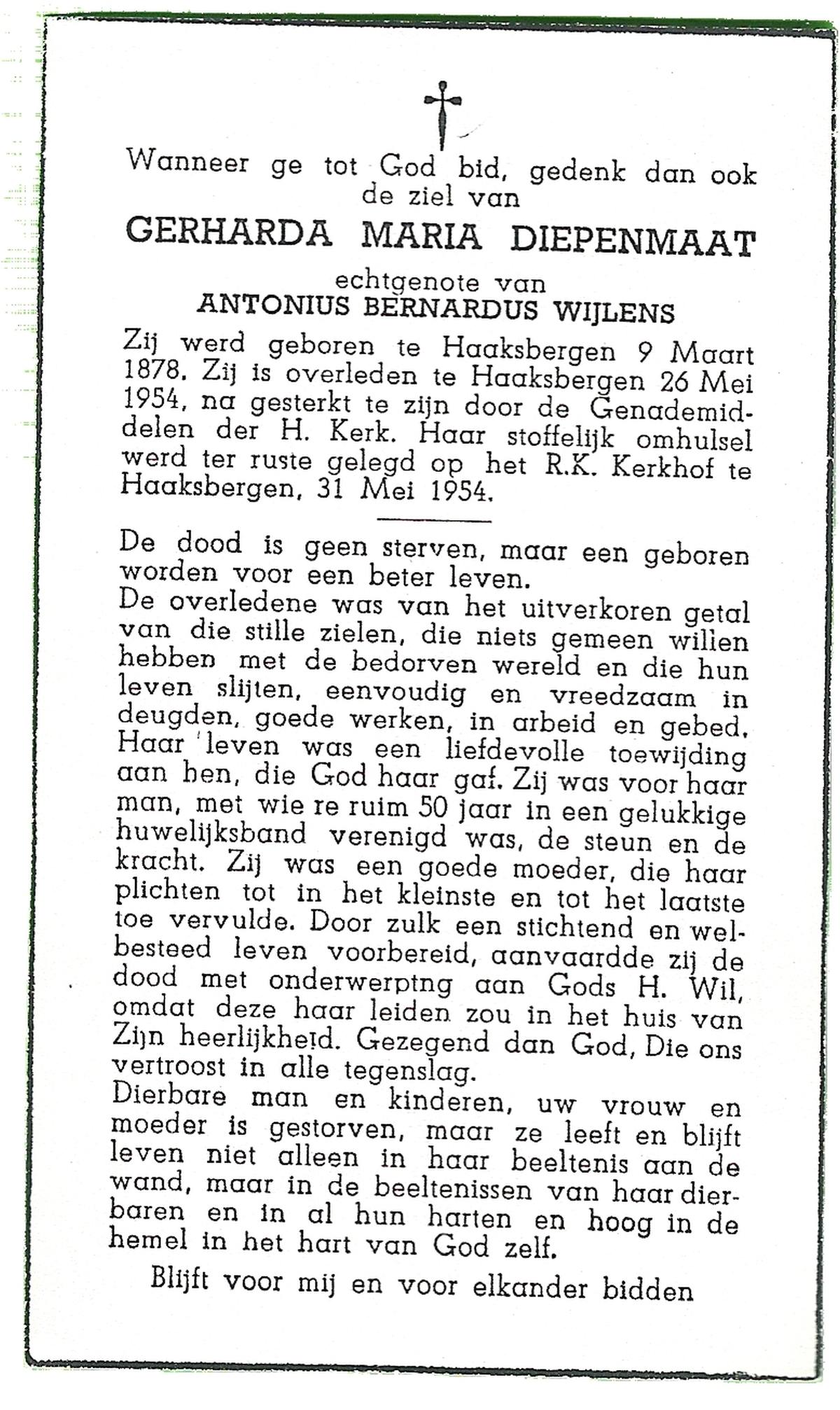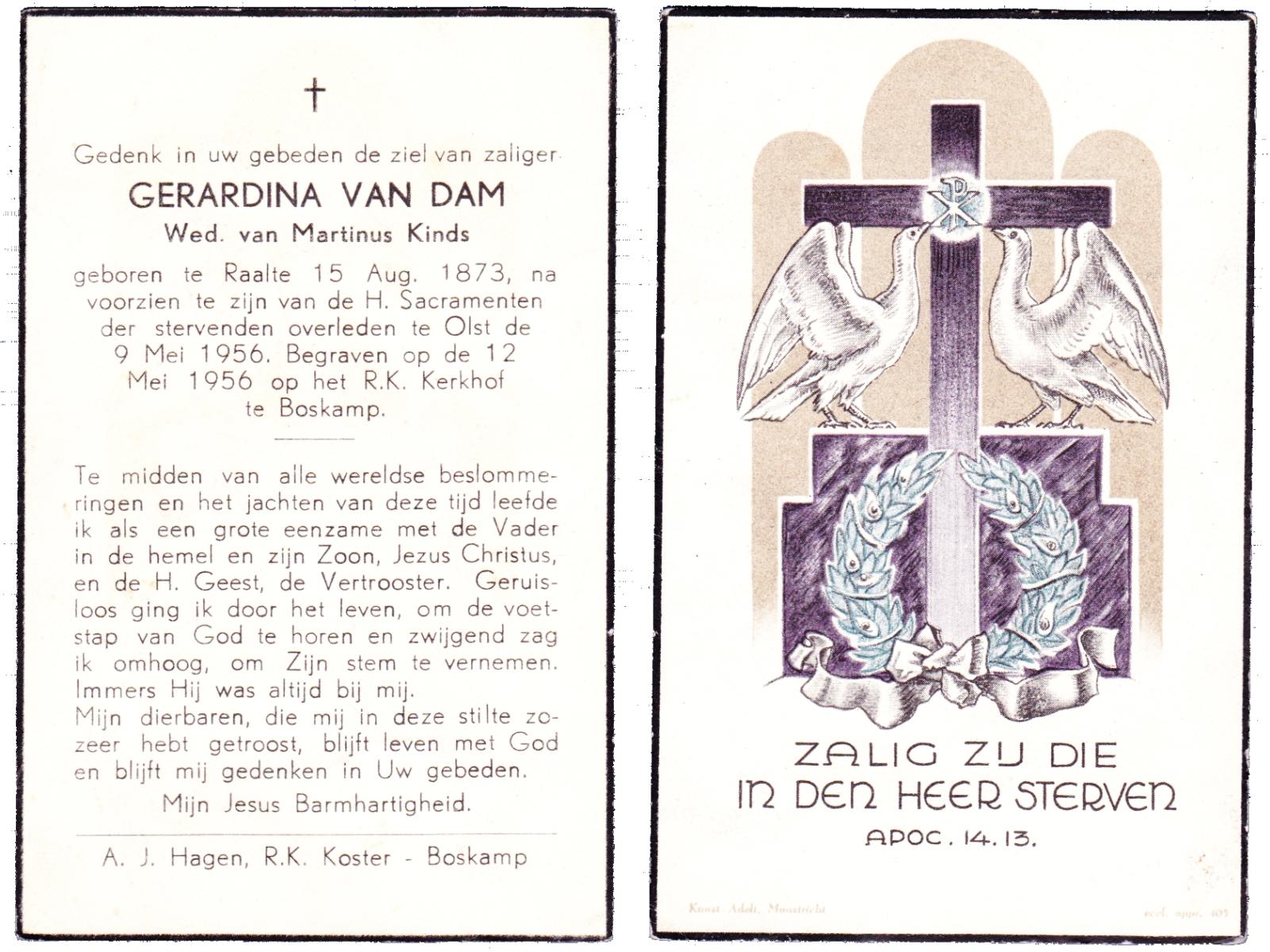 DAM, van, Gerardina, geboren op 15-08-1873 te Raalte, overleden op 9-5-1956 te Olst op 82-jarige leeftijd, begraven op 12-5-1956 te Boskamp.
