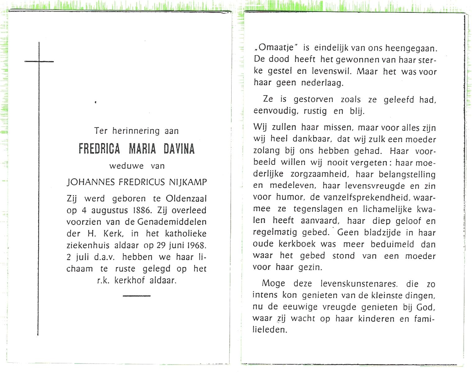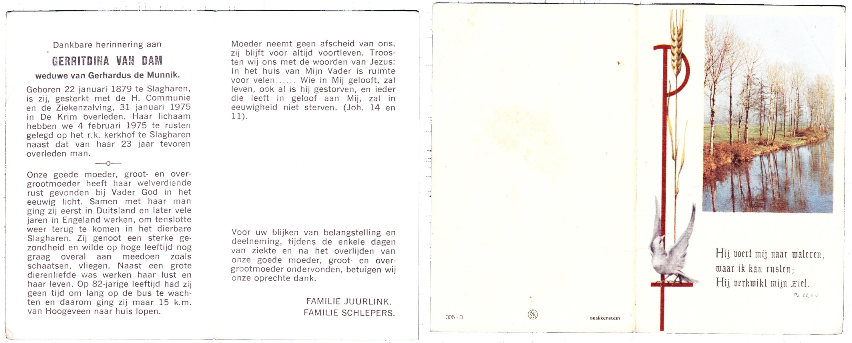 DAM, van, Gerritdina, geboren op 22-01-1879 te Slagharen, overleden op 31-1-1975 te De Krim op 96-jarige leeftijd, begraven op 4-2-1975 te Slagharen.