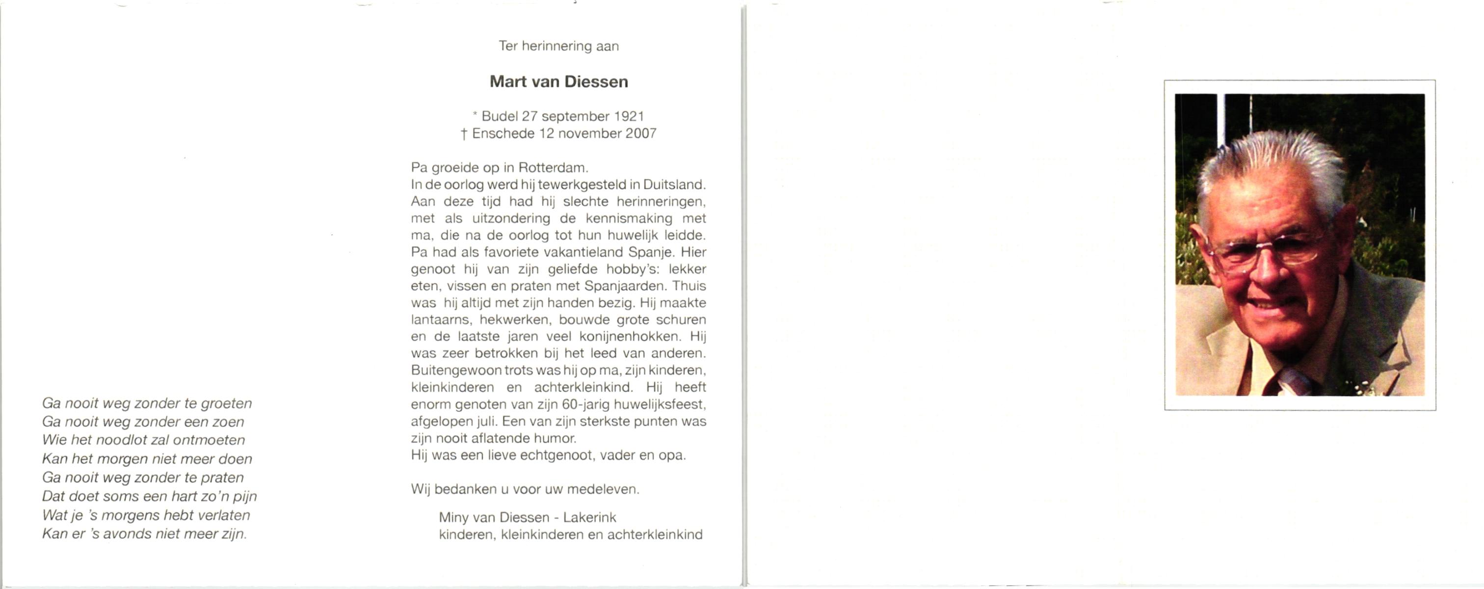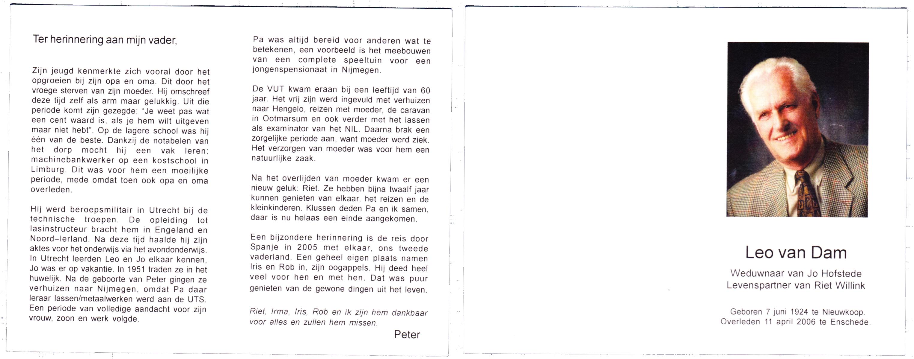 DAM, van, Leo, geboren op 7-6-1924 te Nieuwkoop, overleden op 11-4-2006 te Enschede op 81-jarige leeftijd.