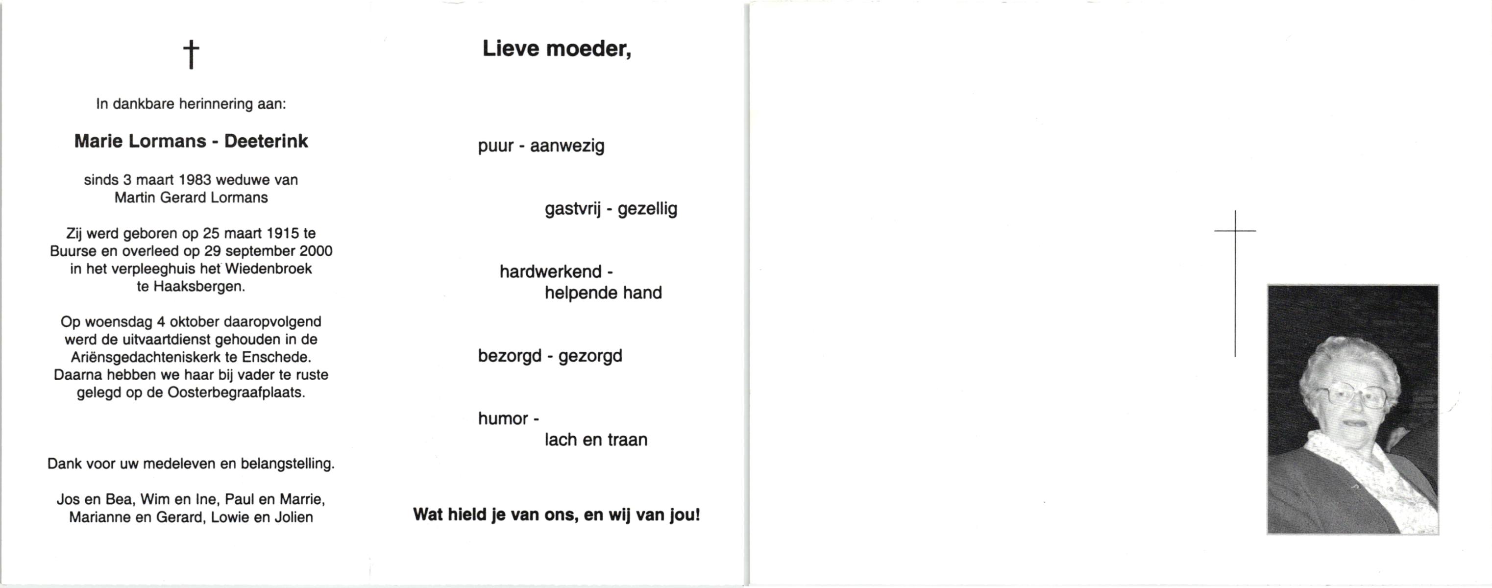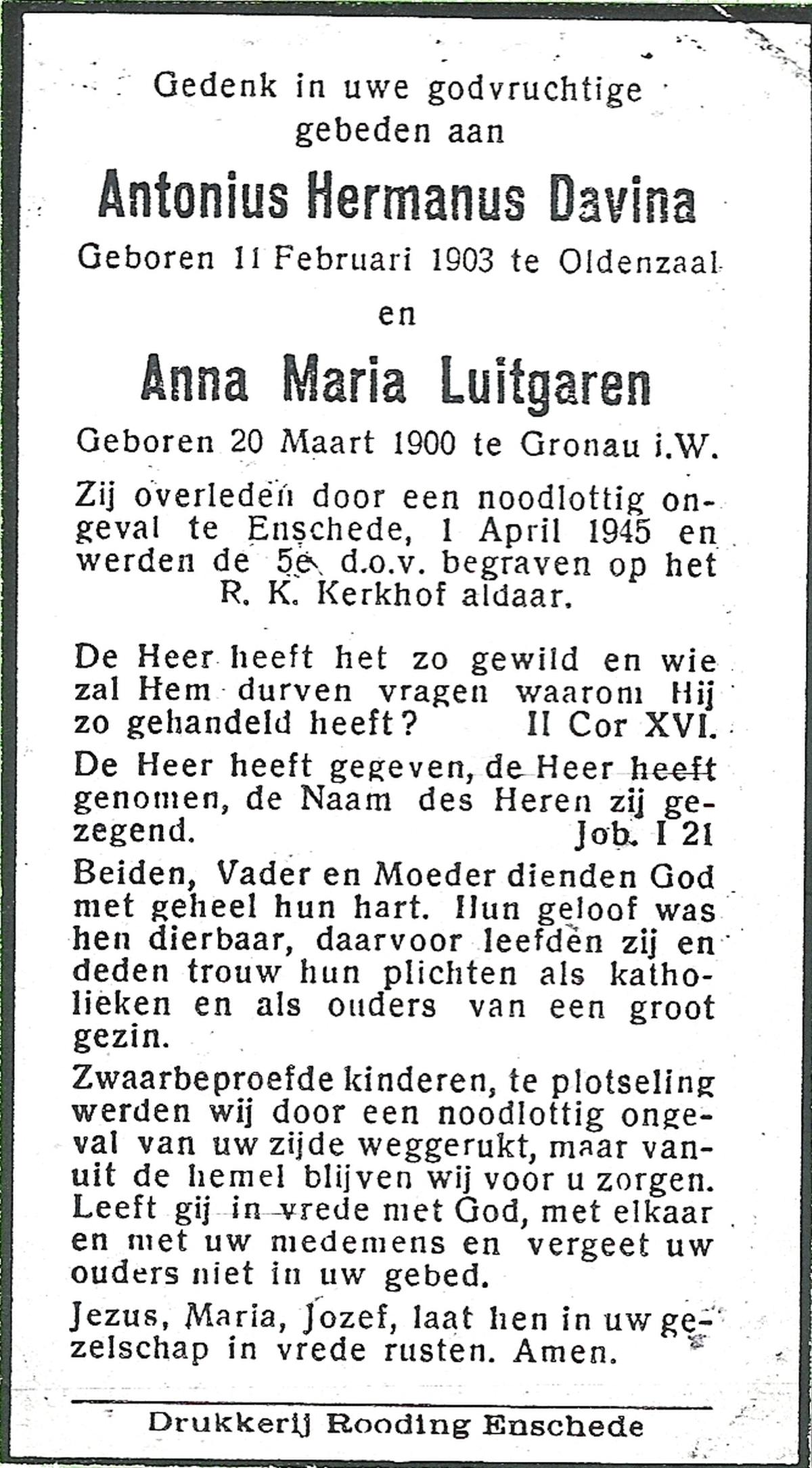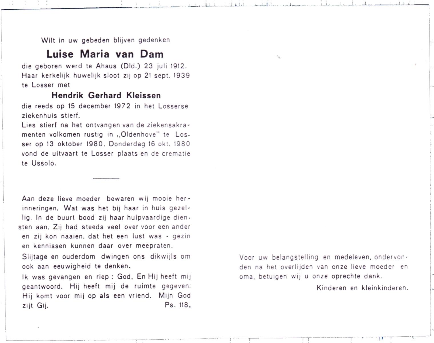 DAM, van, Luise Maria, geboren op 23-7-1912 te Ahaus (D), overleden op 13-10-1980 te Losser op 68-jarige leeftijd, begraven op 16-10-1980 te Losser.