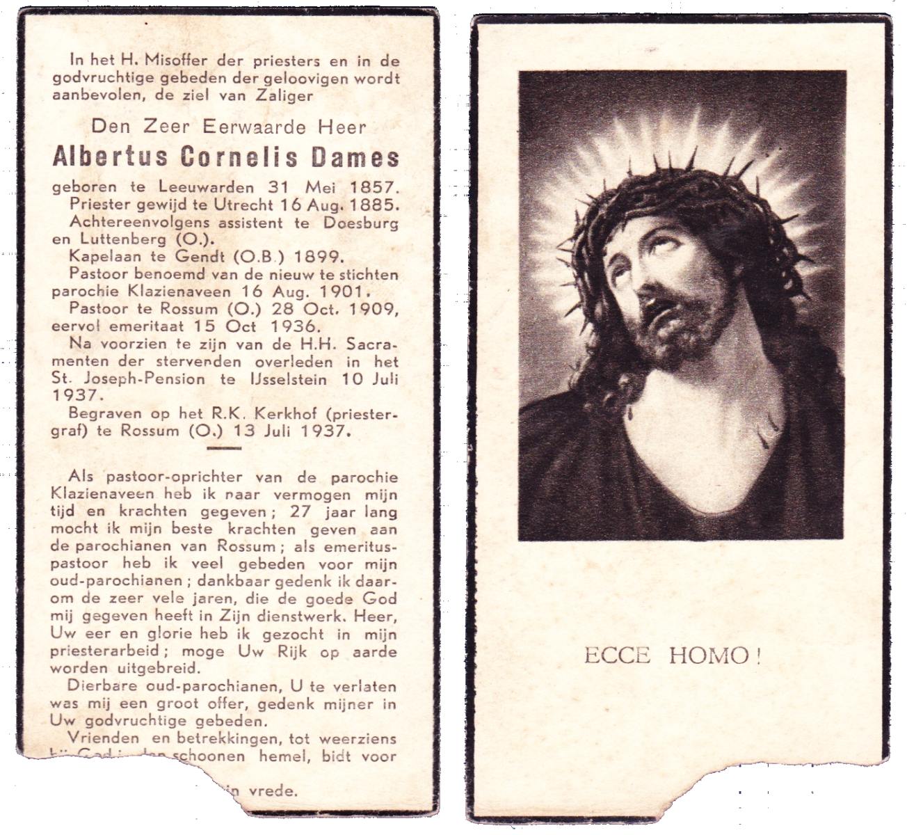 DAMES, Albertus Cornelis, geboren op 31-05-1857 te Leeuwarden, overleden op 10-7-1937 te IJsselstein op 80-jarige leeftijd, begraven op 13-7-1937 te Rossum.