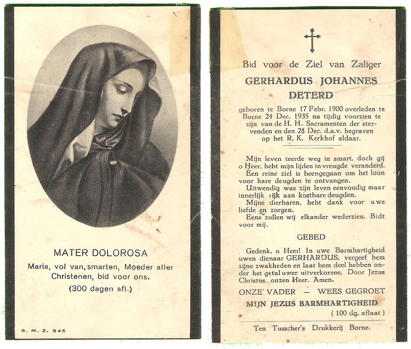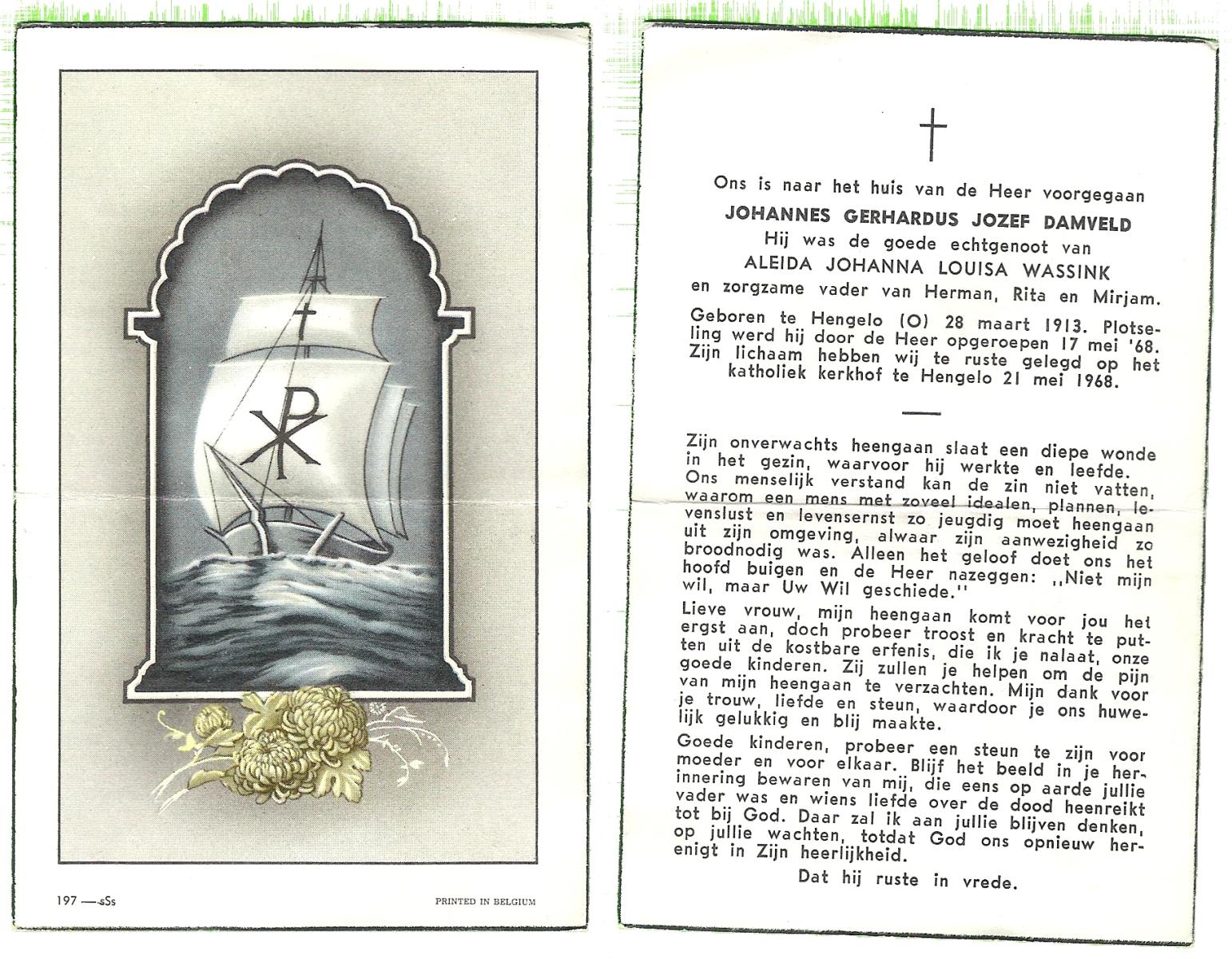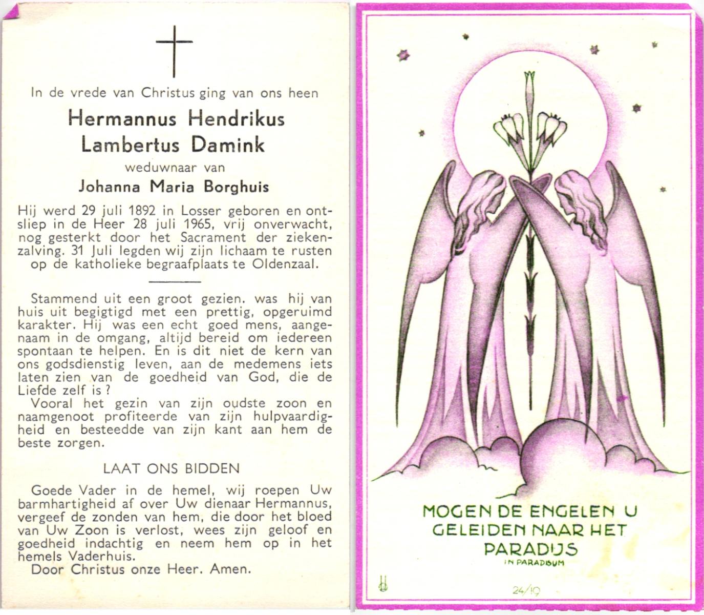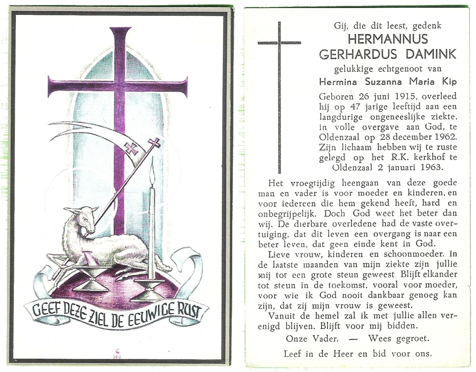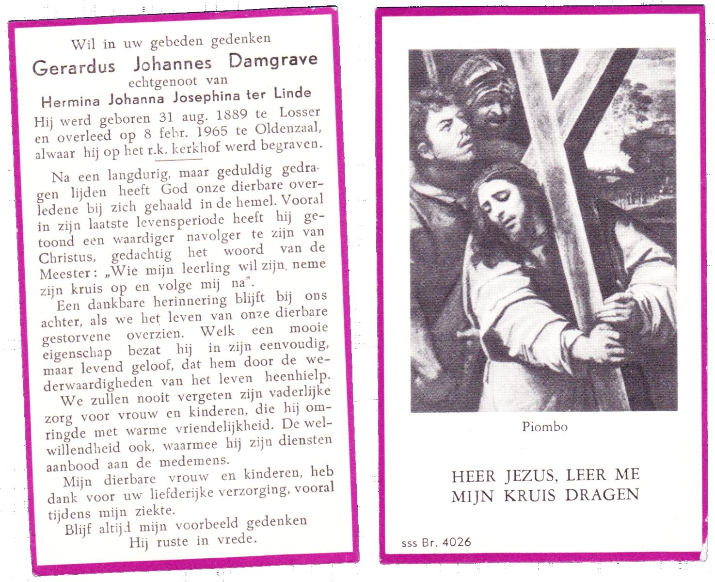 DAMGRAVE, Gerardus Johannes, geboren op 31-08-1889 te Losser, overleden op 8-1-1965 te Oldenzaal op 75-jarige leeftijd, begraven te Oldenzaal.