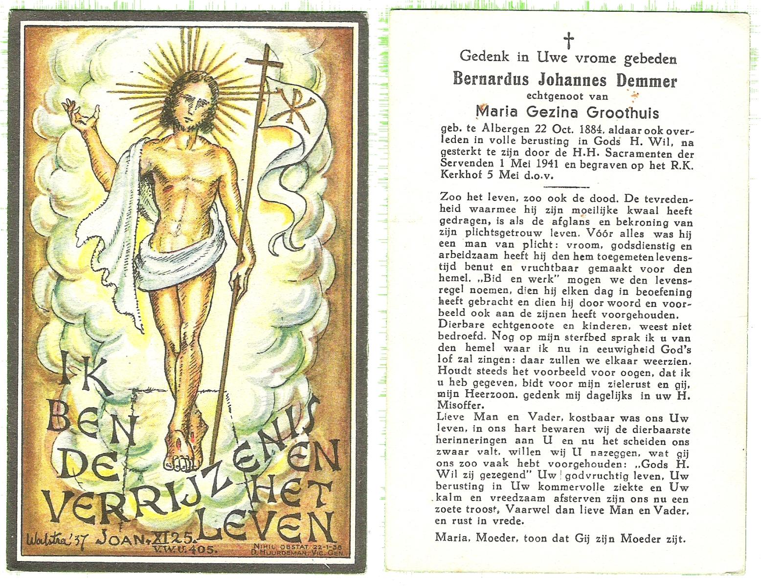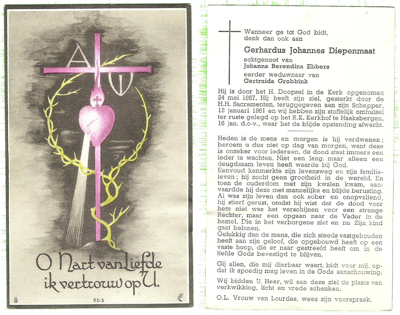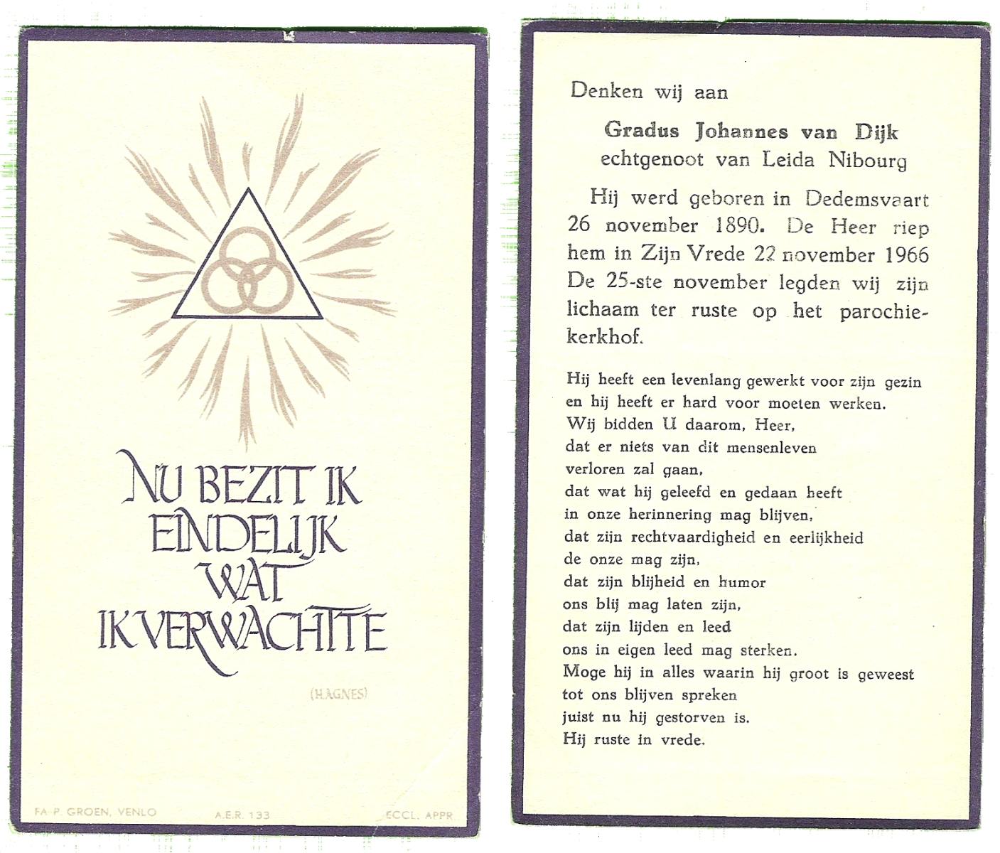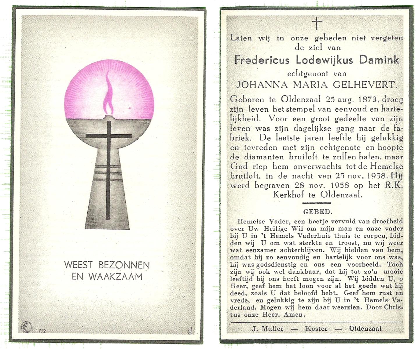 DAMGRAVE, Gerardus Johannes, geboren op 31-08-1889 te Losser, overleden op 8-1-1965 te Oldenzaal op 75-jarige leeftijd, begraven te Oldenzaal.