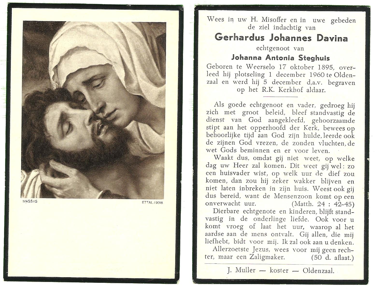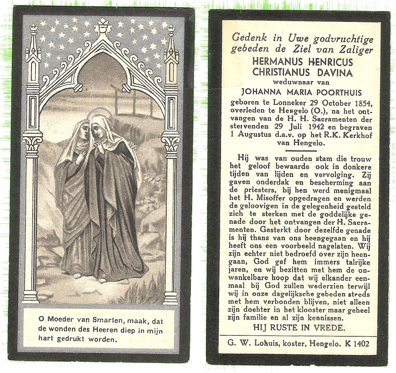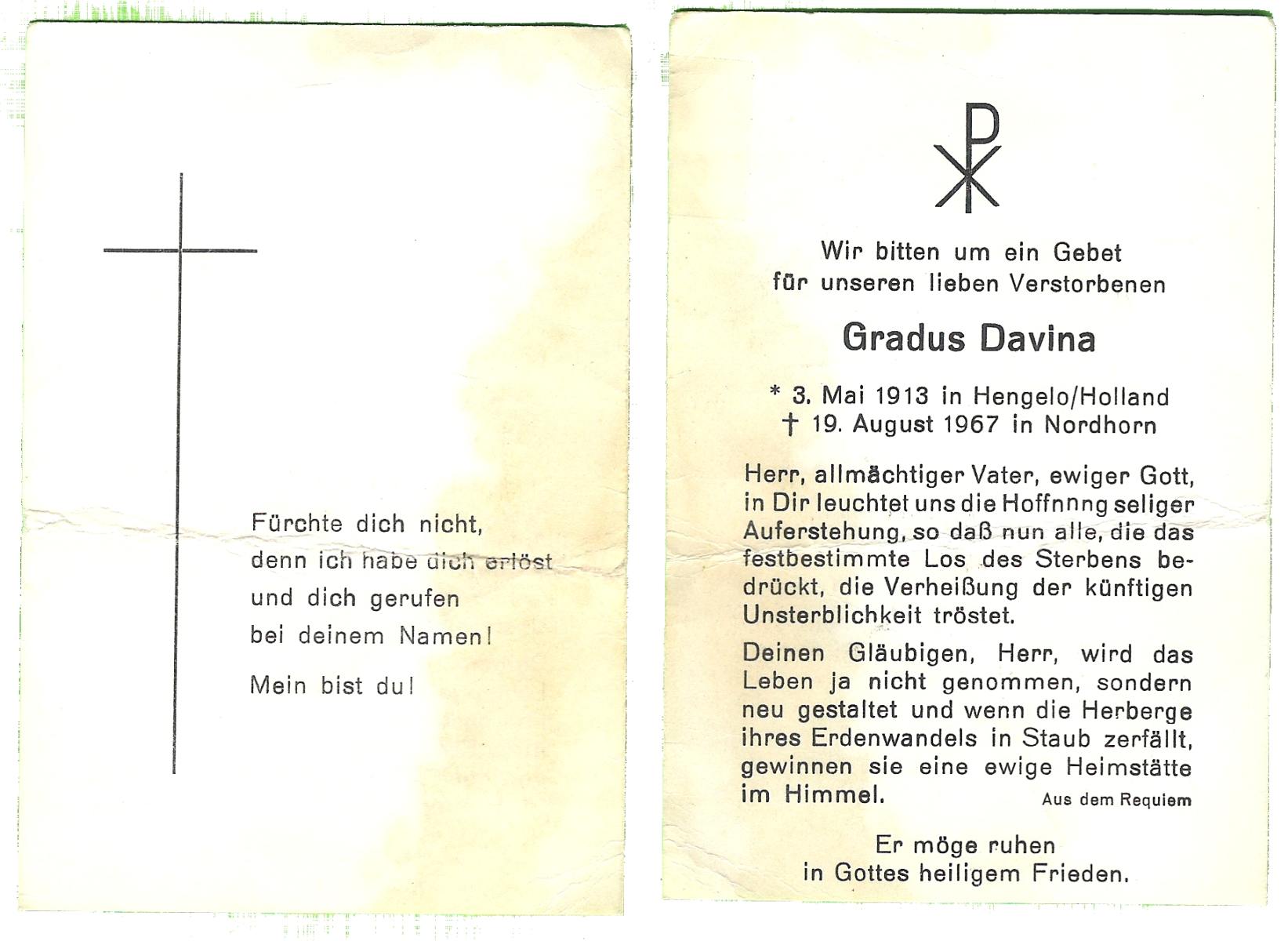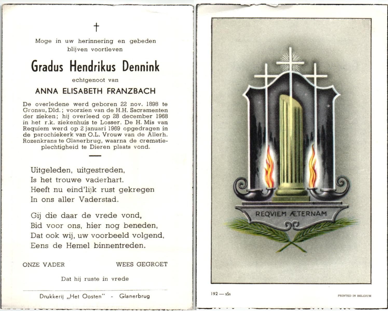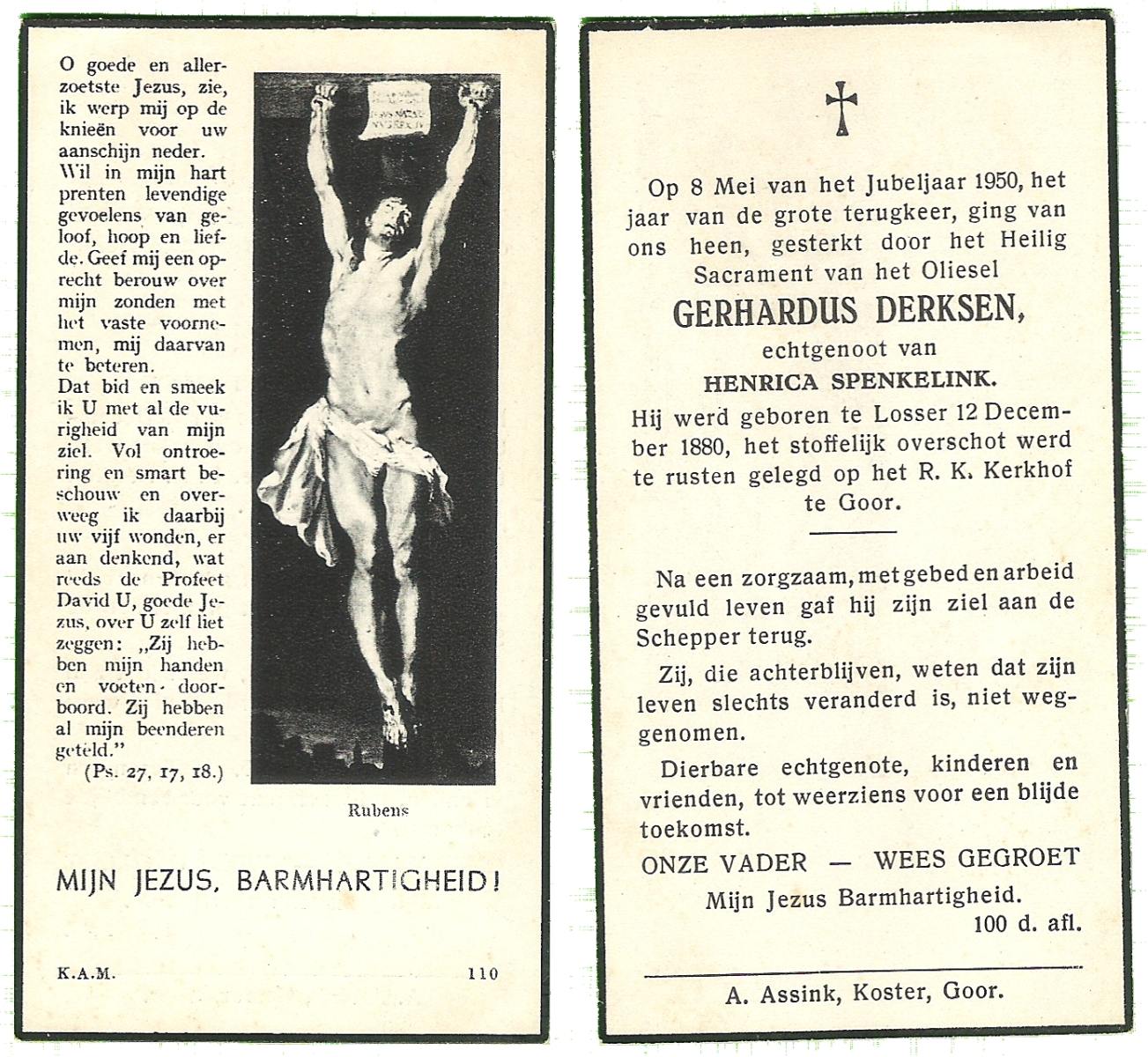DAMGRAVE, Gerardus Johannes, geboren op 31-08-1889 te Losser, overleden op 8-1-1965 te Oldenzaal op 75-jarige leeftijd, begraven te Oldenzaal.