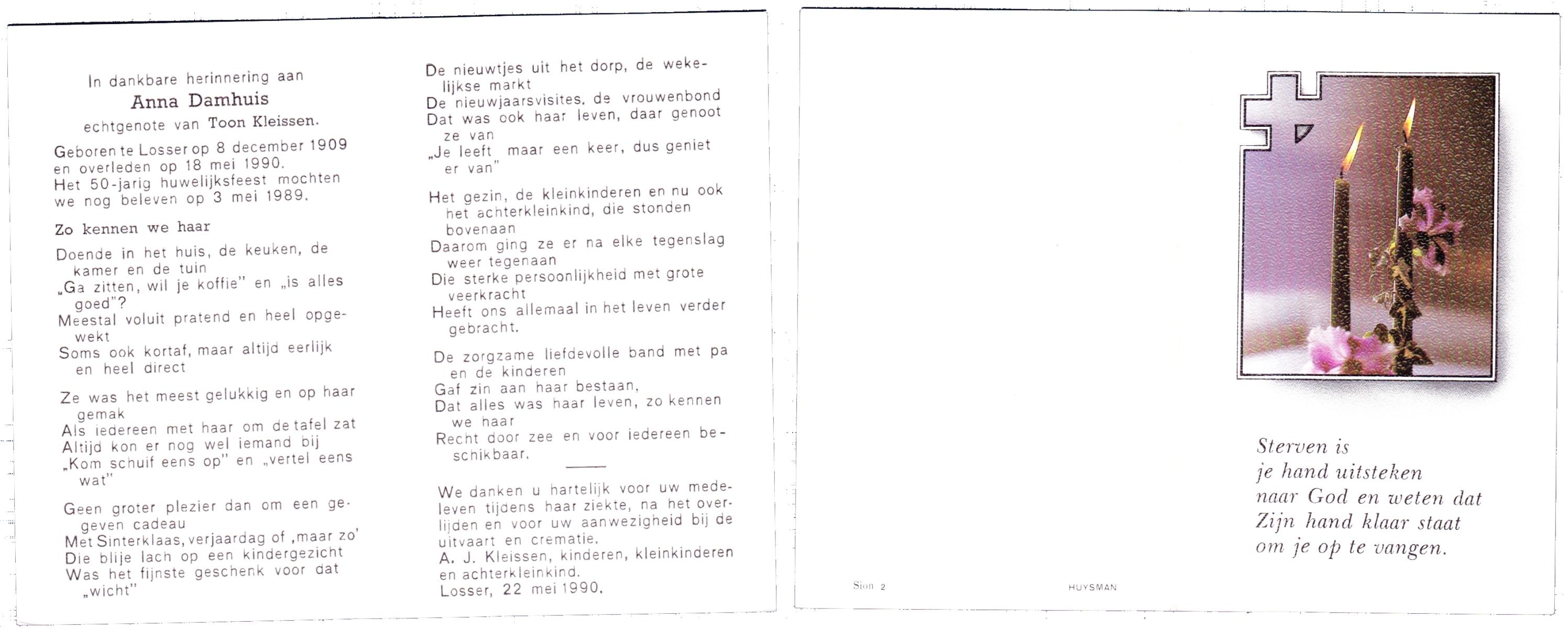 DAMHUIS, Anna, geboren op 8-12-1909 te Losser, overleden op 18-5-1990 op 80-jarige leeftijd, begraven op 22-5-1990 te Losser.