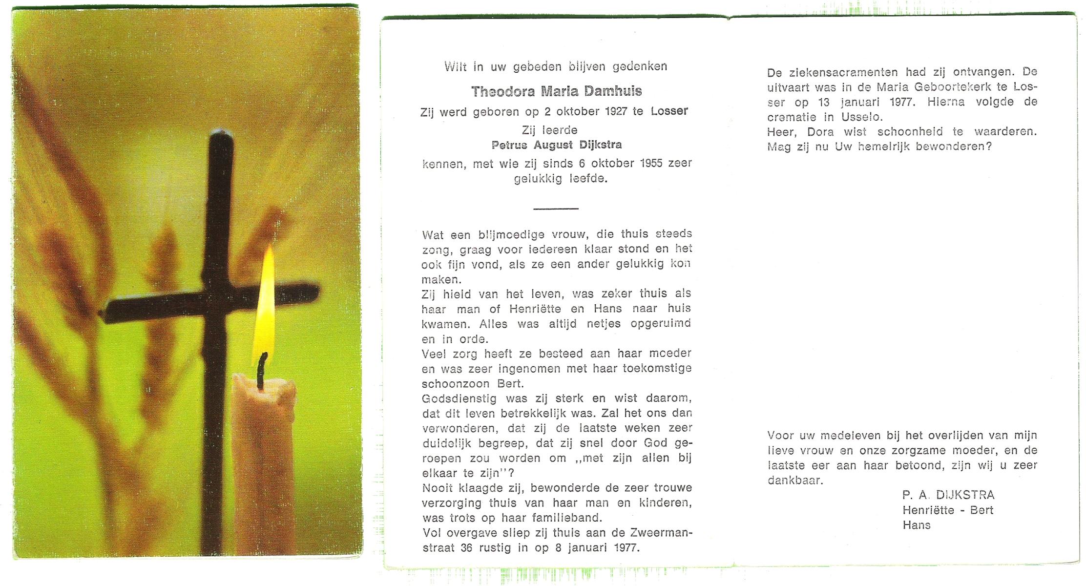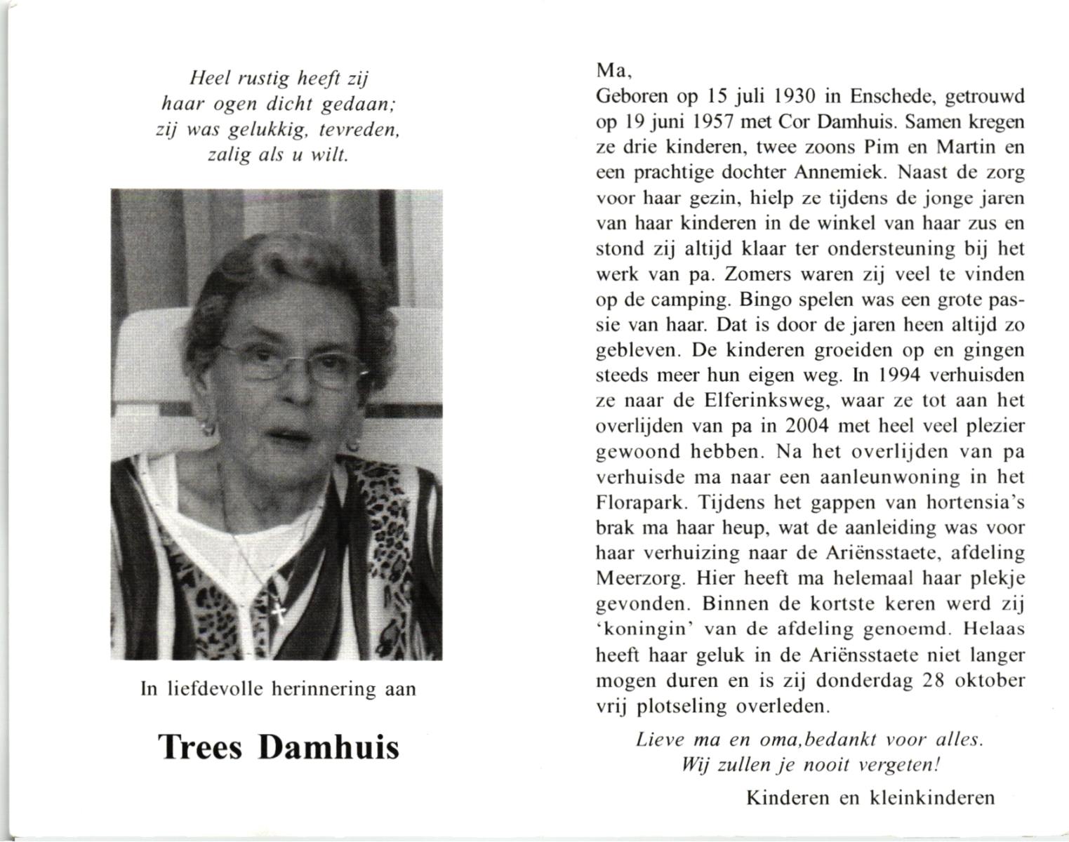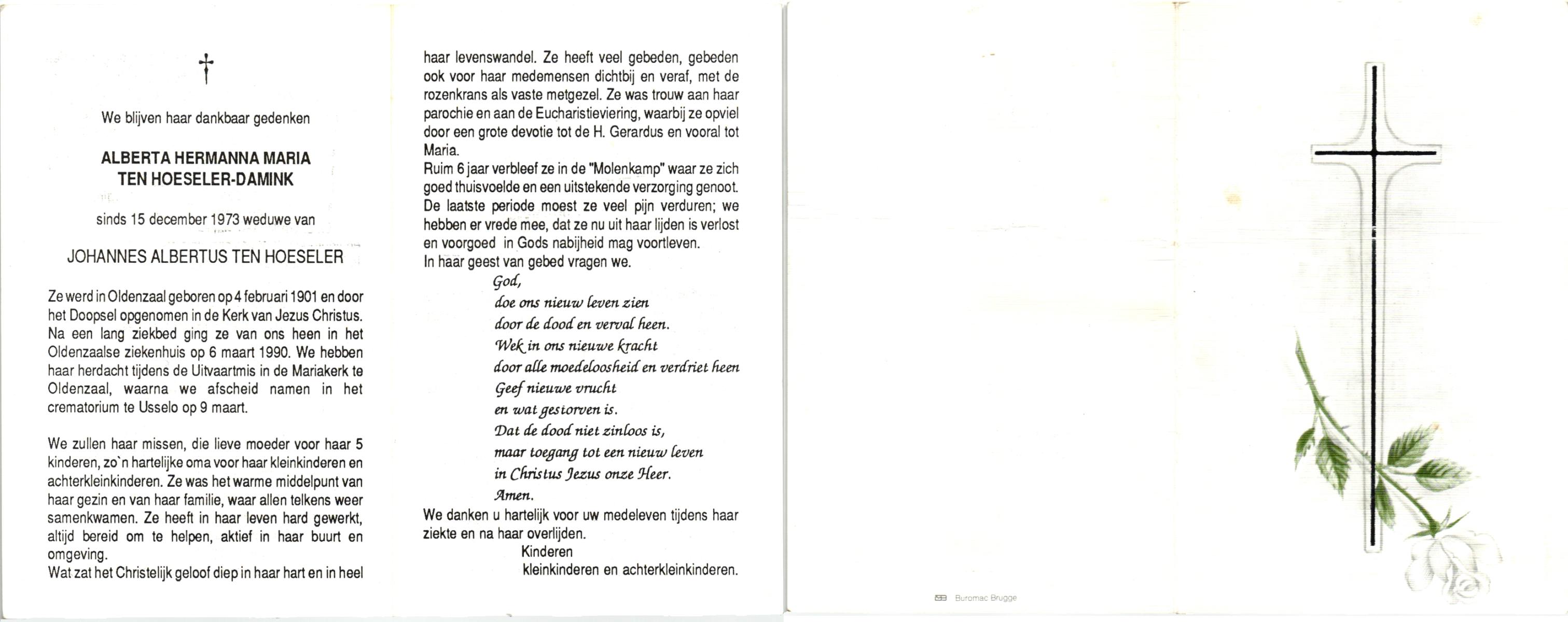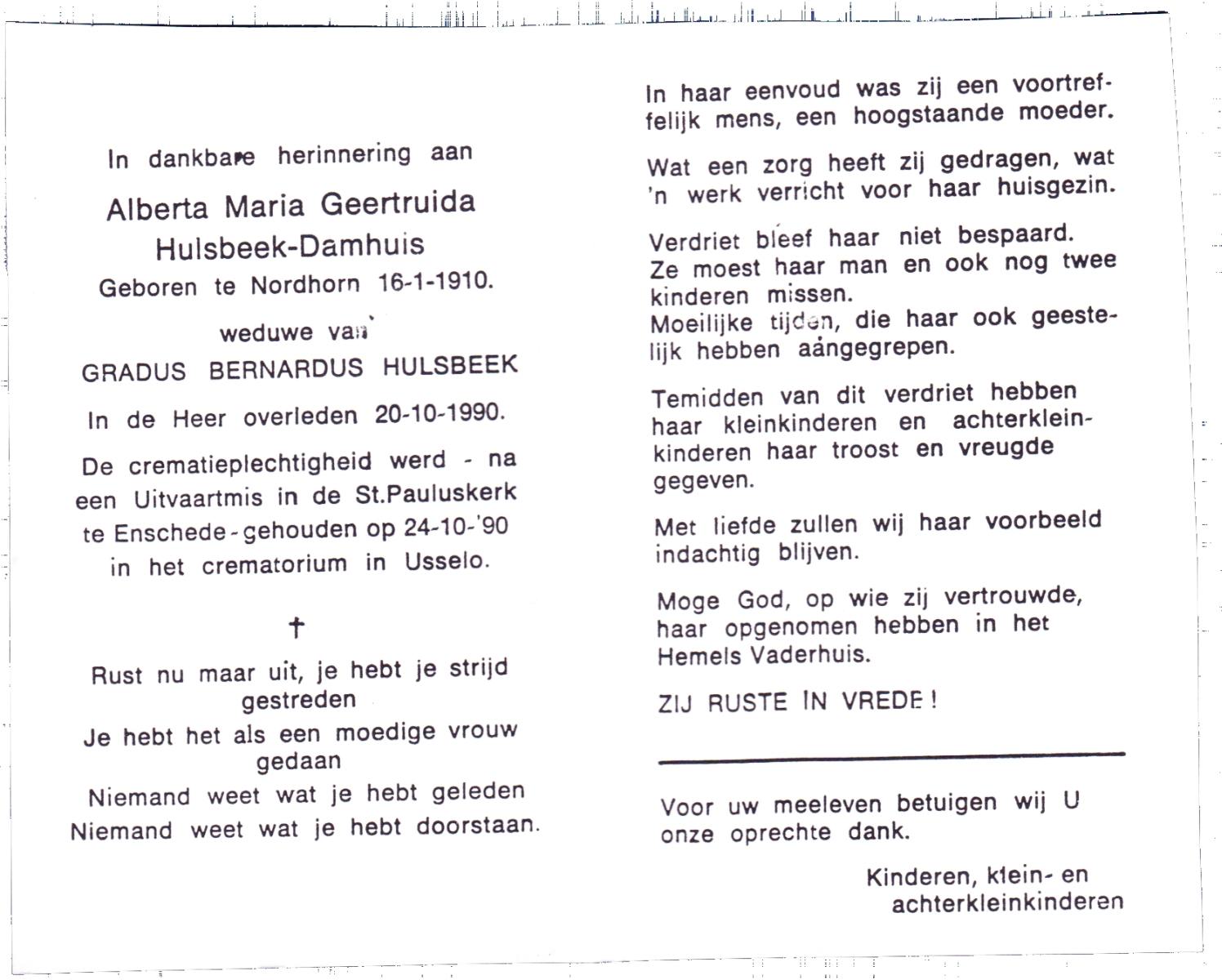 DAMHUIS, Alberta Maria Geertruida, geboren op 16-1-1910 te Nordhorn (Dld.), overleden op 20-10-1990 op 80-jarige leeftijd, gecremeerd op 24-10-1990 te Usselo.