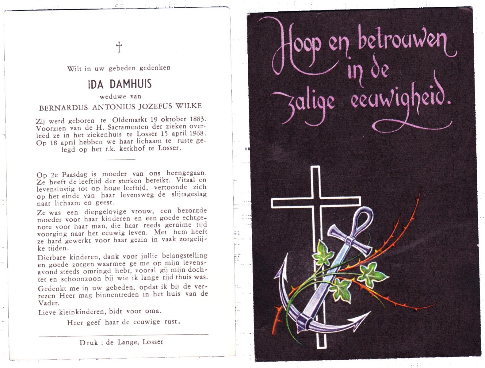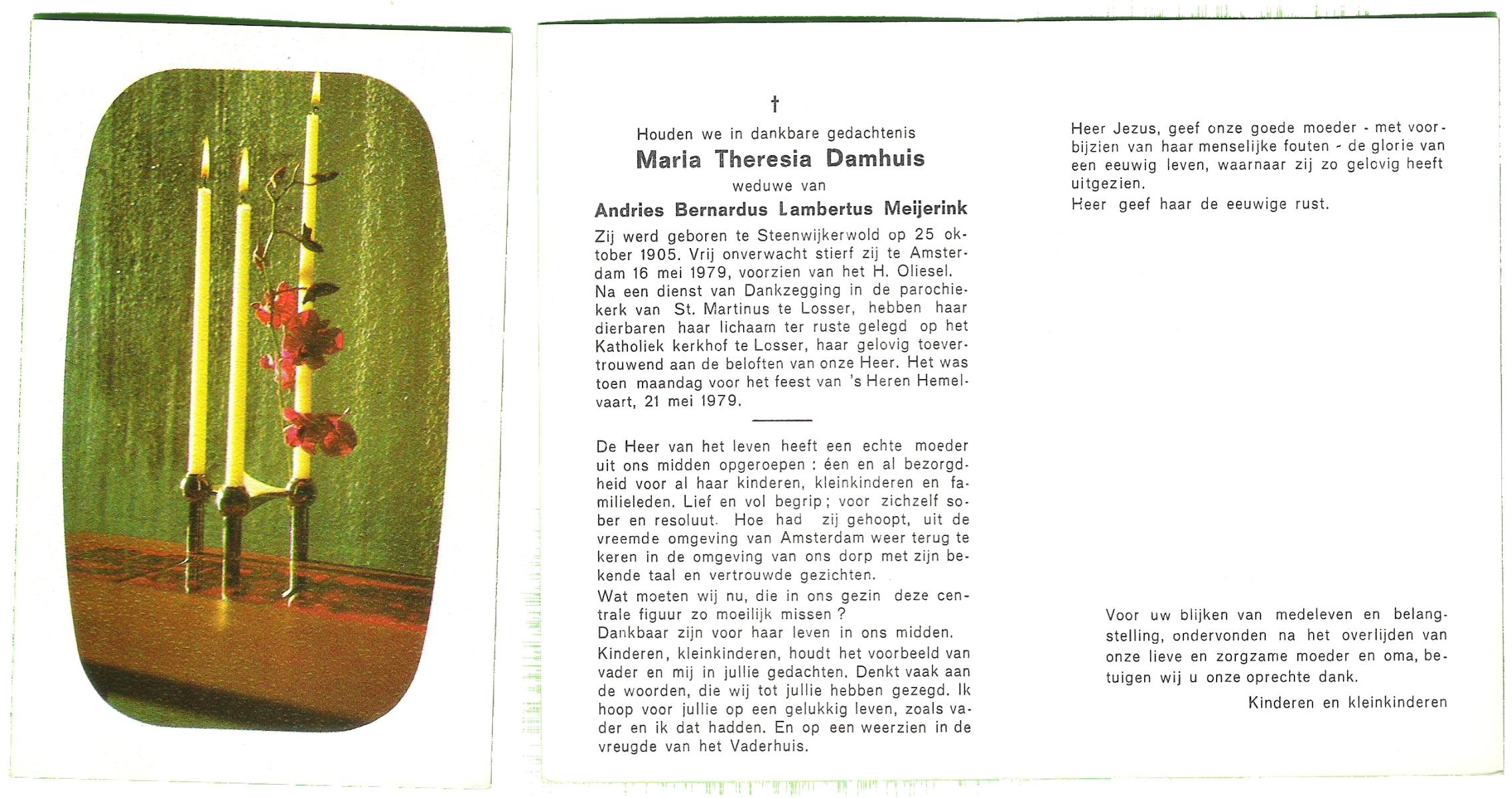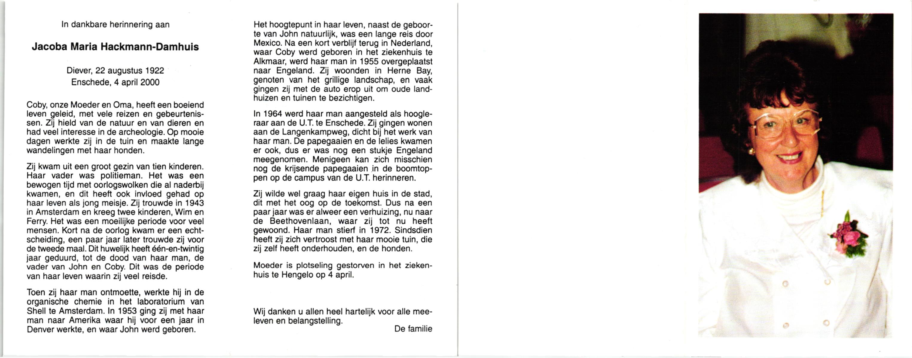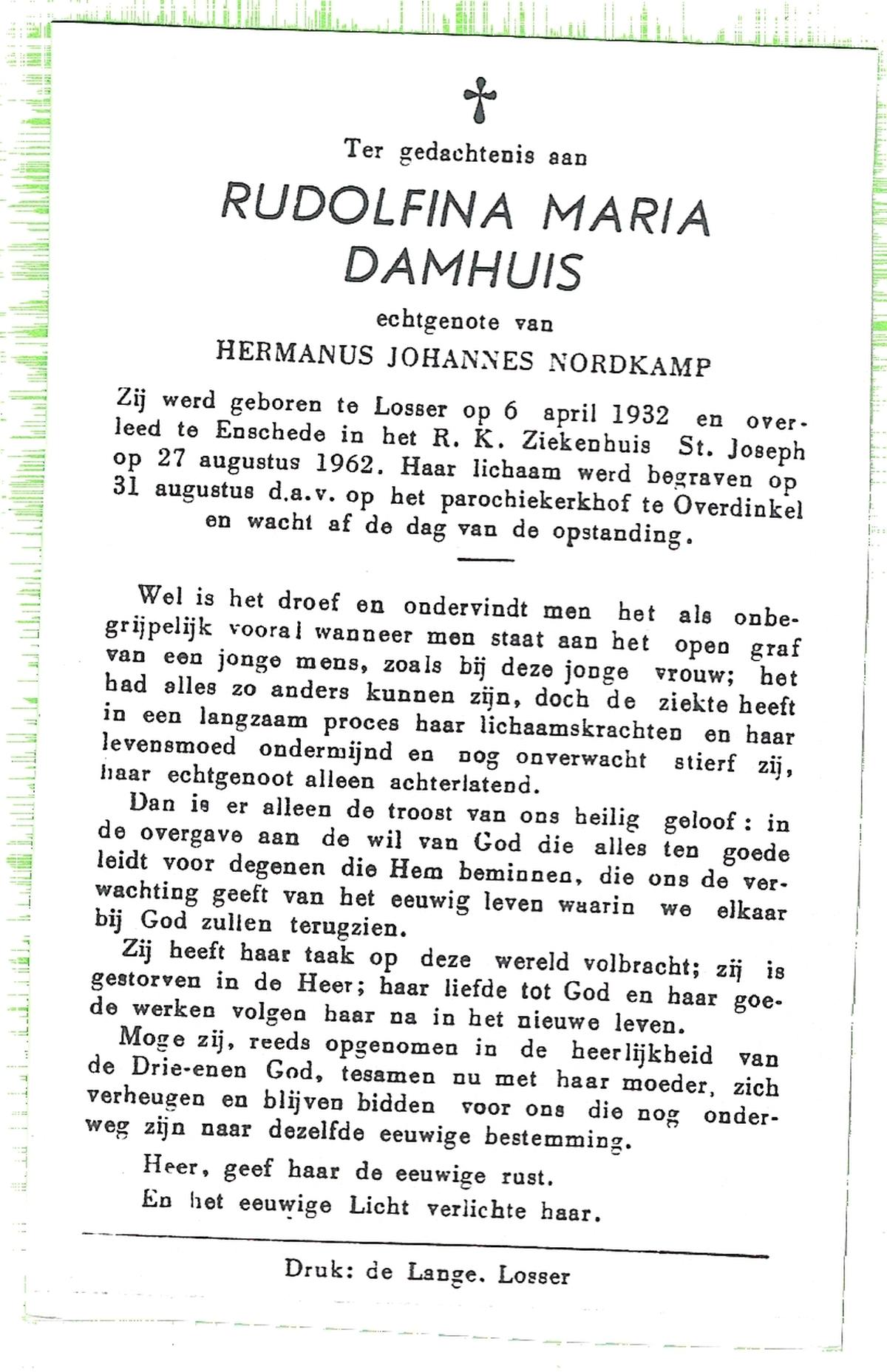 DAMHUIS, Alberta Maria Geertruida, geboren op 16-1-1910 te Nordhorn (Dld.), overleden op 20-10-1990 op 80-jarige leeftijd, gecremeerd op 24-10-1990 te Usselo.