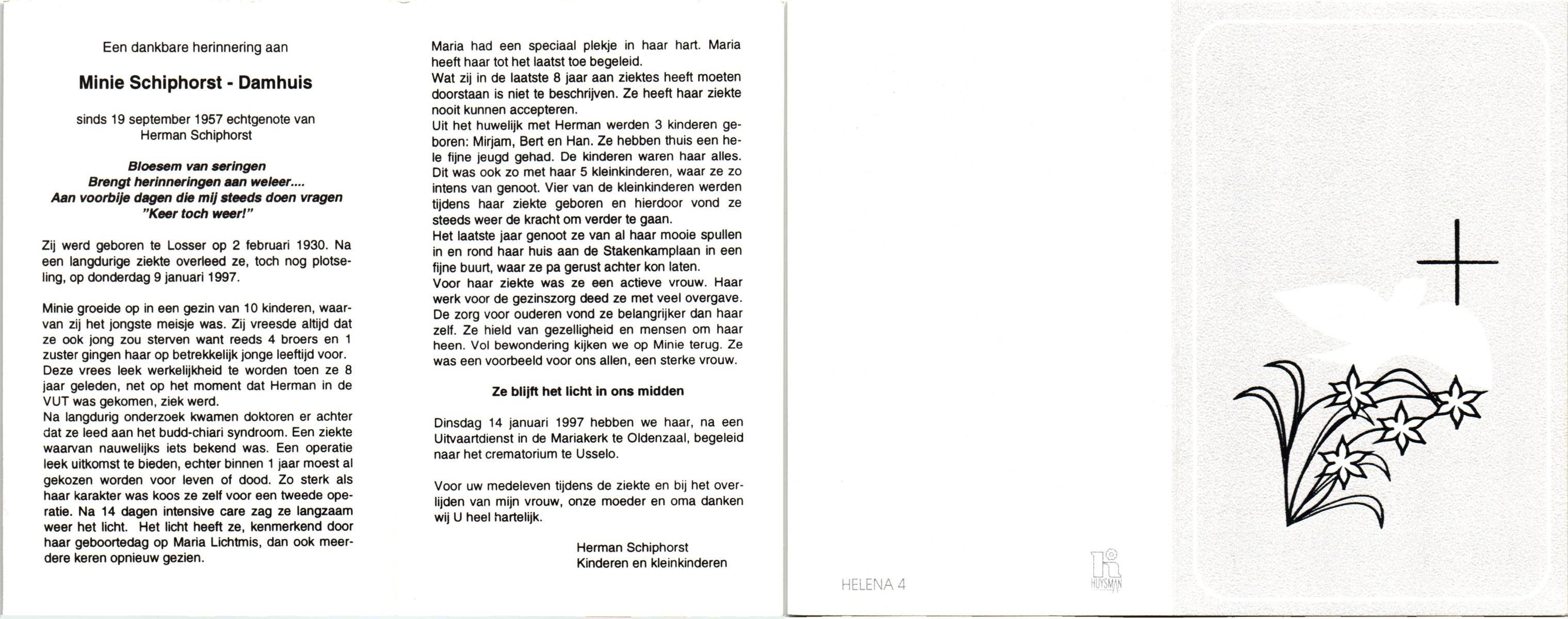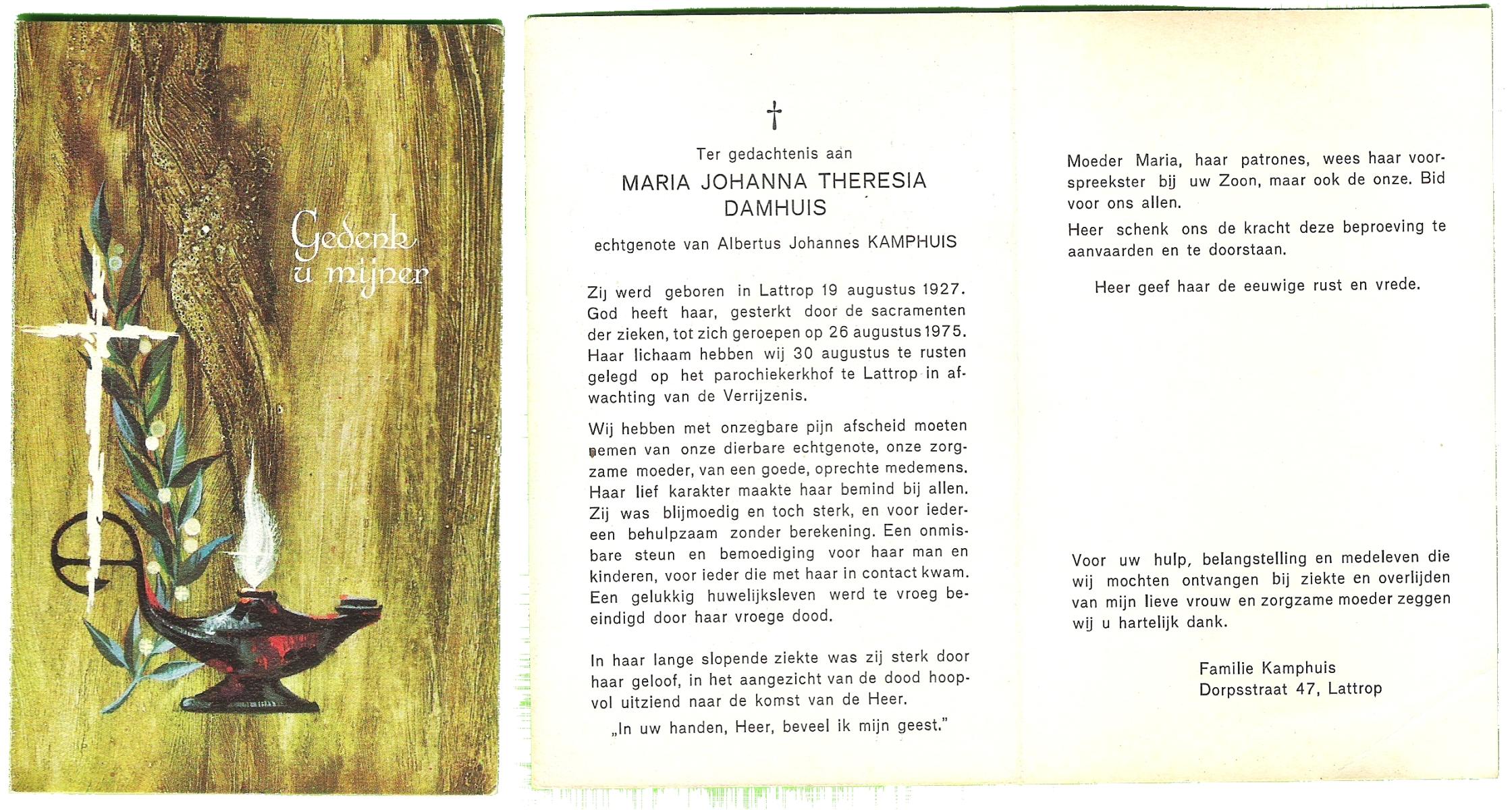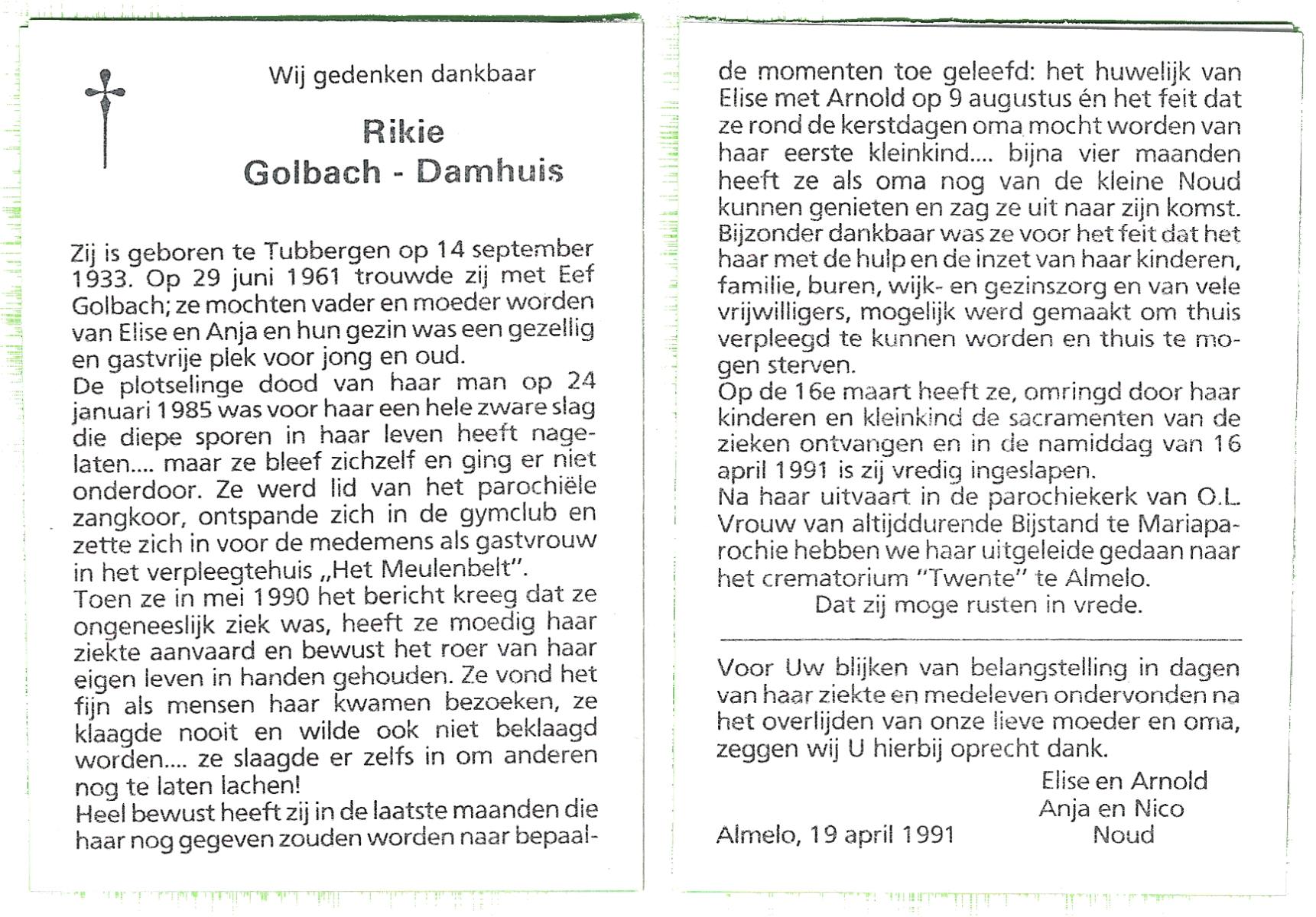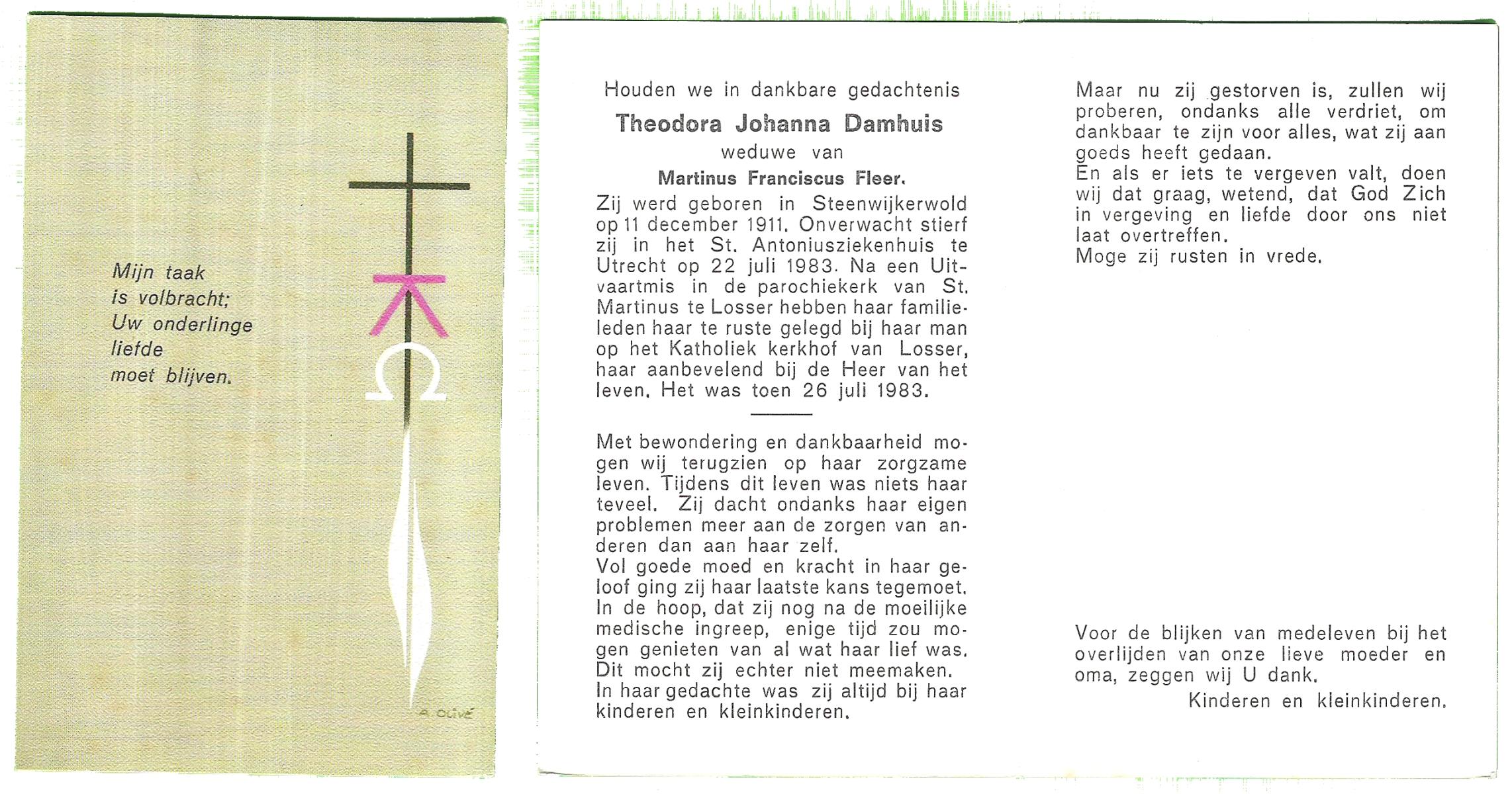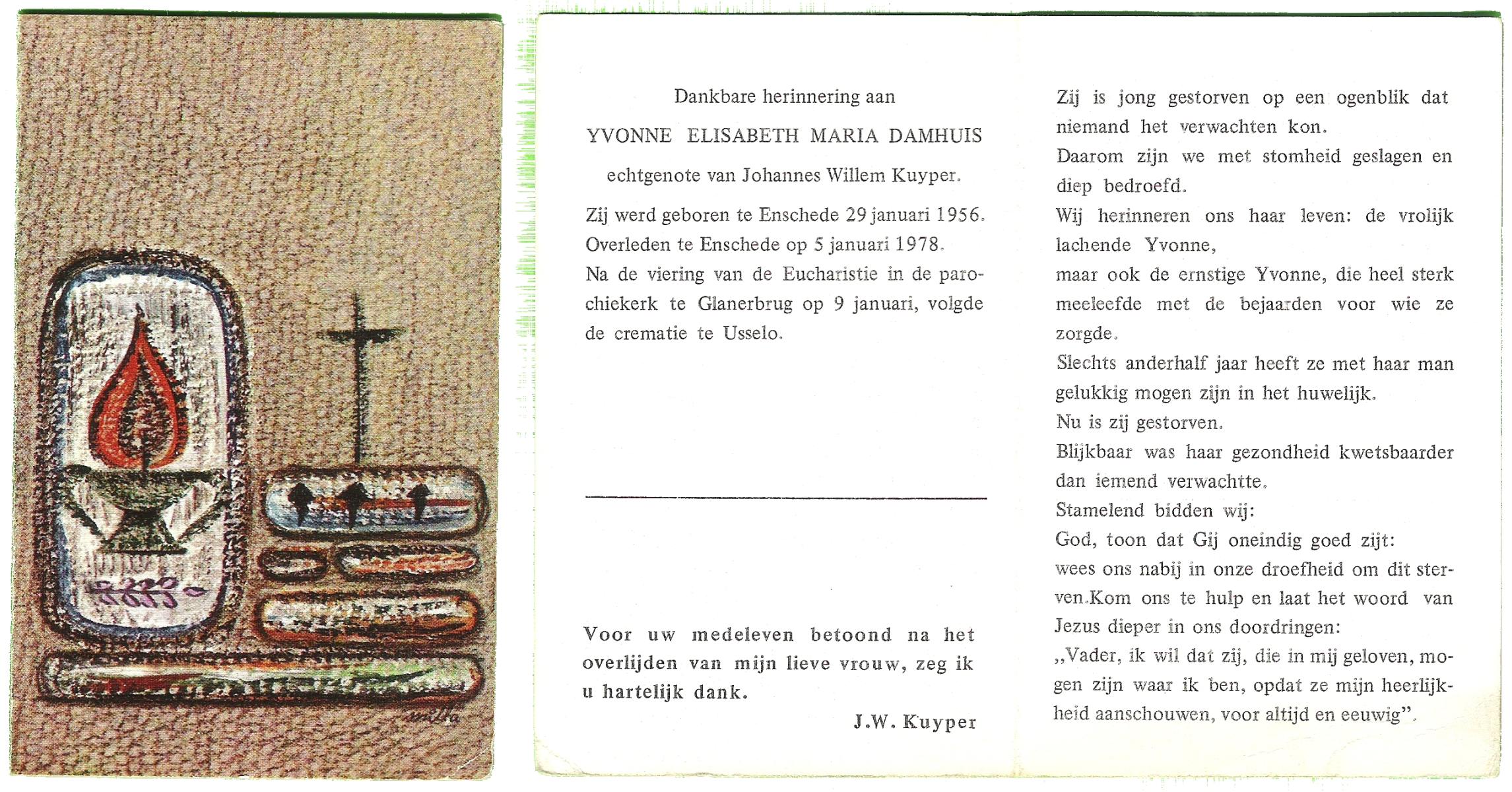 DAMHUIS, Alberta Maria Geertruida, geboren op 16-1-1910 te Nordhorn (Dld.), overleden op 20-10-1990 op 80-jarige leeftijd, gecremeerd op 24-10-1990 te Usselo.