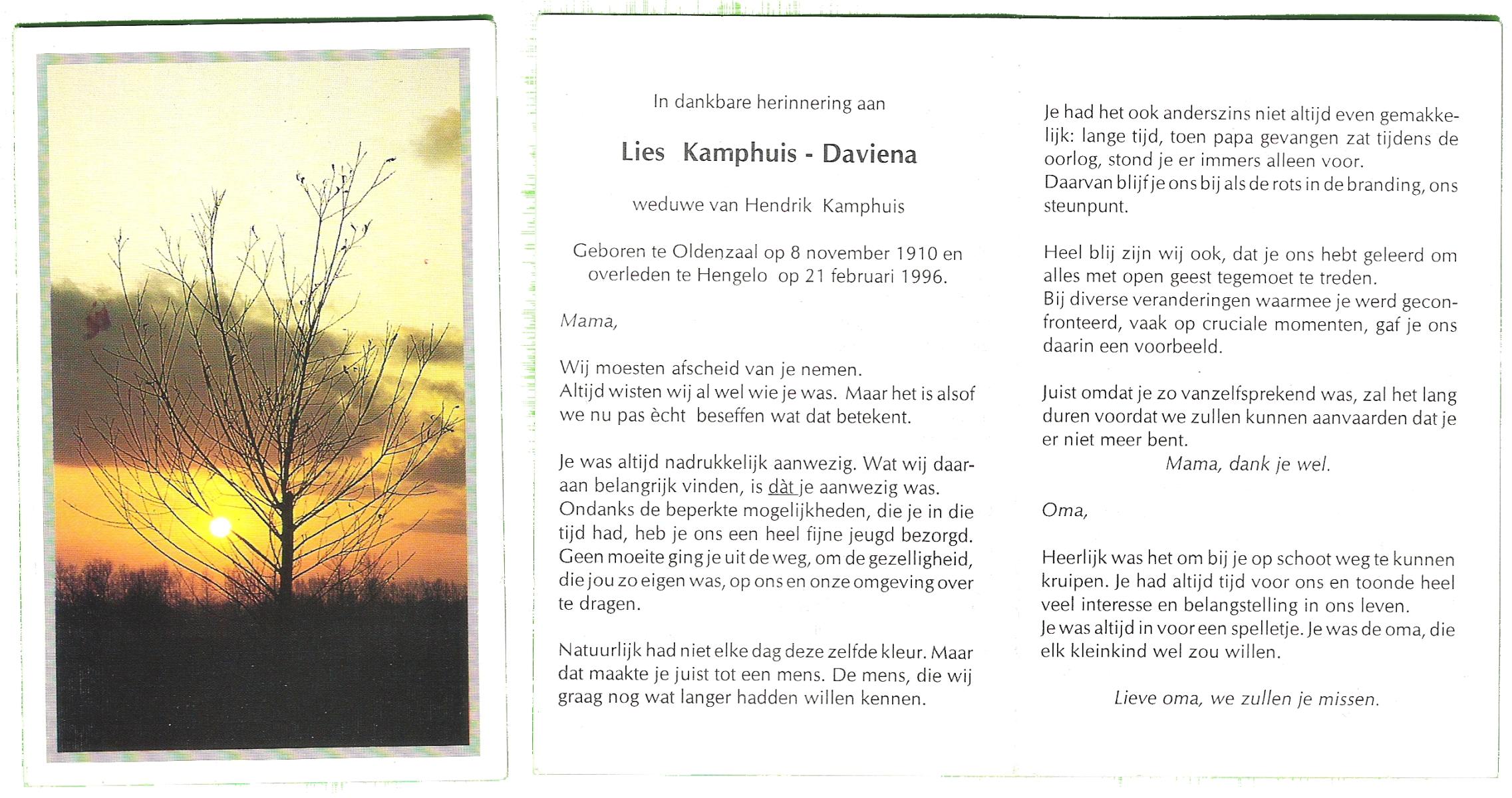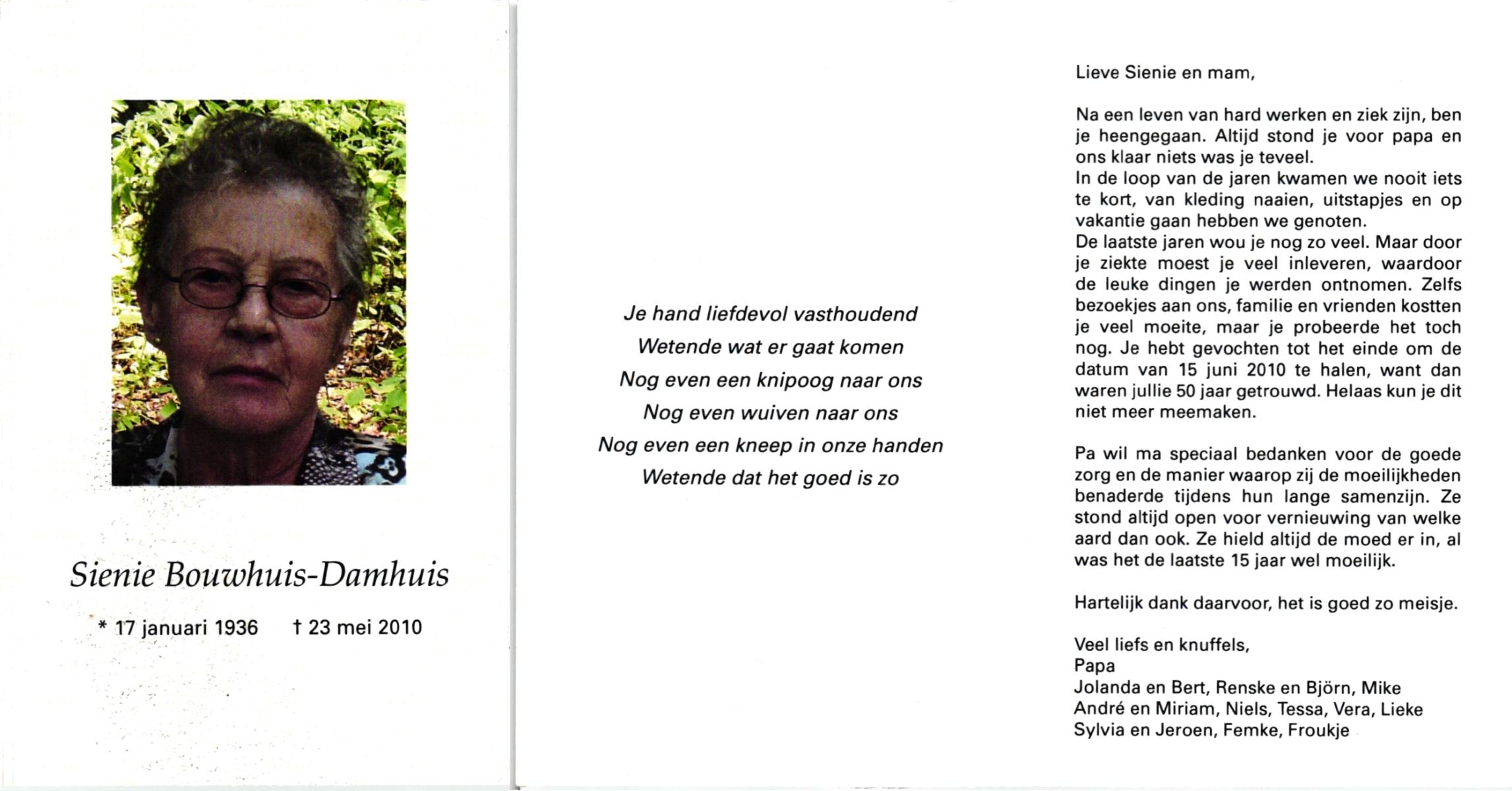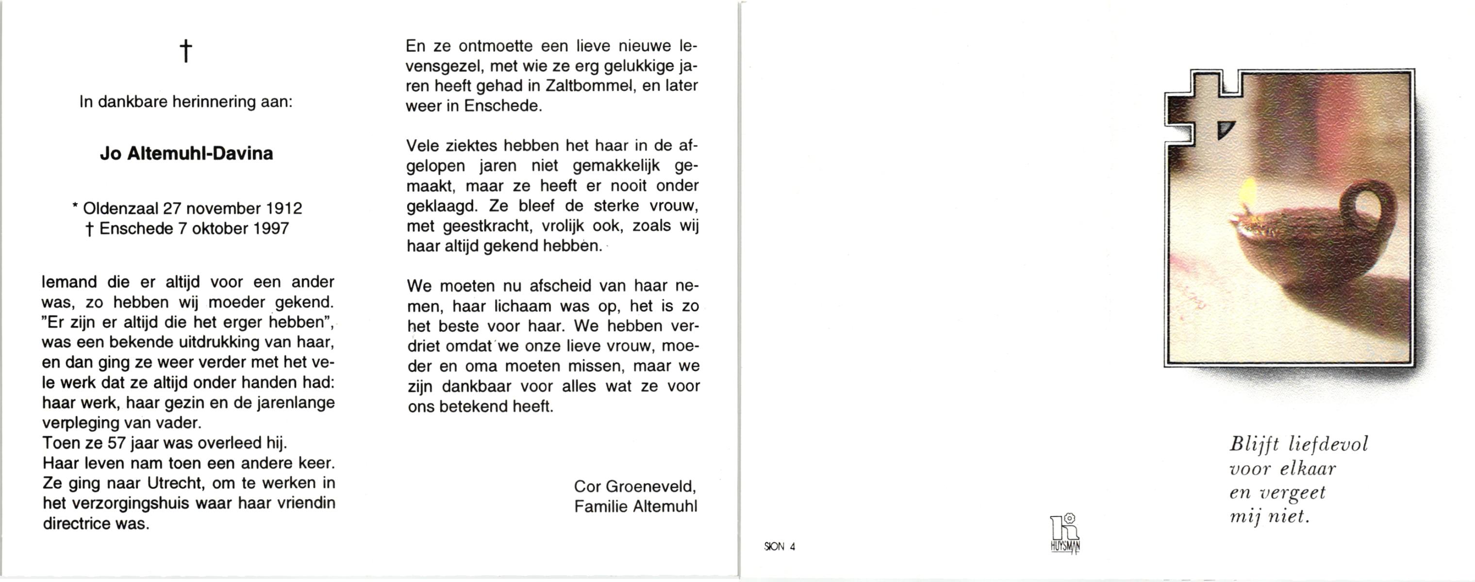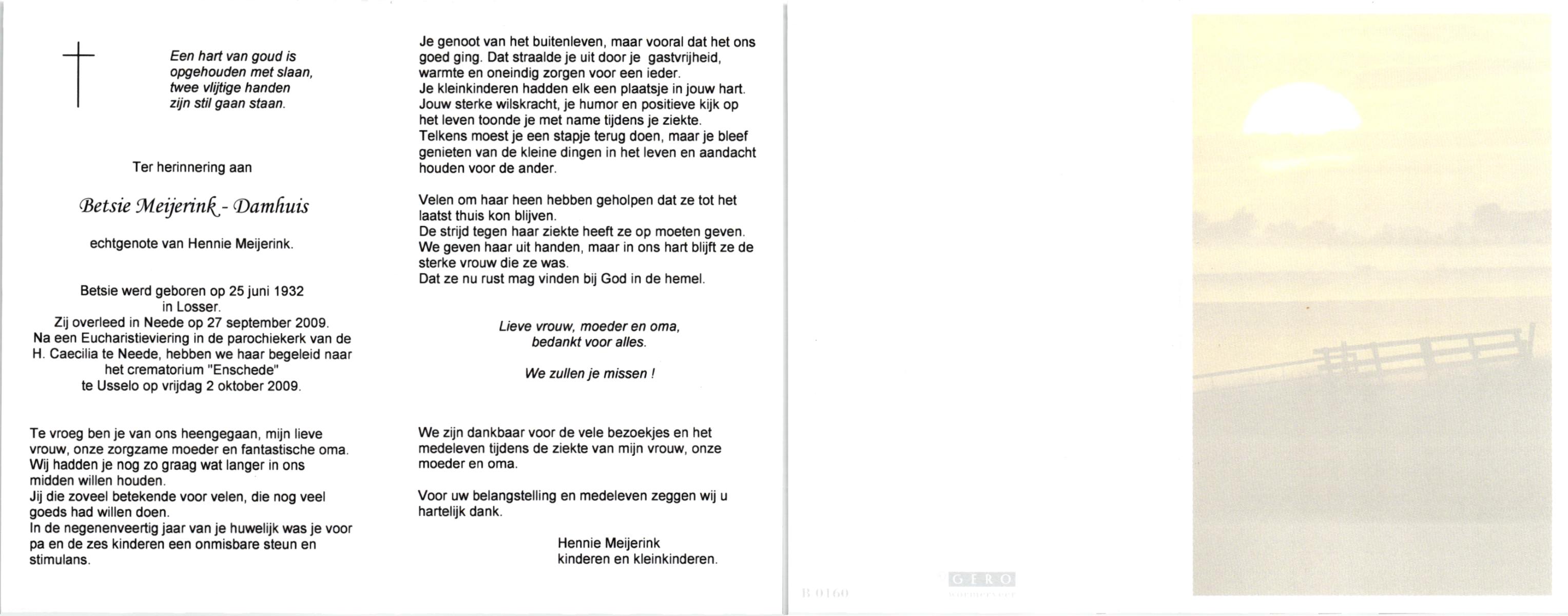 DAMHUIS, Alberta Maria Geertruida, geboren op 16-1-1910 te Nordhorn (Dld.), overleden op 20-10-1990 op 80-jarige leeftijd, gecremeerd op 24-10-1990 te Usselo.