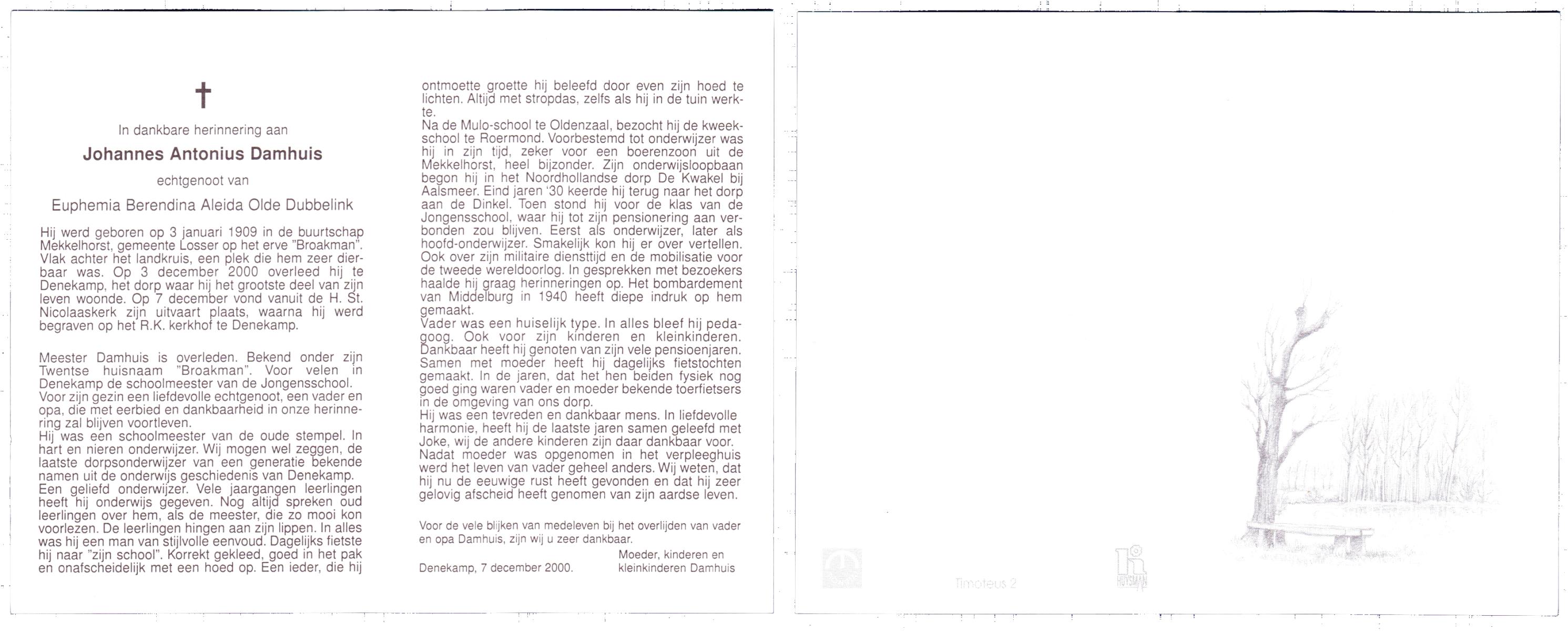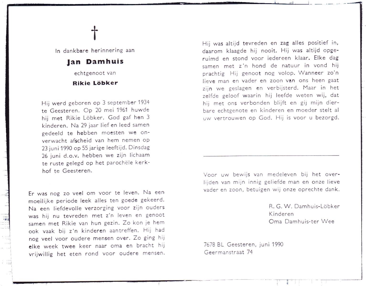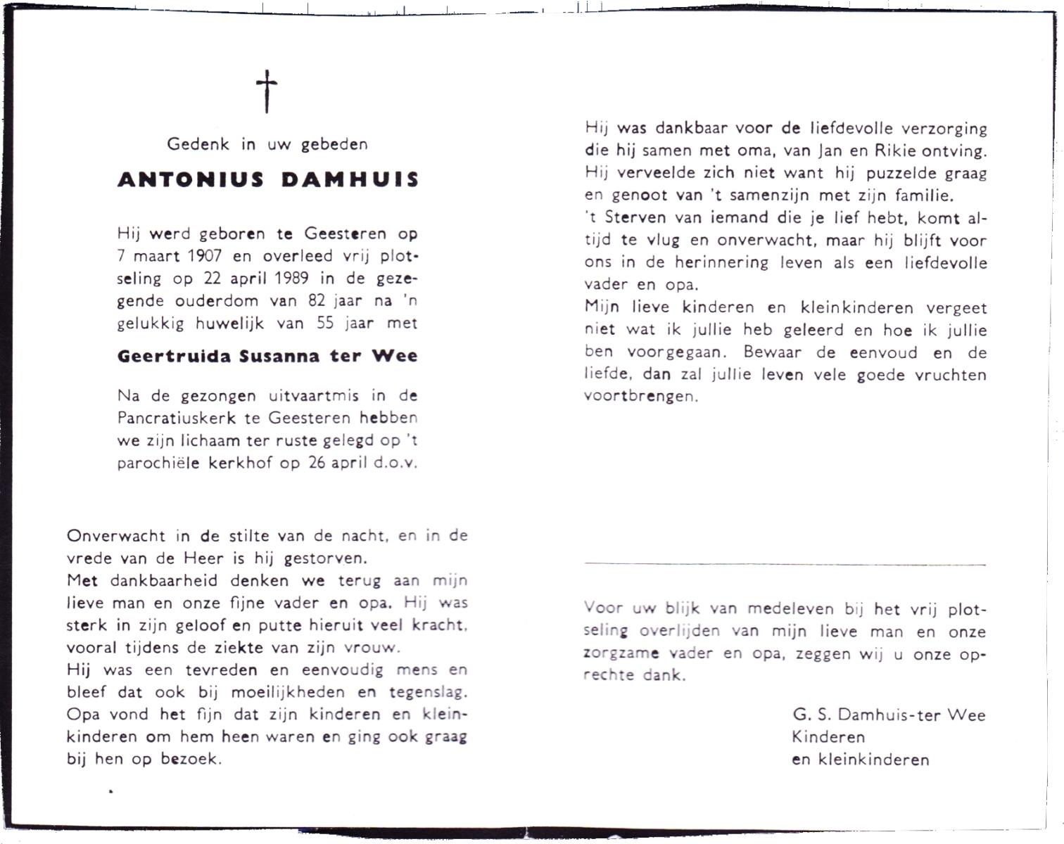 DAMHUIS, Antonius, geboren op 7-3-1907 te Geesteren (Ov.), overleden op 22-4-1989 te Geesteren op 82-jarige leeftijd, begraven op 26-4-1989 te Geesteren R.K.kerkhof.