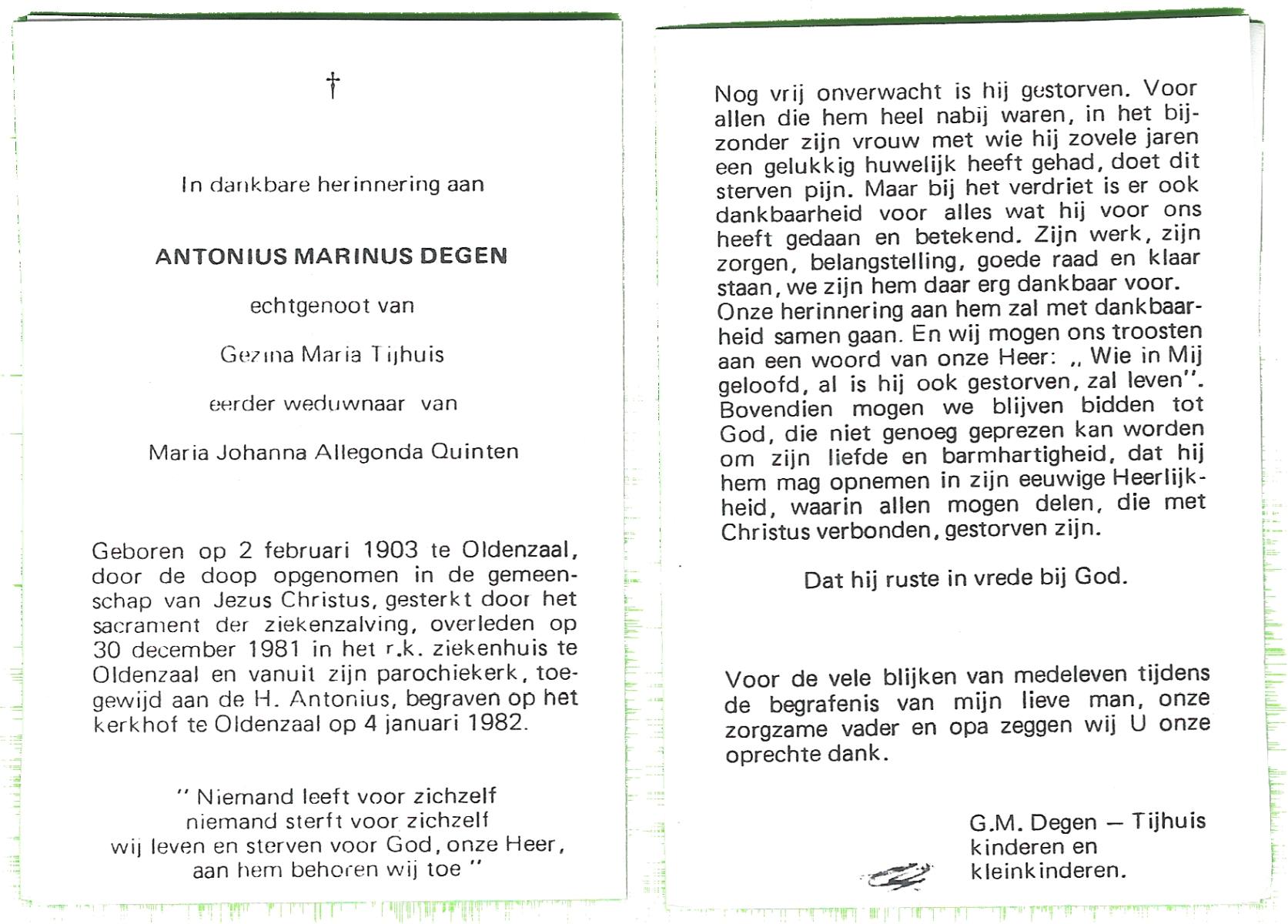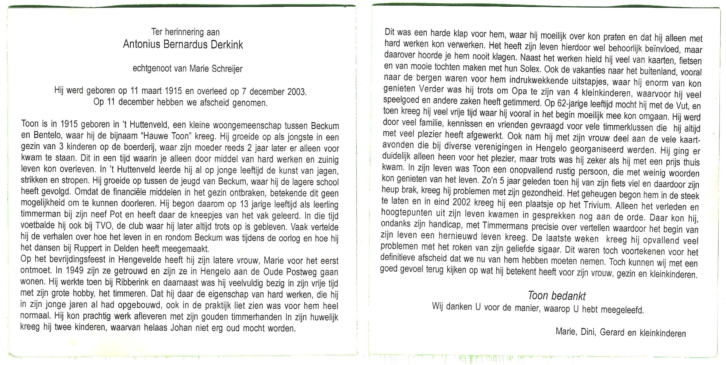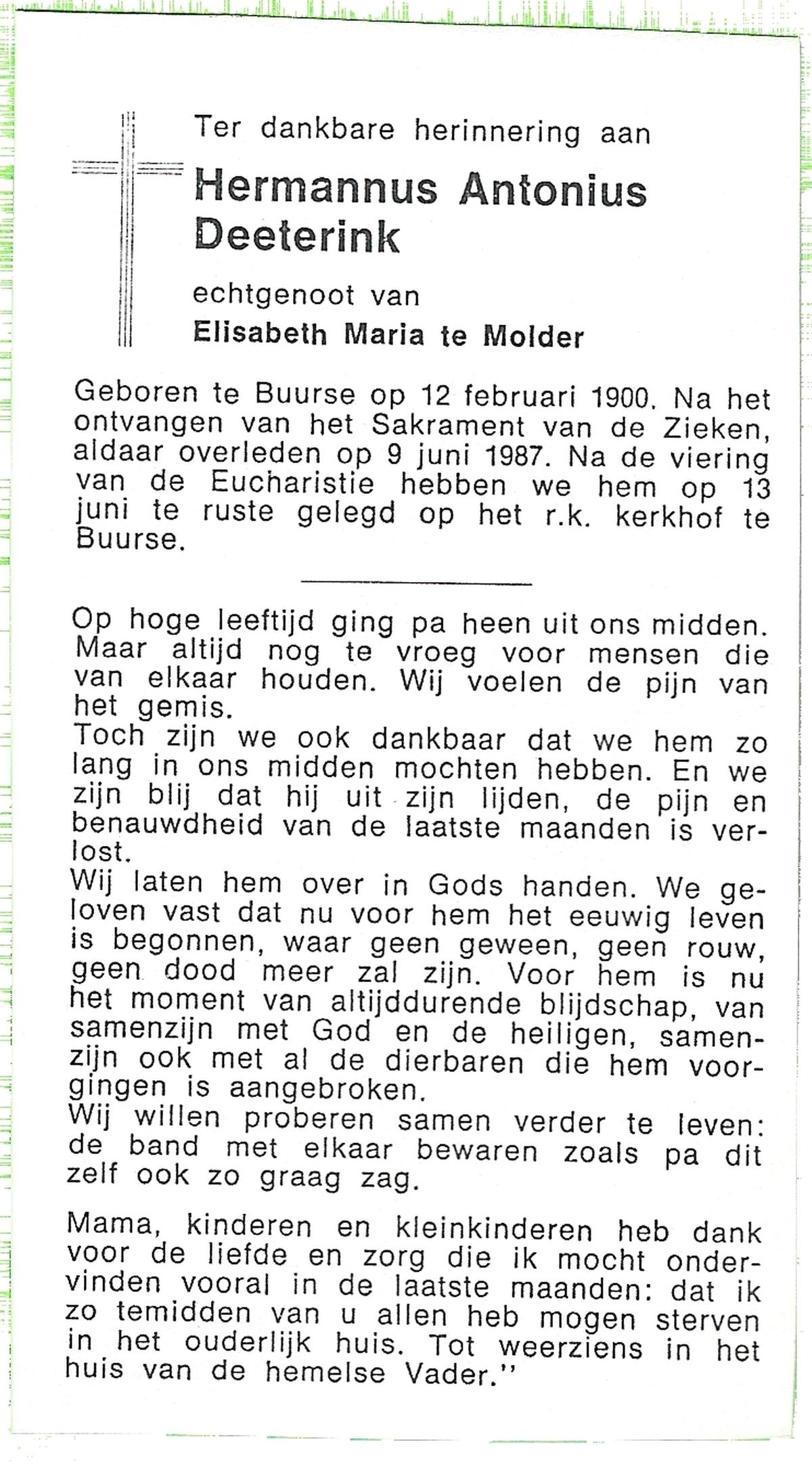 DAMHUIS, Antonius, geboren op 7-3-1907 te Geesteren (Ov.), overleden op 22-4-1989 te Geesteren op 82-jarige leeftijd, begraven op 26-4-1989 te Geesteren R.K.kerkhof.