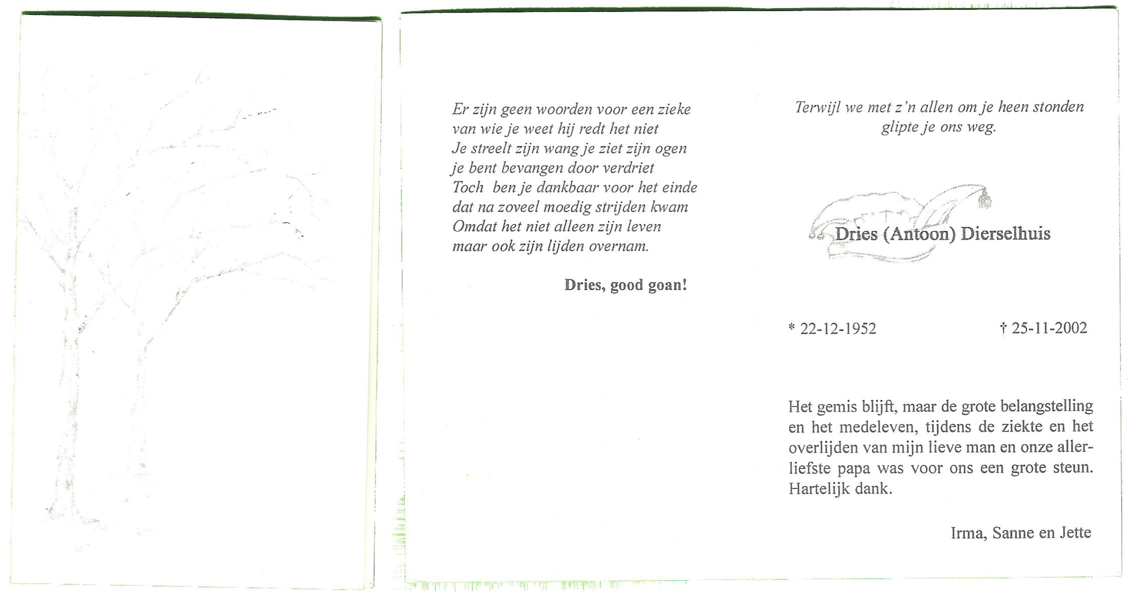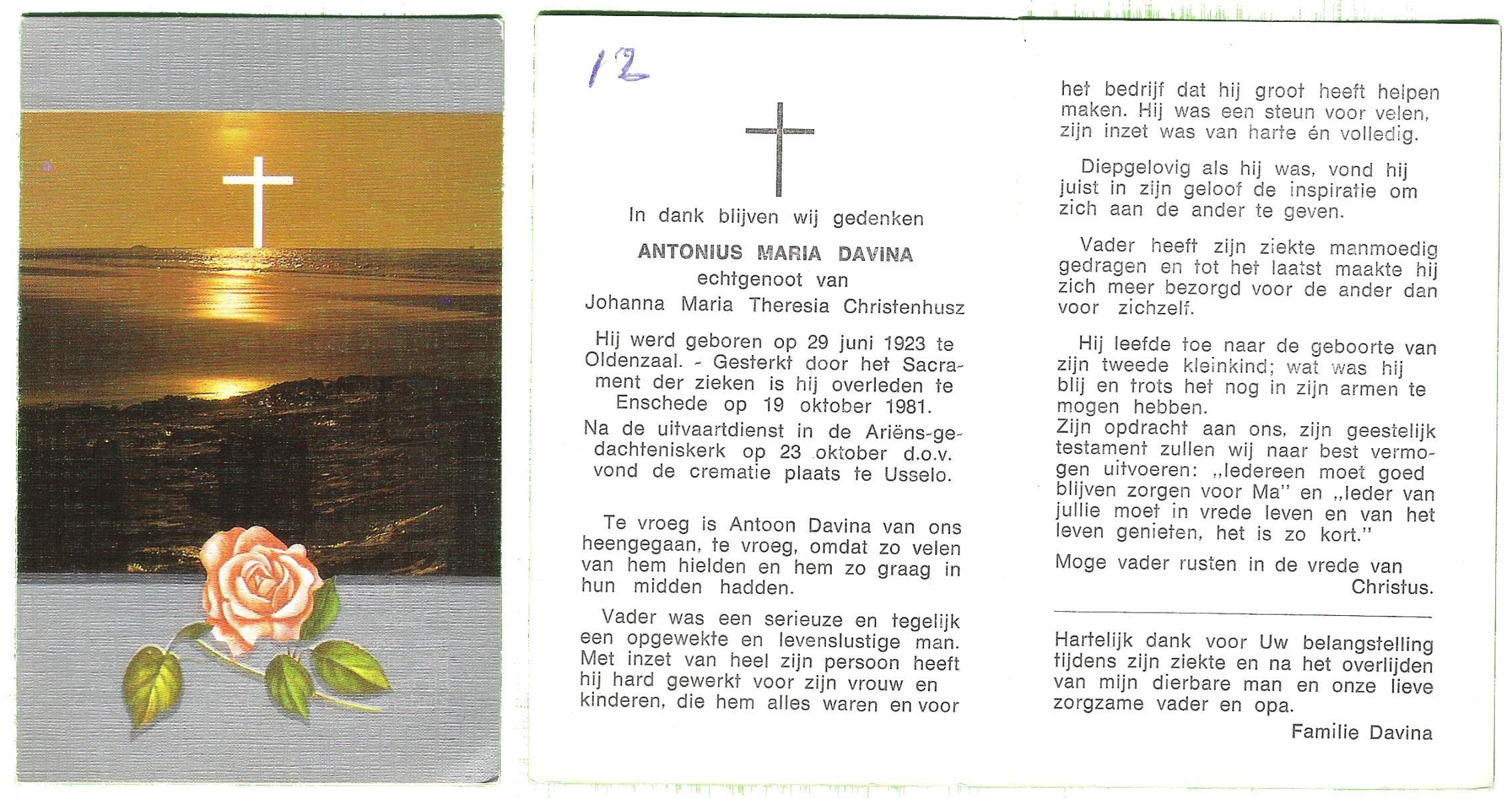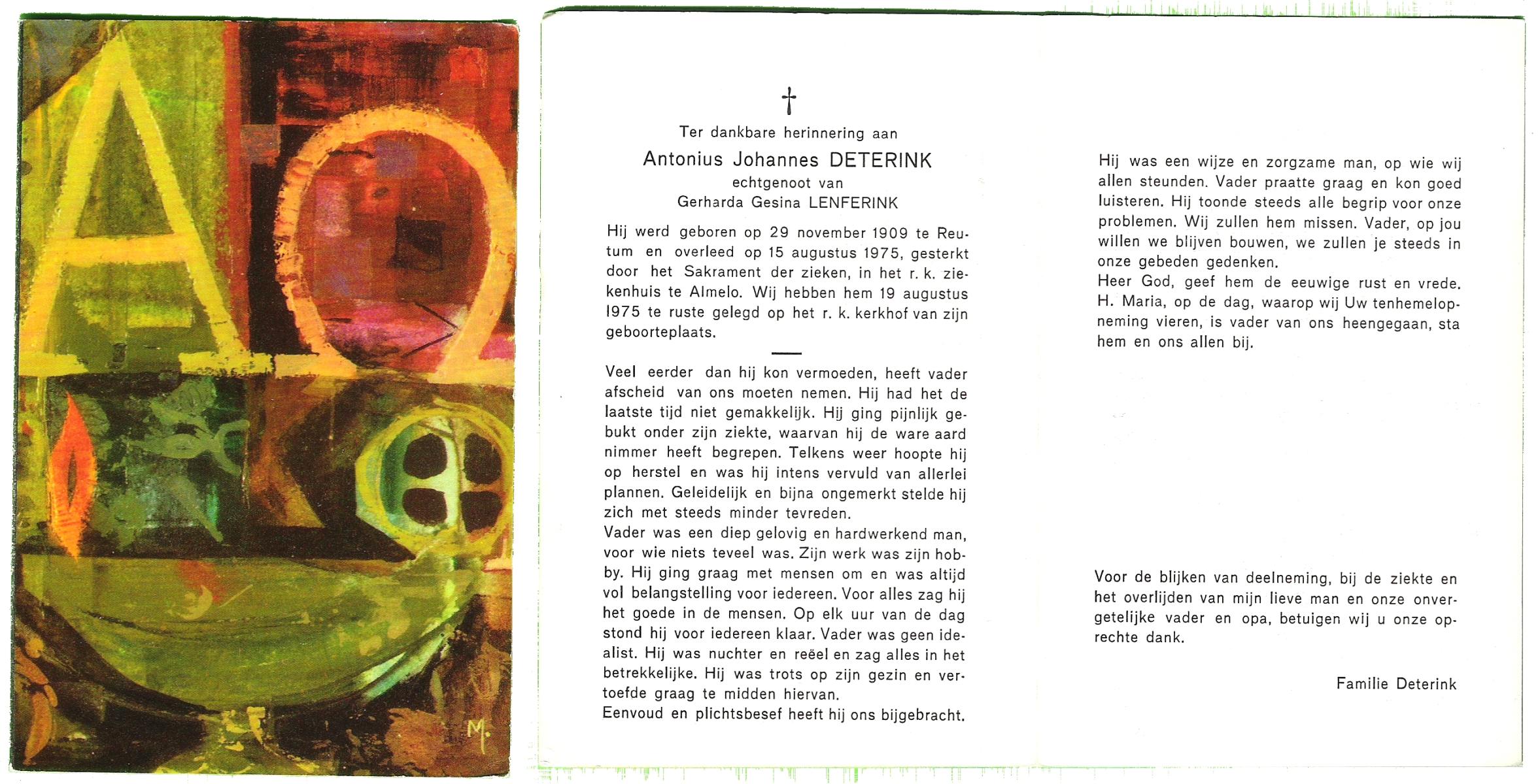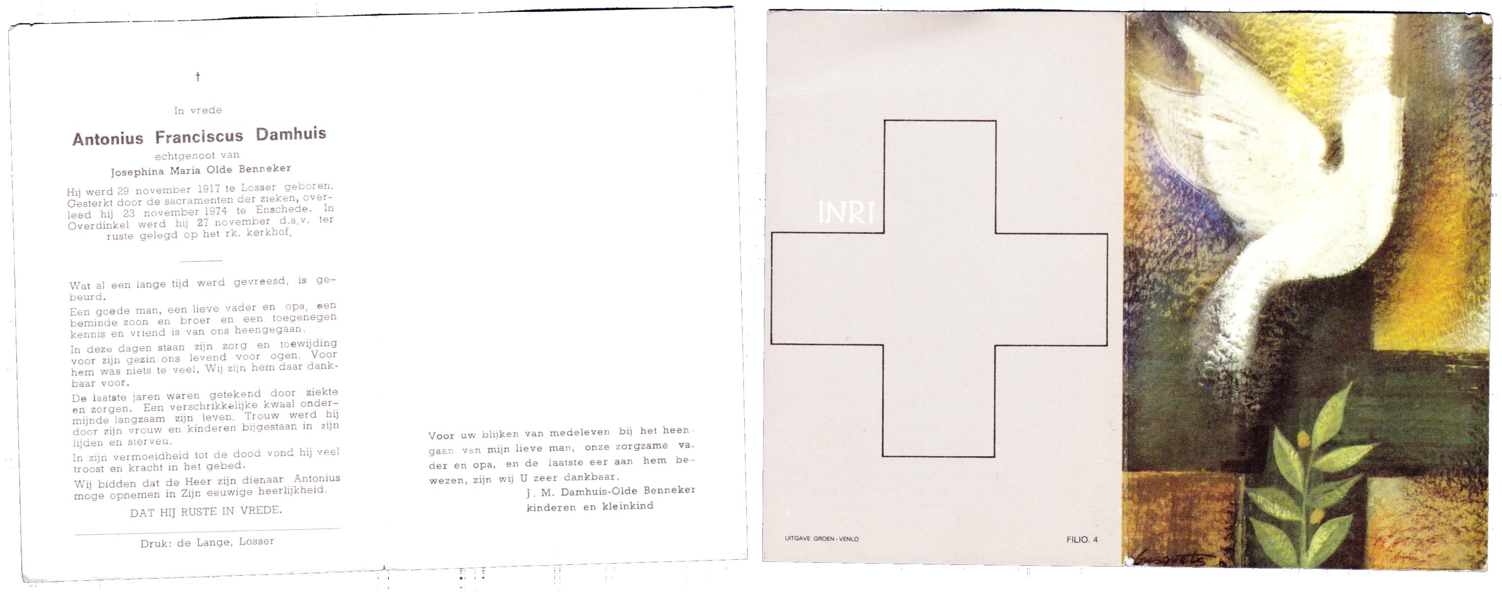 DAMHUIS, Antonius Franciscus, geboren op 29-11-1917 te Losser, overleden op 23-11-1974 te Enschede op 56-jarige leeftijd, begraven op 27-11-1974 te Overdinkel.