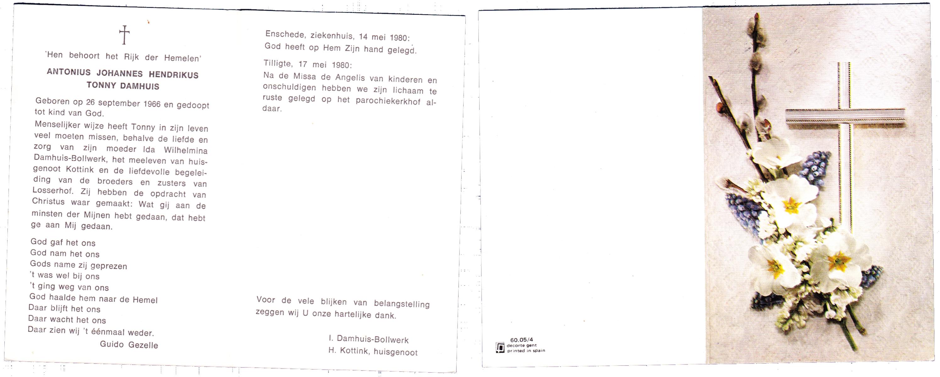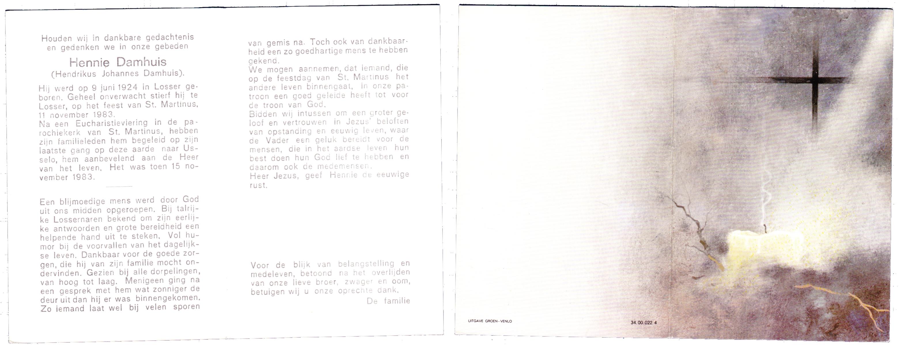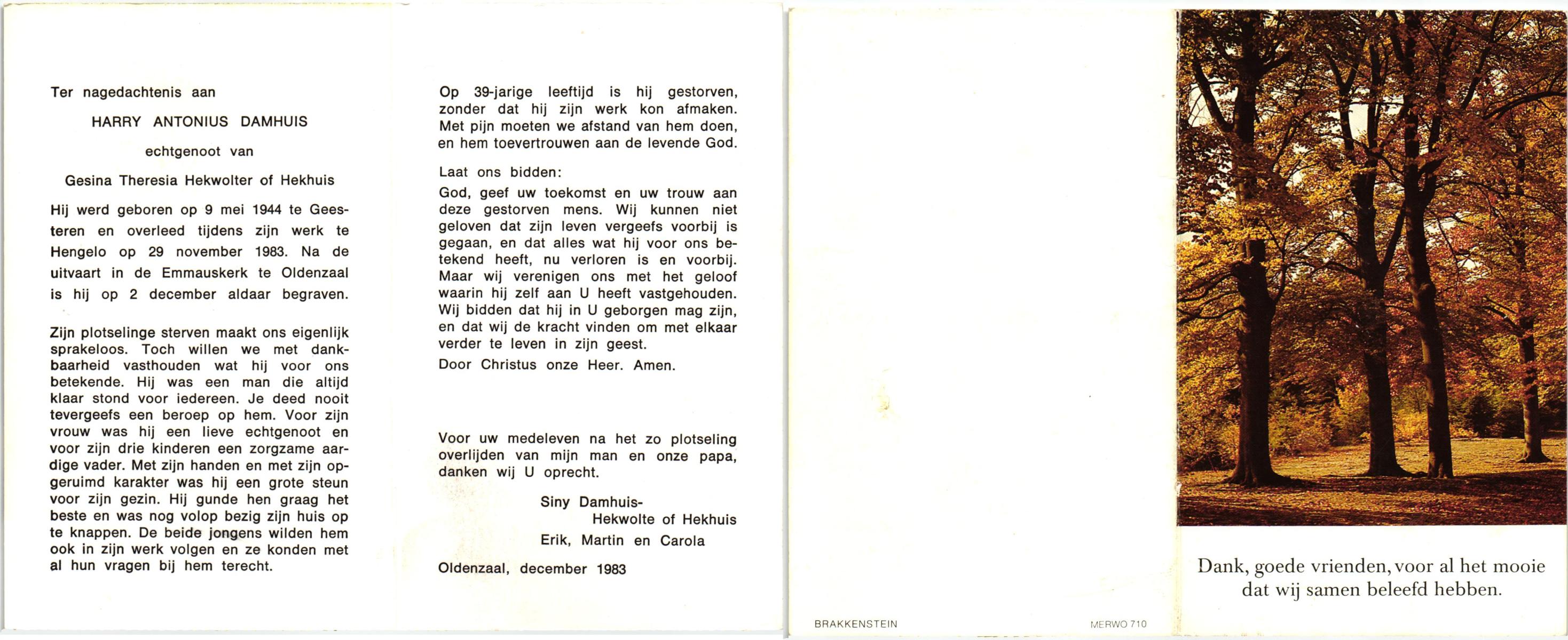 DAMHUIS, Harry Antonius, geboren op 9-5-1944 te Geesteren, overleden op 29-11-1983 te Hengelo op 39-jarige leeftijd, begraven op 2-12-1983 te Oldenzaal.