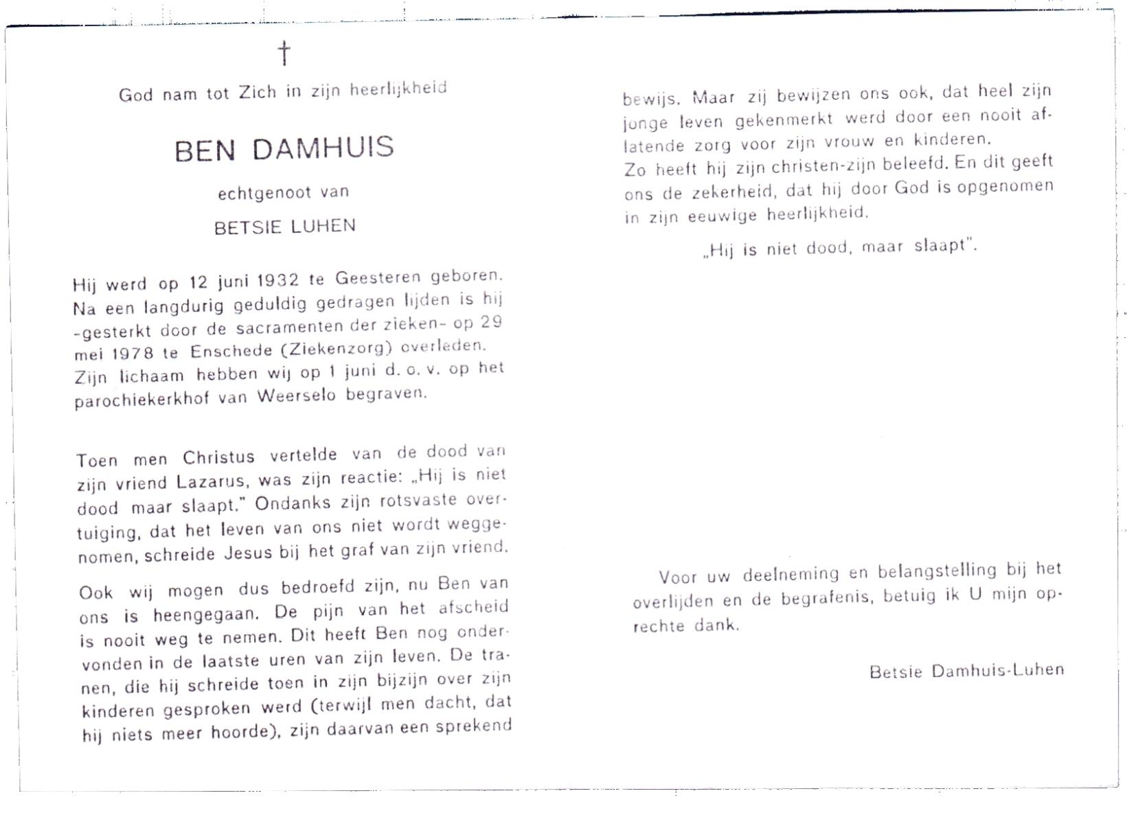DAMHUIS, Ben, geboren op 12-6-1932 te Geesteren (Ov.), overleden op 29-5-1978 te Enschede op 45-jarige leeftijd, begraven op 1-6-1978 te Weerselo.