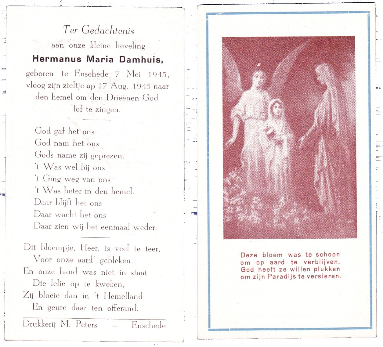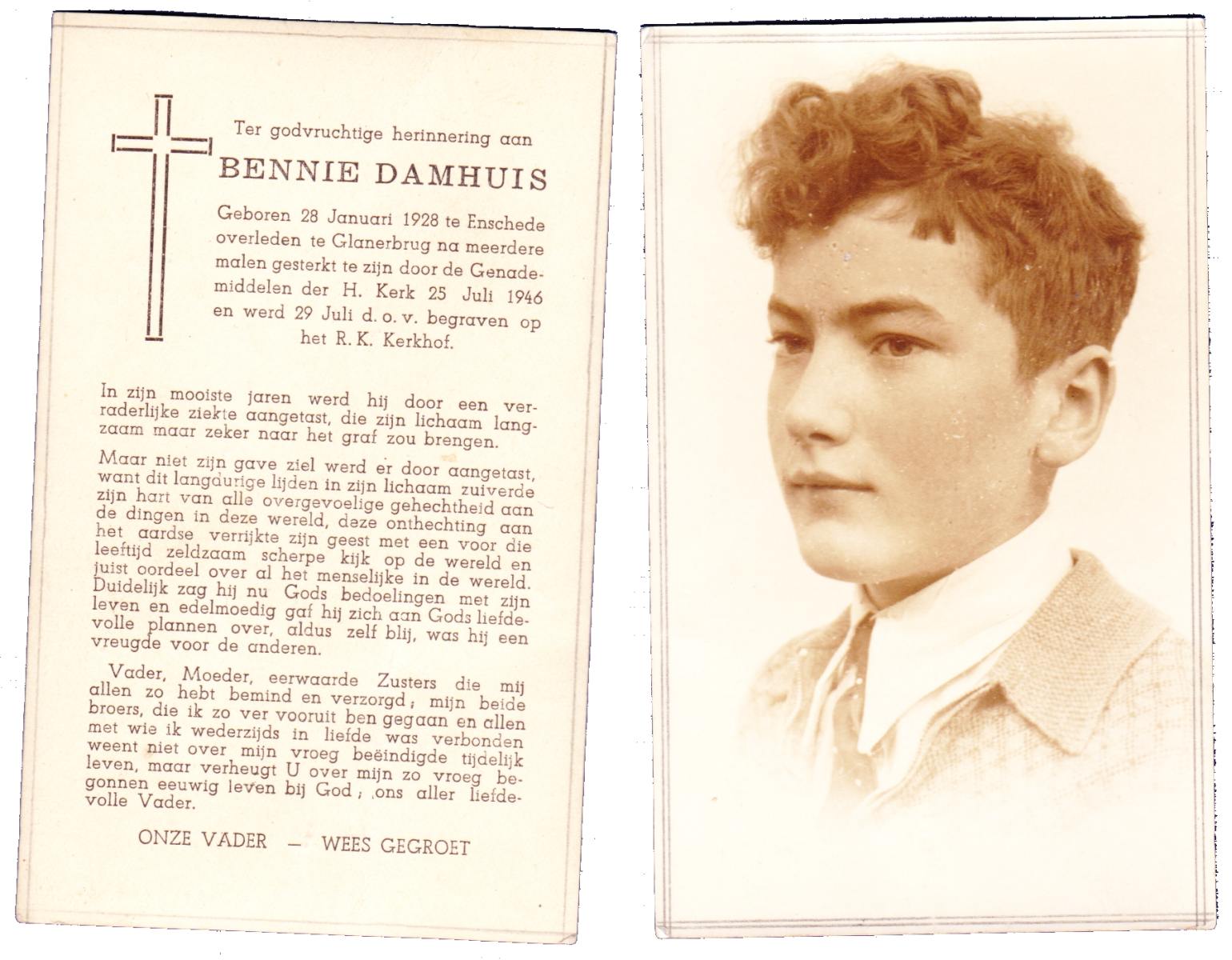 DAMHUIS, Bennie, geboren op 28-1-1928 te Enschede, overleden op 25-7-1946 te Glanerbrug op 18-jarige leeftijd, begraven op 29-7-1946 te Glanerbrug.