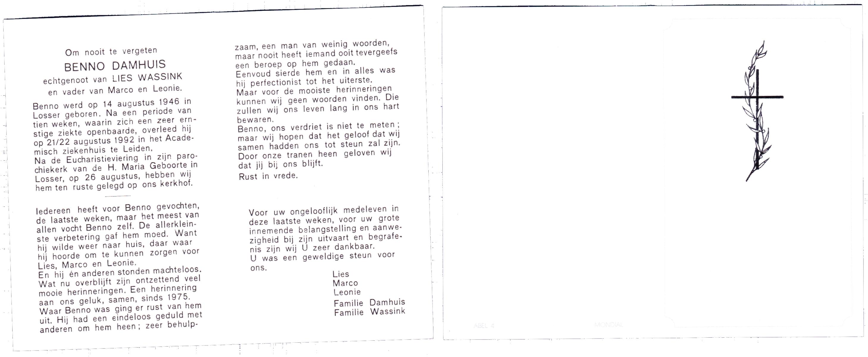 DAMHUIS, Benno, geboren op 14-8-1946 te Losser, overleden op 22-8-1992 te Leiden op 46-jarige leeftijd, begraven op 26-8-1992 te Losser.