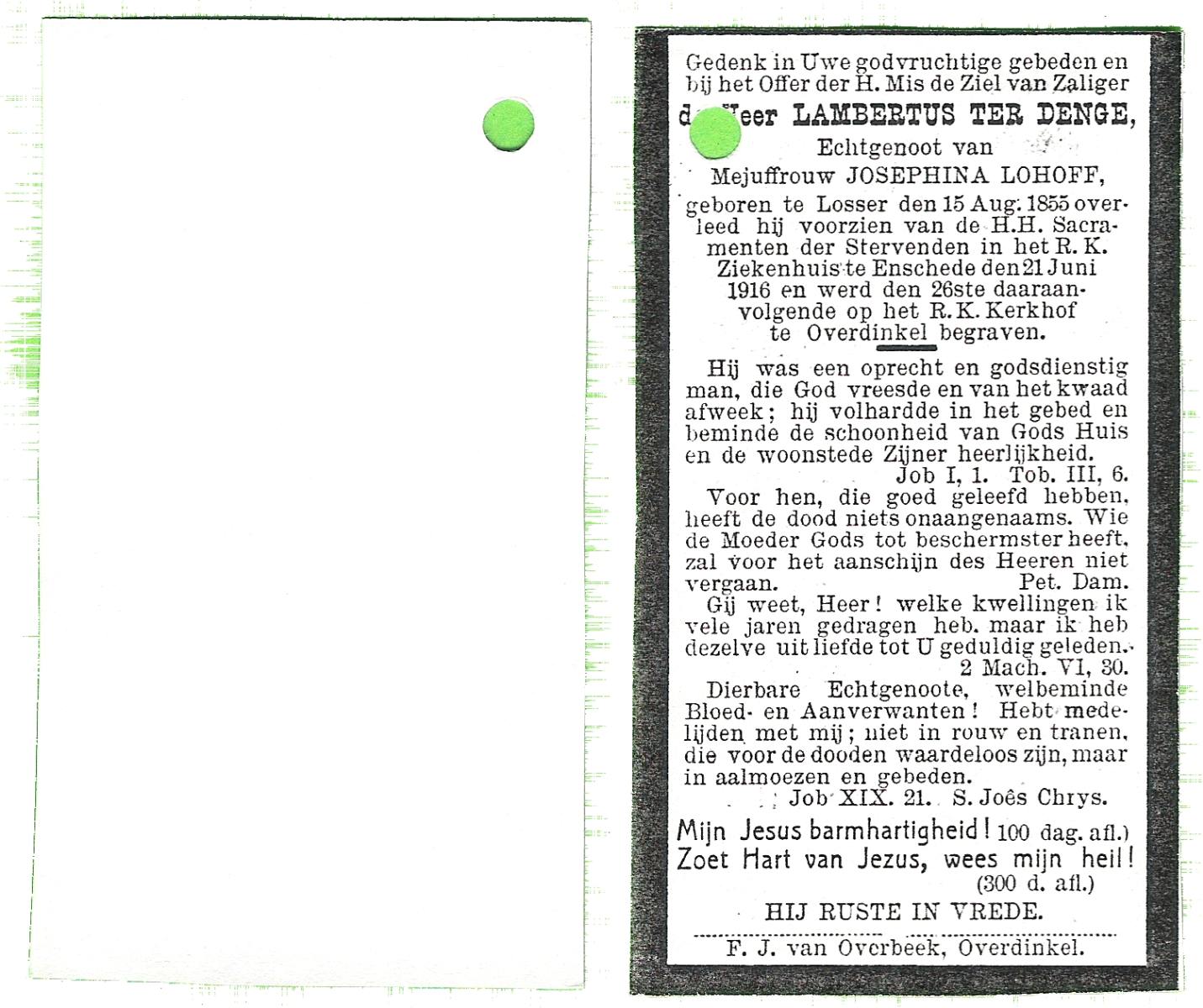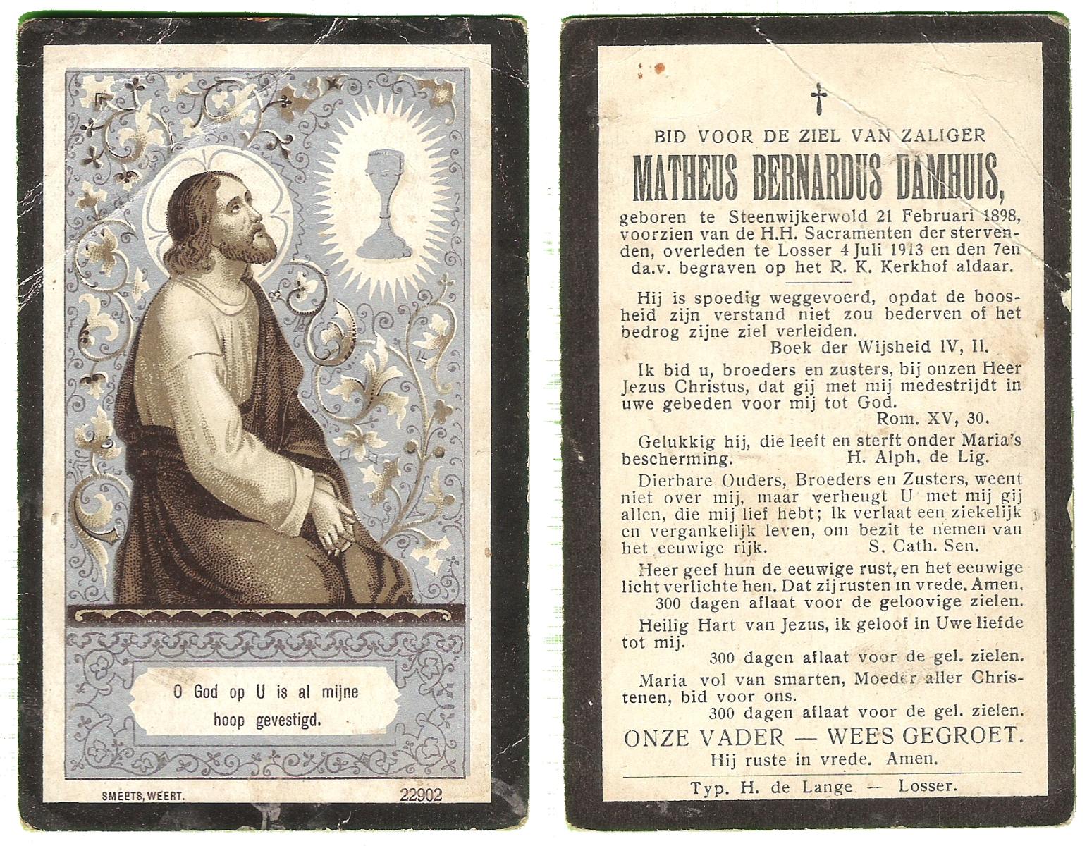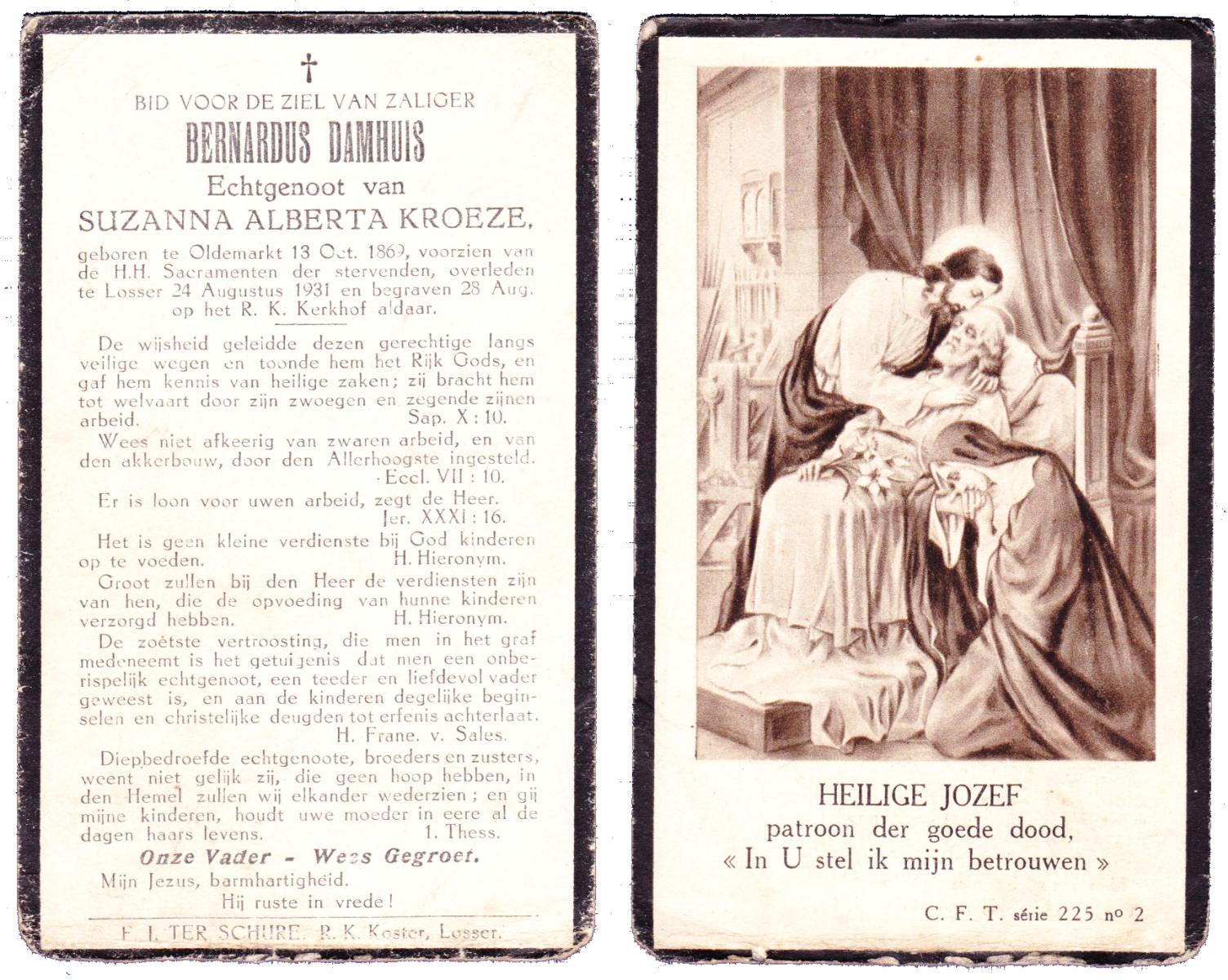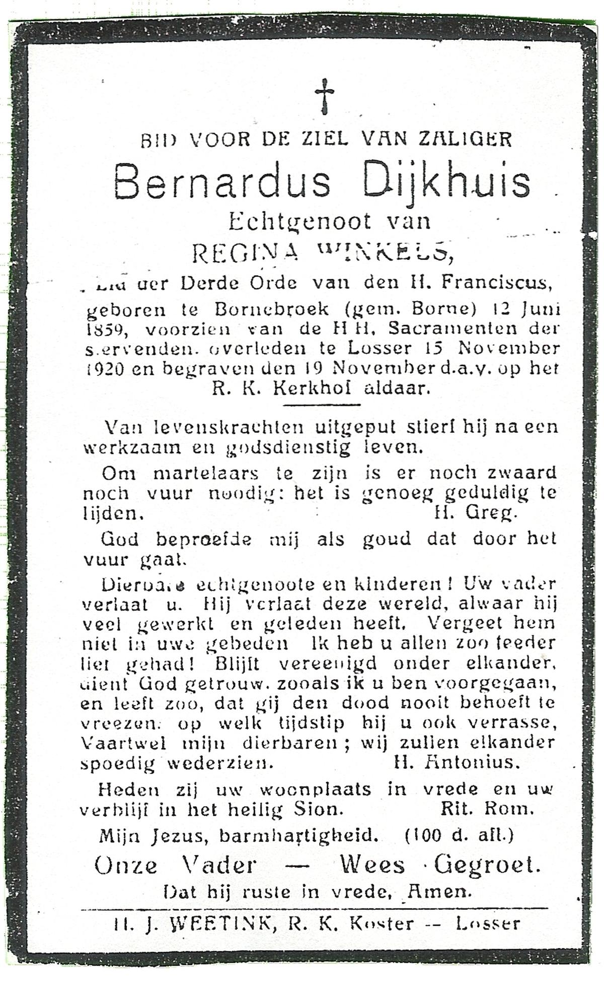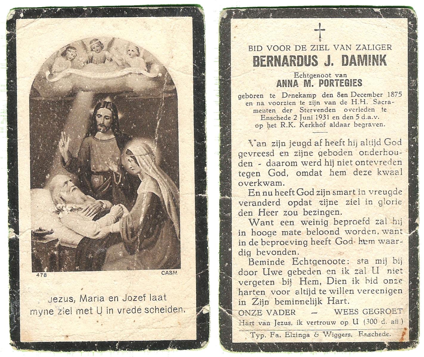 DAMHUIS, Bernardus, geboren op 13-10-1869 te Oldemarkt, overleden op 24-8-1931 te Losser op 61-jarige leeftijd, begraven op 28-8-1931 te Losser.