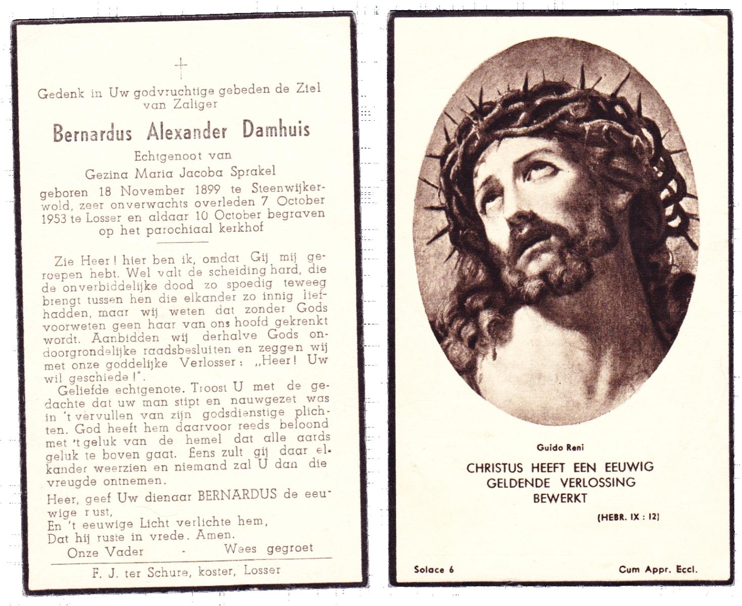 DAMHUIS, Bernardus Alexander, geboren op 18-11-1899 te Steenwijkerwold, overleden op 7-10-1953 te Losser op 53-jarige leeftijd, begraven op 10-10-1953 te Losser.