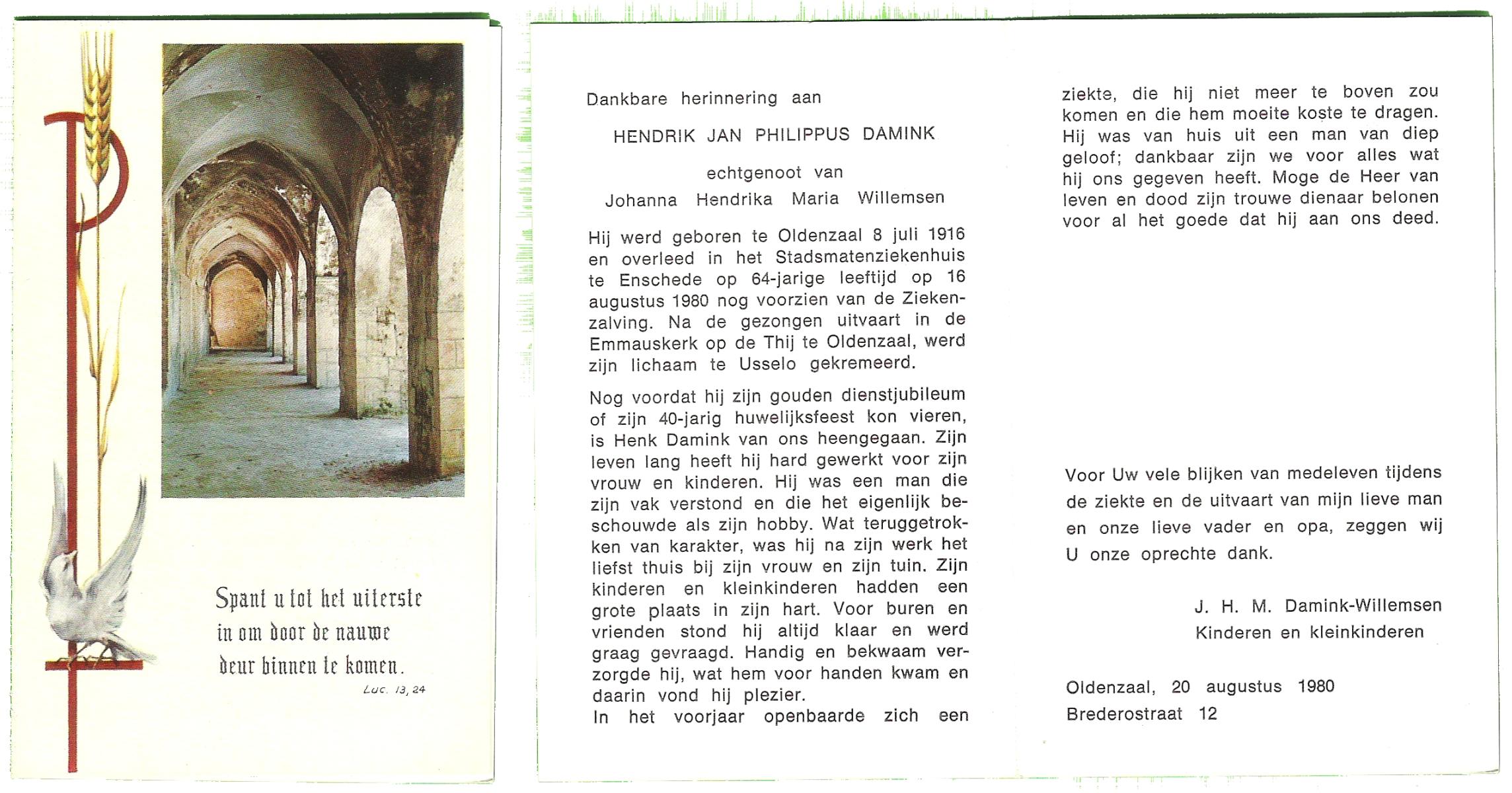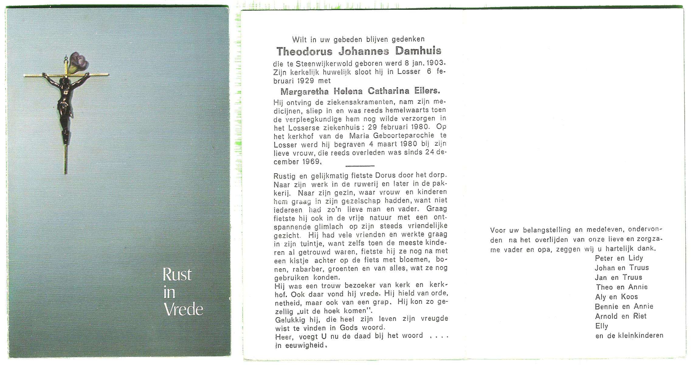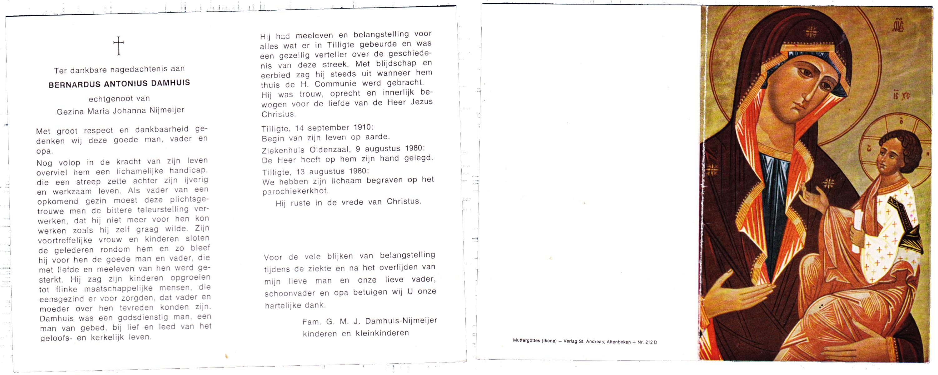 DAMHUIS, Bernardus Antonius, geboren op 14-9-1910 te Tilligte, overleden op 9-8-1980 te Oldenzaal op 69-jarige leeftijd, begraven op 13-8-1980 te Tilligte.