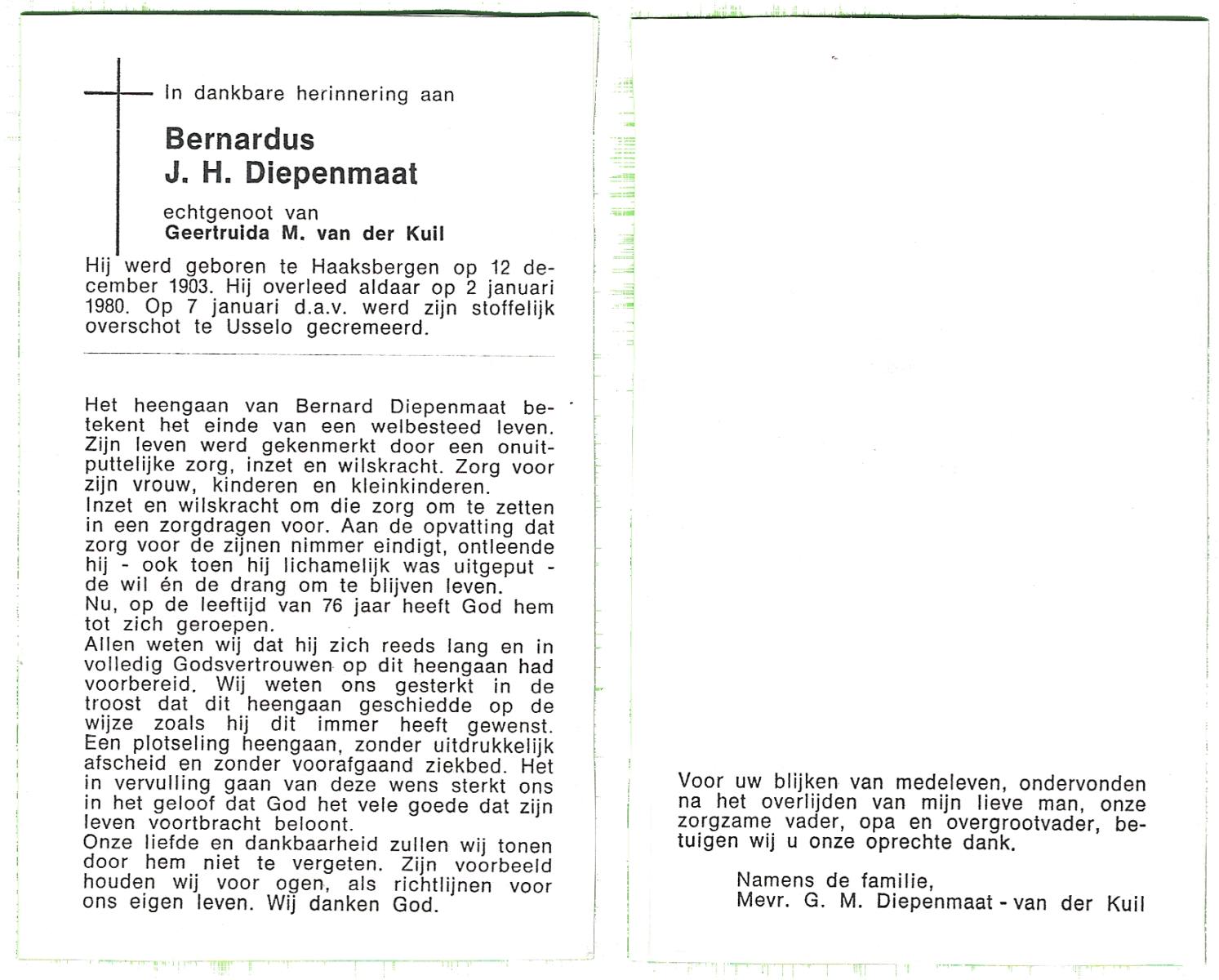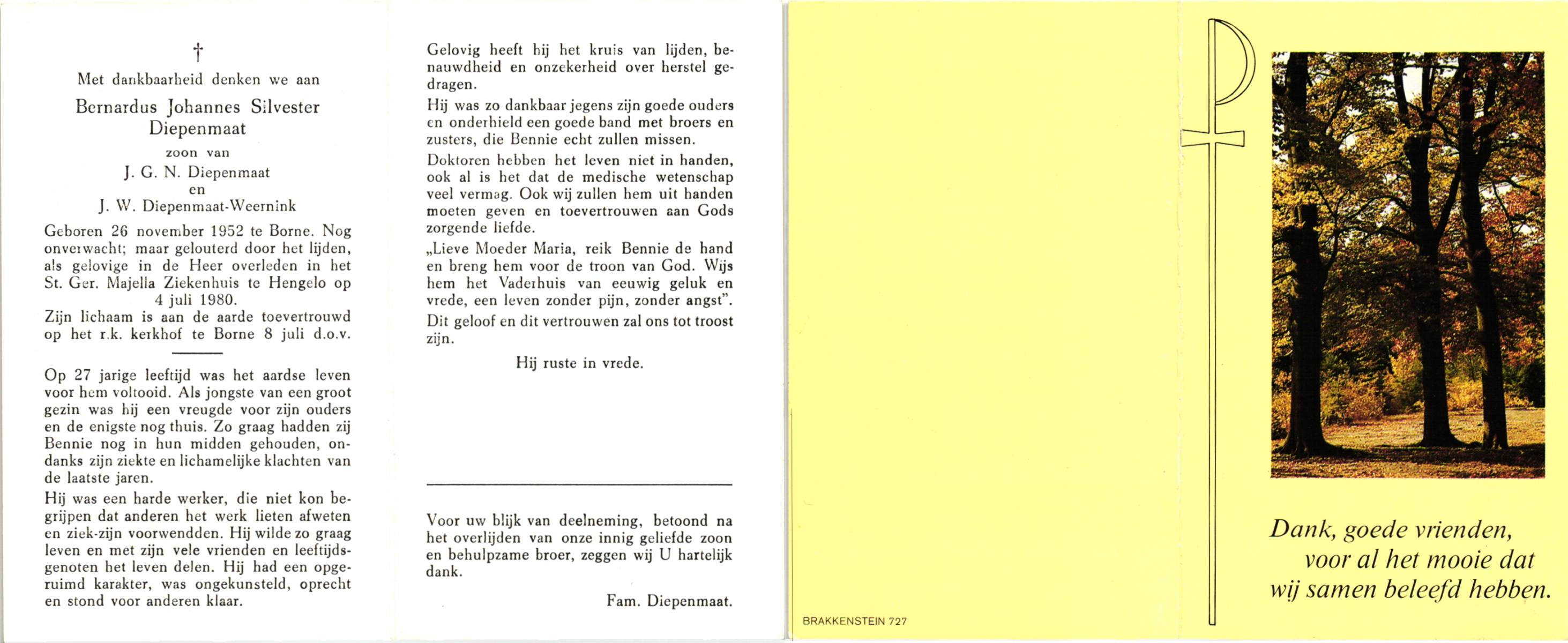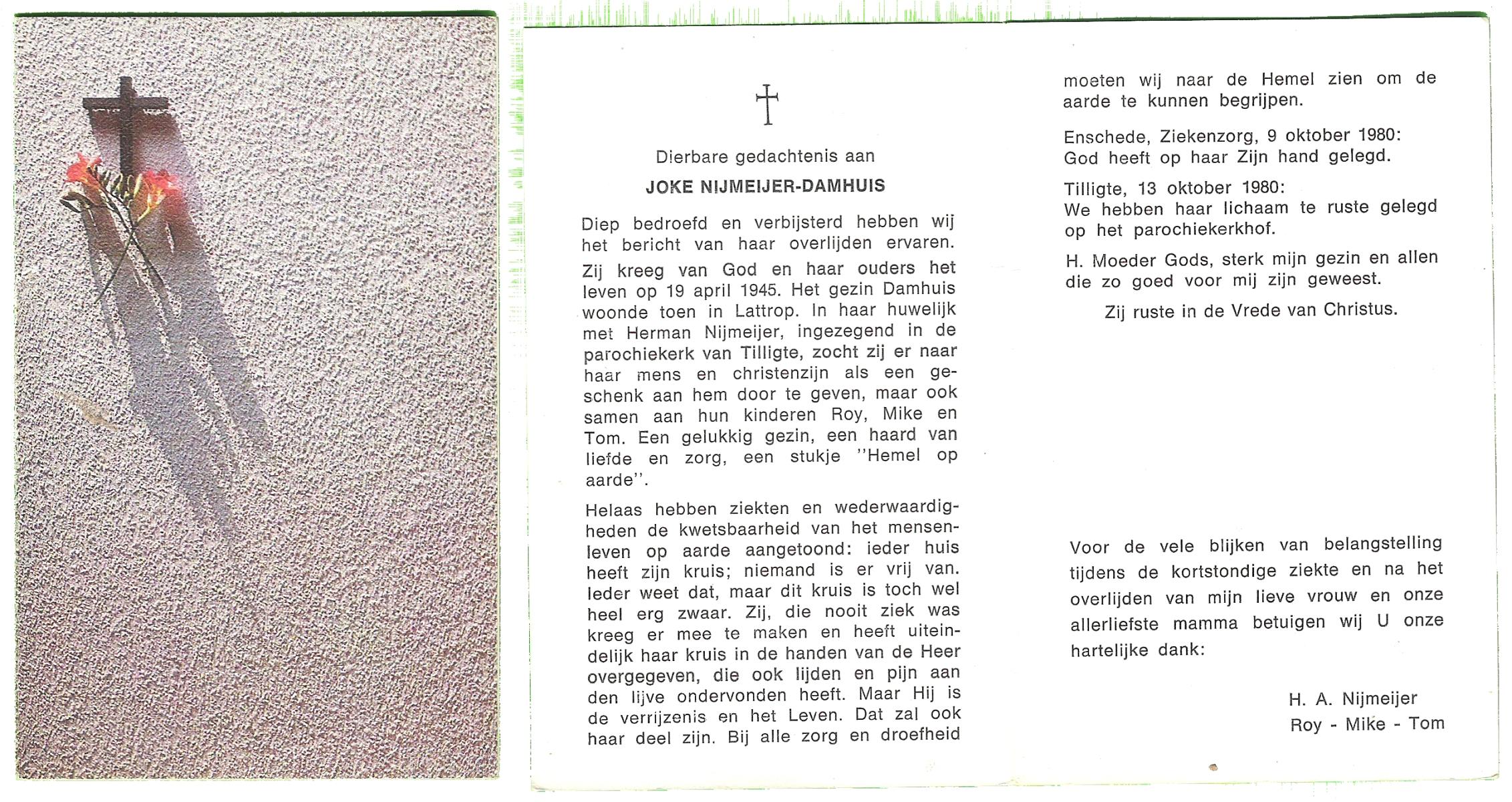 DAMHUIS, Bernardus Antonius, geboren op 14-9-1910 te Tilligte, overleden op 9-8-1980 te Oldenzaal op 69-jarige leeftijd, begraven op 13-8-1980 te Tilligte.
