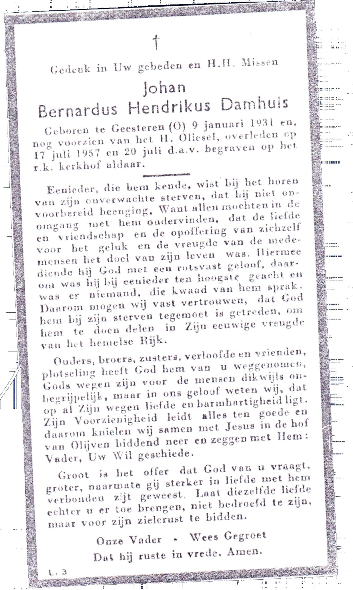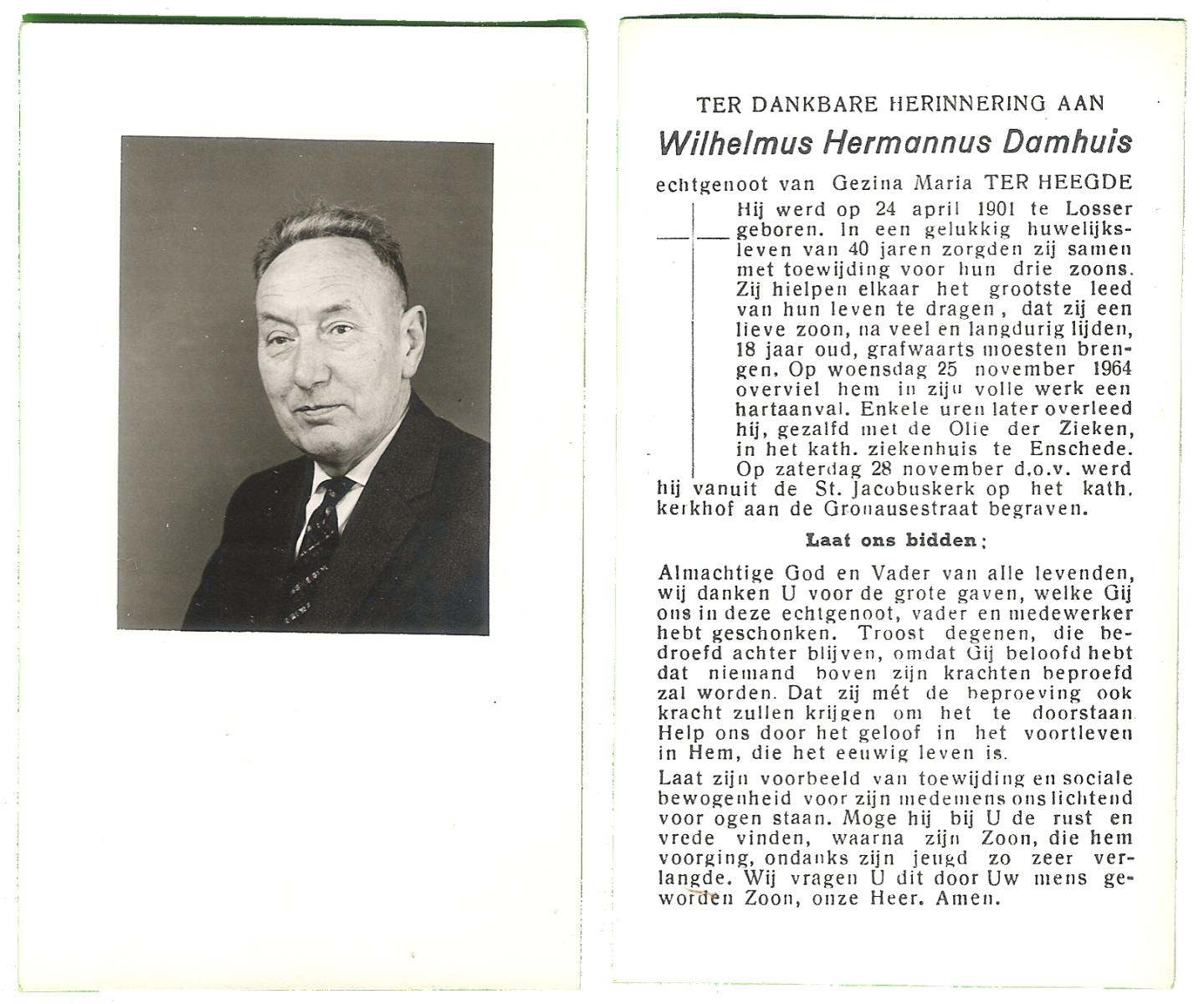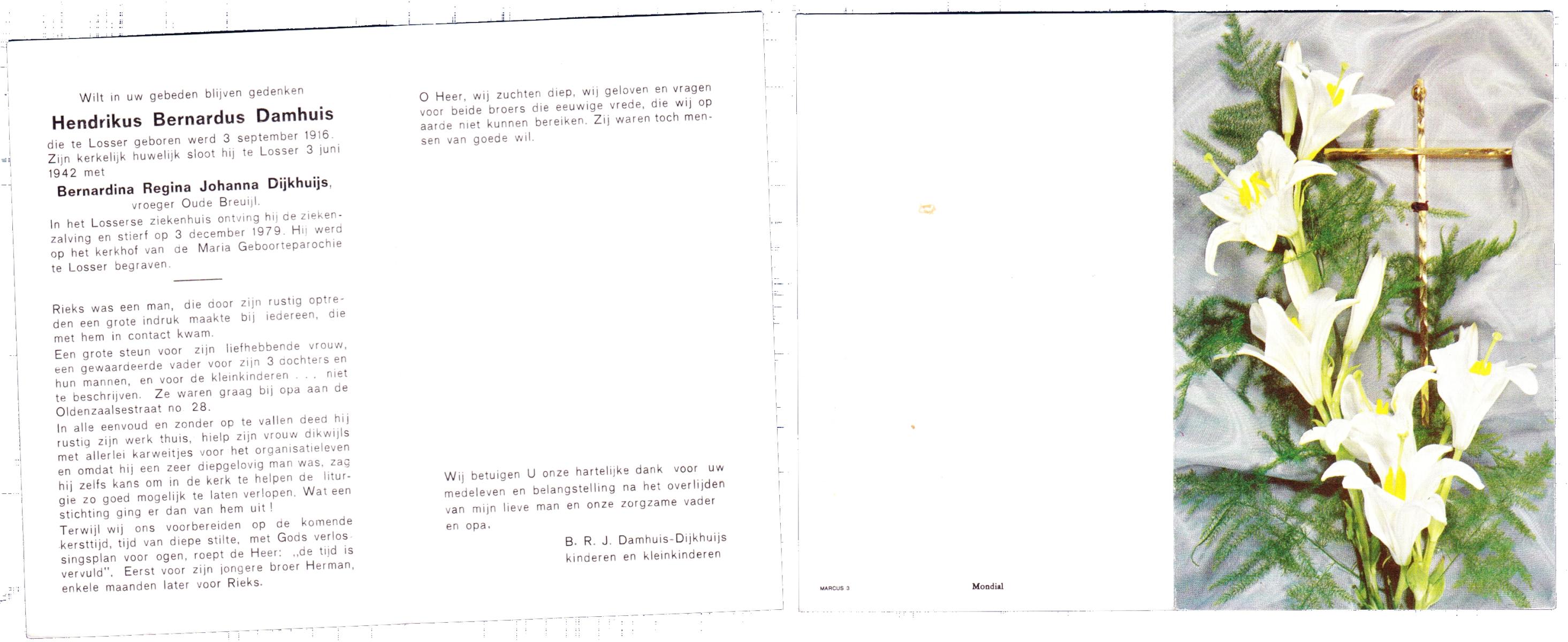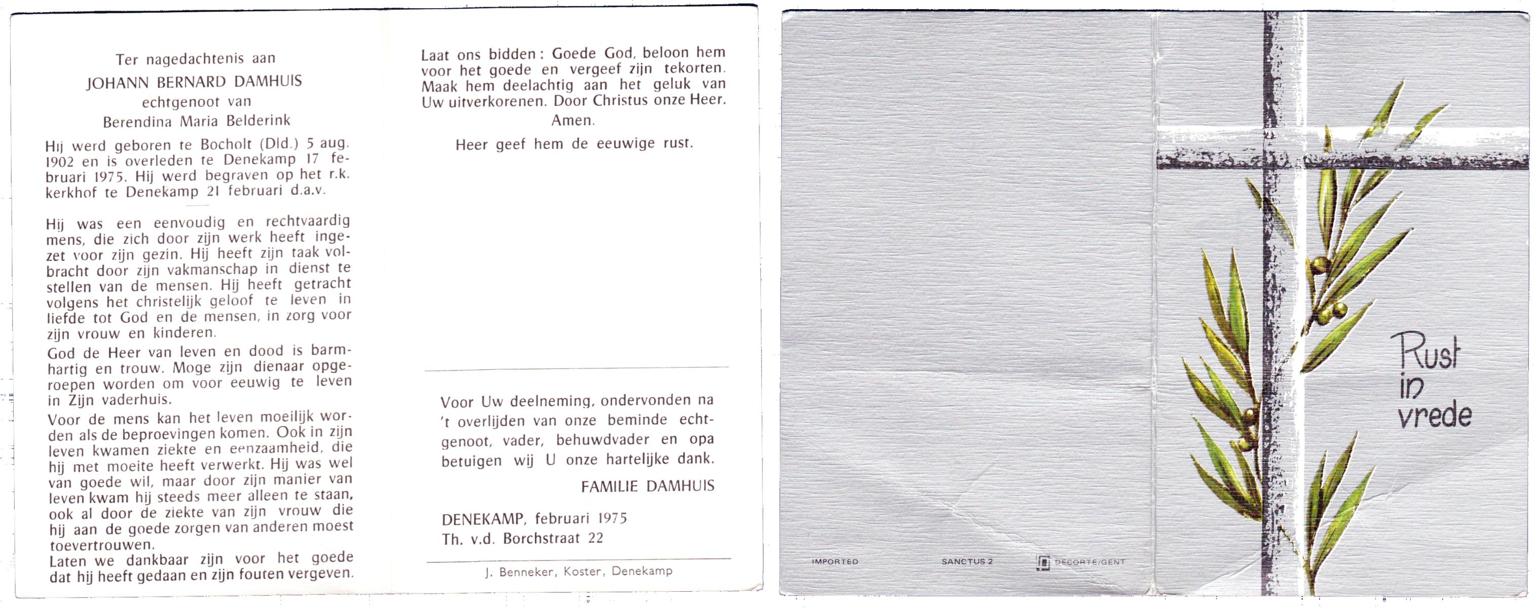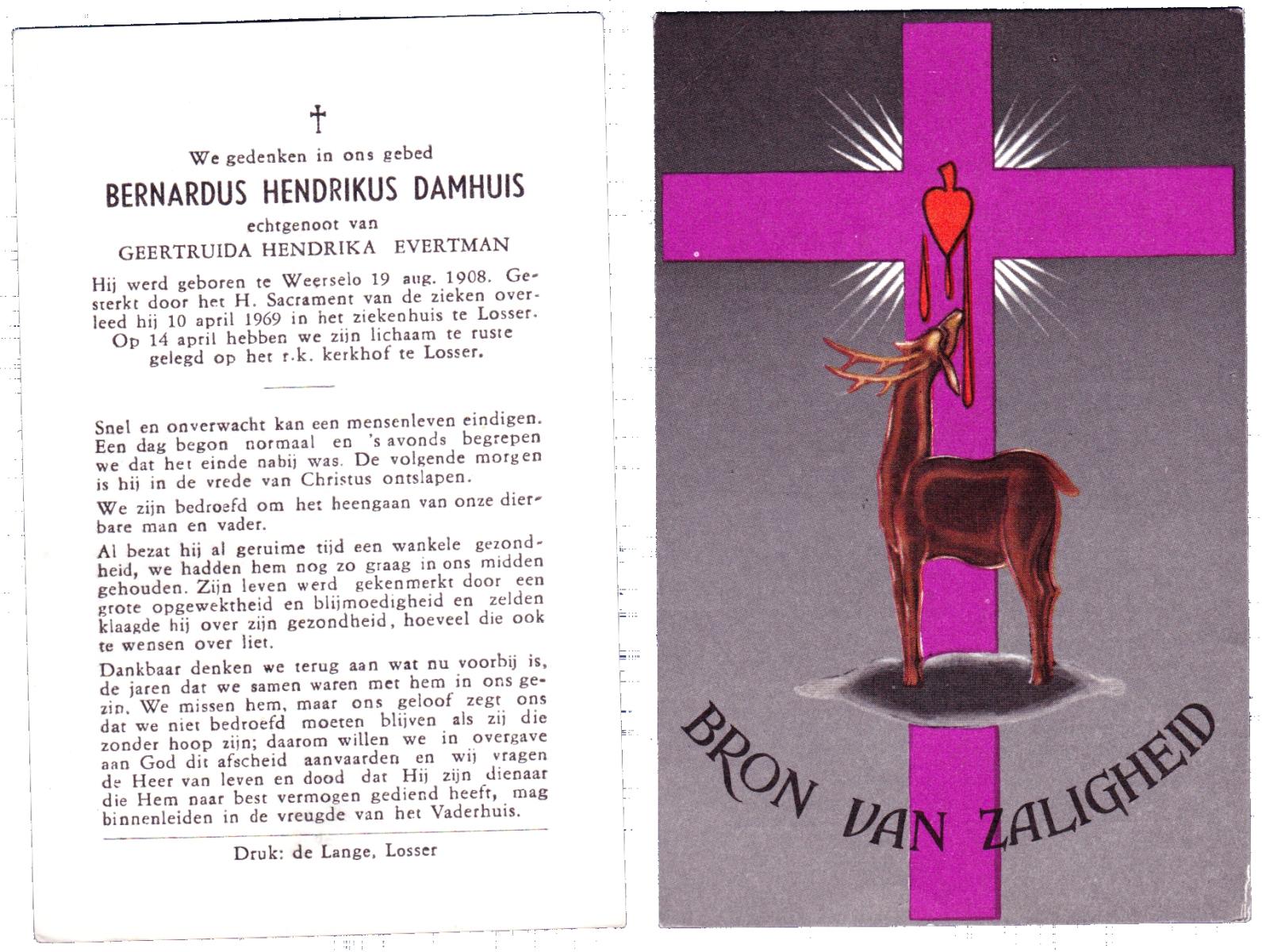 DAMHUIS, Bernardus Hendrikus, geboren op 19-8-1908 te Weerselo, overleden op 10-4-1969 te Losser op 60-jarige leeftijd, begraven op 14-4-1969 te Losser.