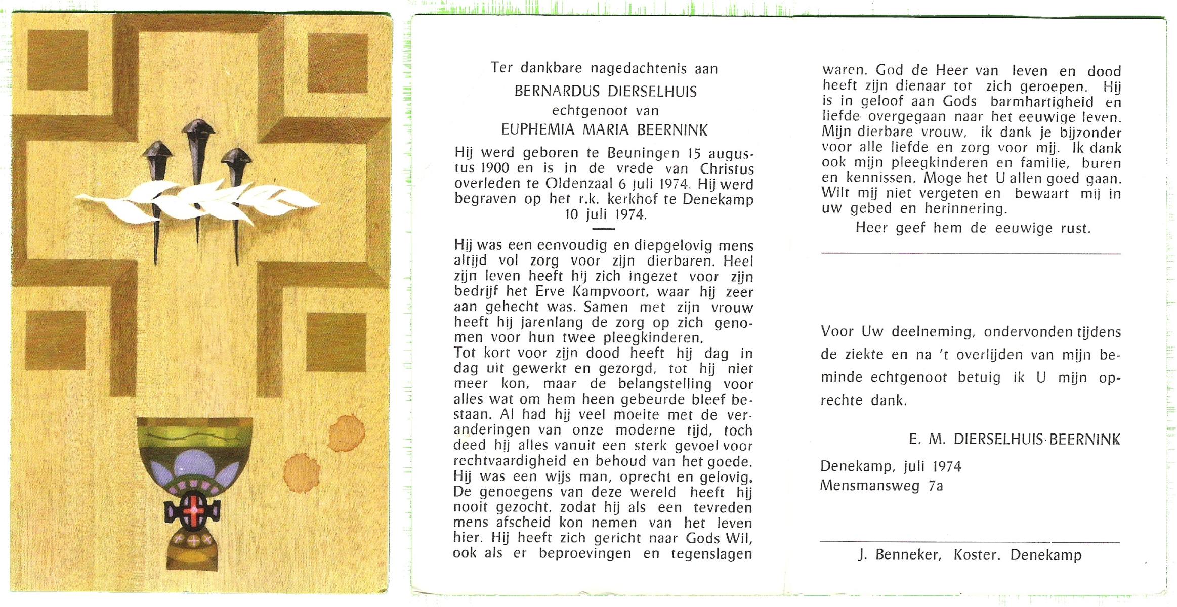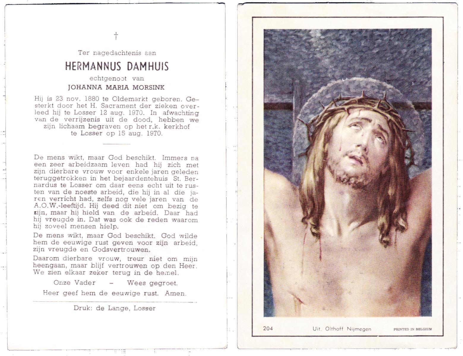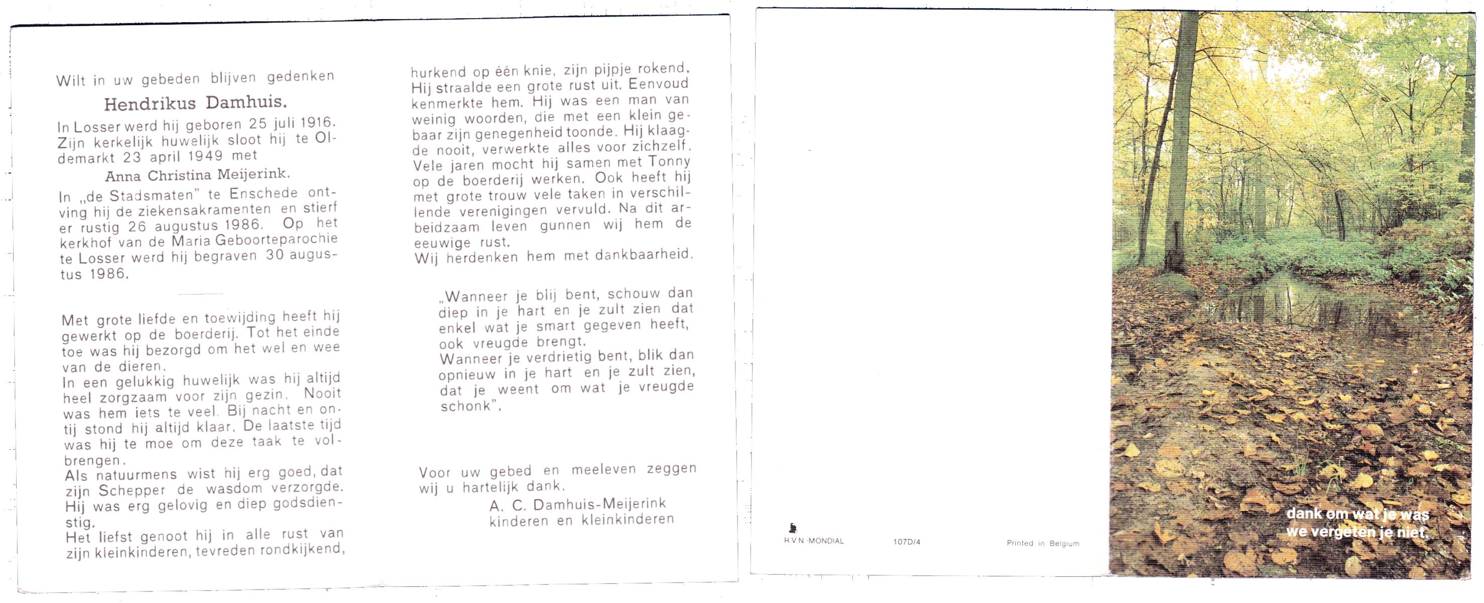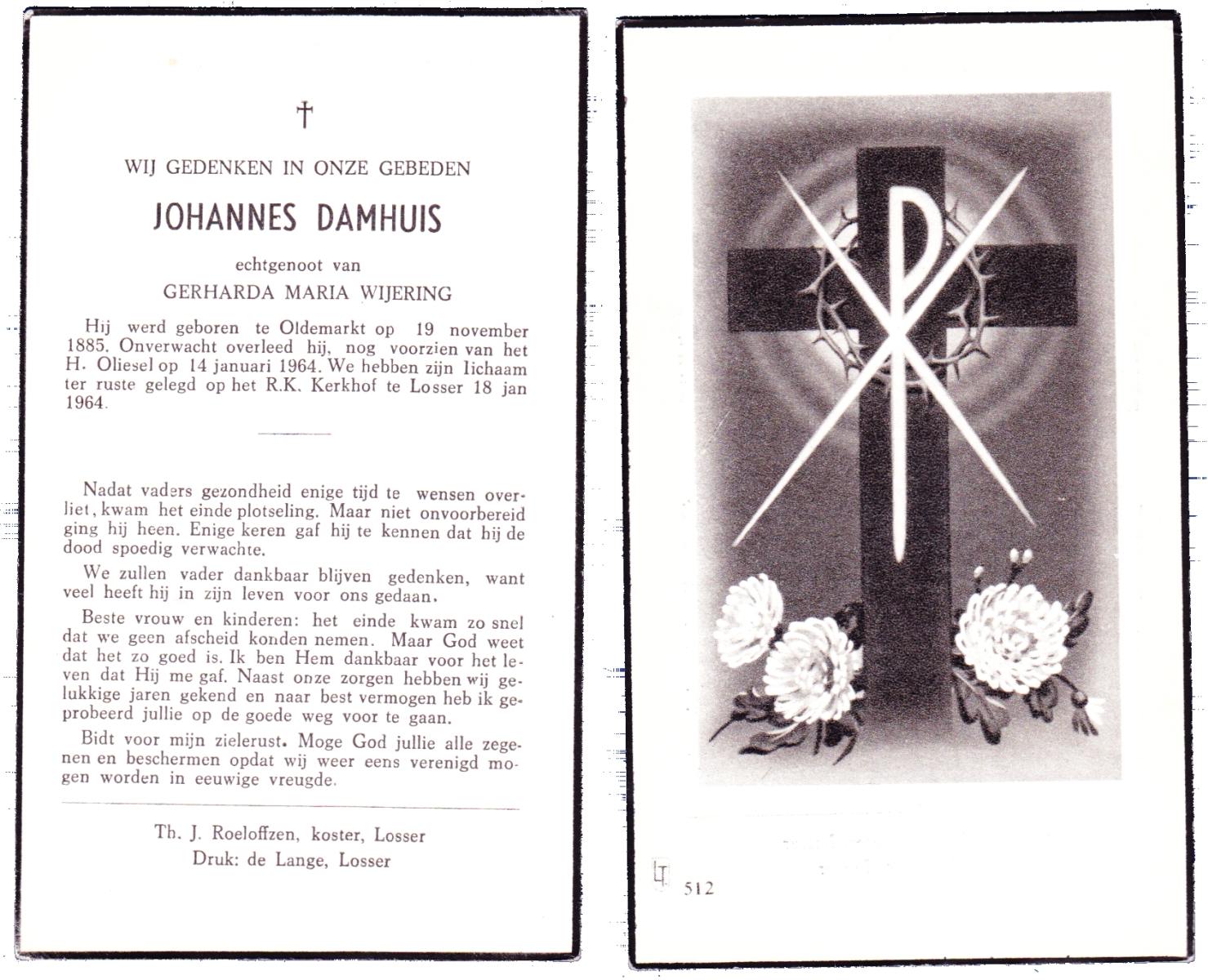 DAMHUIS, Bernardus Hendrikus, geboren op 19-8-1908 te Weerselo, overleden op 10-4-1969 te Losser op 60-jarige leeftijd, begraven op 14-4-1969 te Losser.